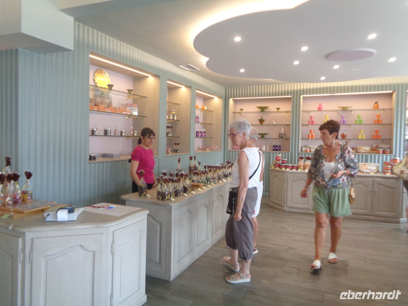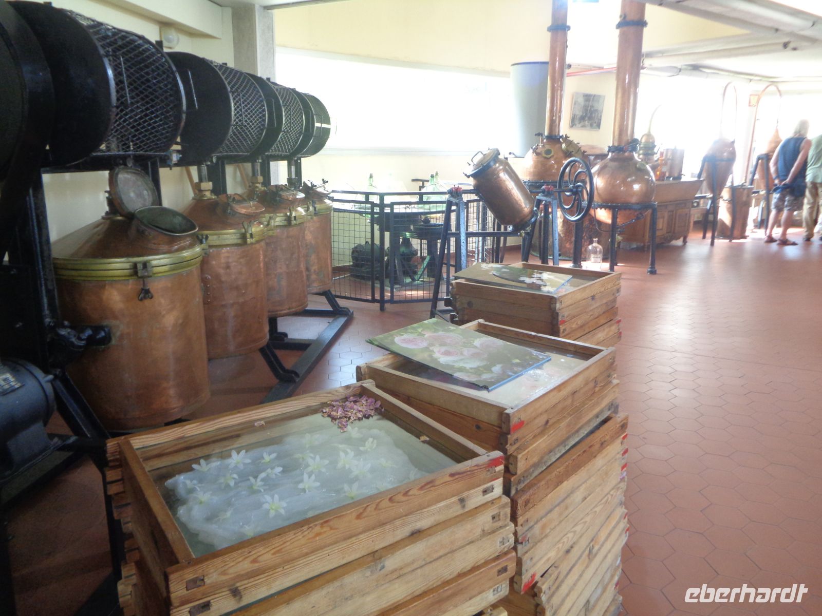 Hier kann man schwimmen, Tretboot fahren, Rudern, Tauchen und vieles mehr. Früher waren hier auch Busse willkommen, aber wir finden mit Mühe und Not einen Parkplatz. Dafür haben wir eine herrliche Aussicht auf das Esterelgebirge im unmittelbaren Hinterland der Côte d’Azur. Das gesamte Massif mit seinem roten Felsgestein erstreckt sich zwischen Cannes und Saint-Raphael, dabei ist der höchste Berg Mont Vinaigre nur 618 m hoch. Nach einer kurzen Rast fahren wir nach Grasse, der Stadt des Parfüms. Wir sind Gäste der Parfümerie Galimard und werden fachkundig in die Geheimnisse der Parfümherstellung eingeweiht.