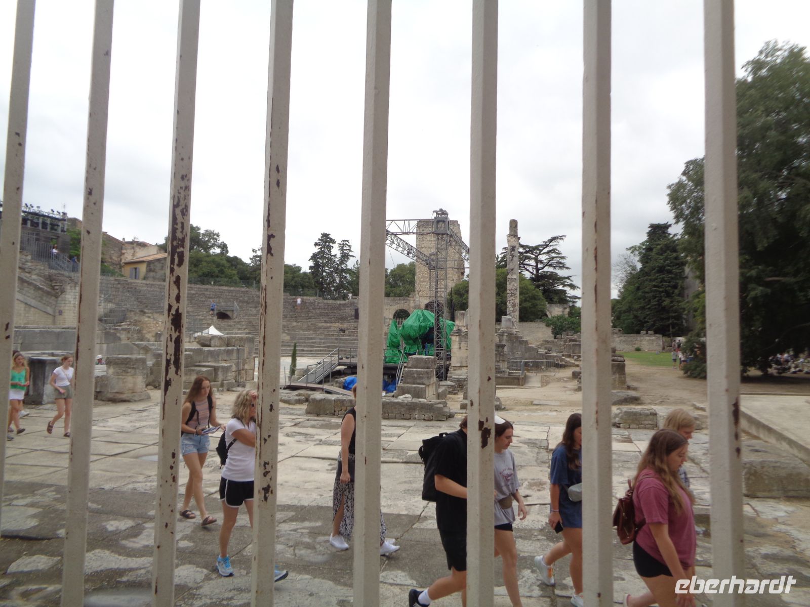 Heute können alle ausschlafen. Wir benötigen unseren Bus nicht, denn wir erkunden Arles zu Fuß. Vorbei am Antiken Museum und dem Garten der Begegnungen Jardin Hortus geht es entlang des Rhône-Ufers in die Stadt. Vom Quai de la Roquette aus biegen wir in die kleinen Gassen von Arles ein und treffen auf den Place du Forum. Den Platz überstrahlt das leuchtende Gelb des nachgebildeten Nachtcafés von Vincent van Gogh. Aber auch ein anderer Künstler prägt diesen beliebten Platz. Das Denkmal von Fréderic Mistral erinnert an den Poeten, der seine Werke auf provencalisch verfasste und den Nobelpreis für Literatur erhielt. Wir spazieren weiter zu den Arènes und zum Théâtre Antique daneben. Die Arena von Arles, die etwa 90 n.C. in 3 Etagen mit 60 Arkaden erbaut wurde und ungefähr 25.000 Besuchern Platz bot, ist ein Wahrzeichen der Stadt und erfreut sich noch heute großer Beliebtheit. Heute finden hier noch unblutige Stierkämpfe und Stierspiele statt, die ein Besuchermagnet sind. Ein weiteres beeinduckendes Bauwerk der Römer aus dem 1. Jhd. n.C. ist das Antike Römische Theater von Arles, das 40-30 v.C. von Kaiser Augustus begonnen wurde und 12 v.C. das erste Steintheater des Römischen Reiches war. Vorbild war das Marcellustheater in Rom.
