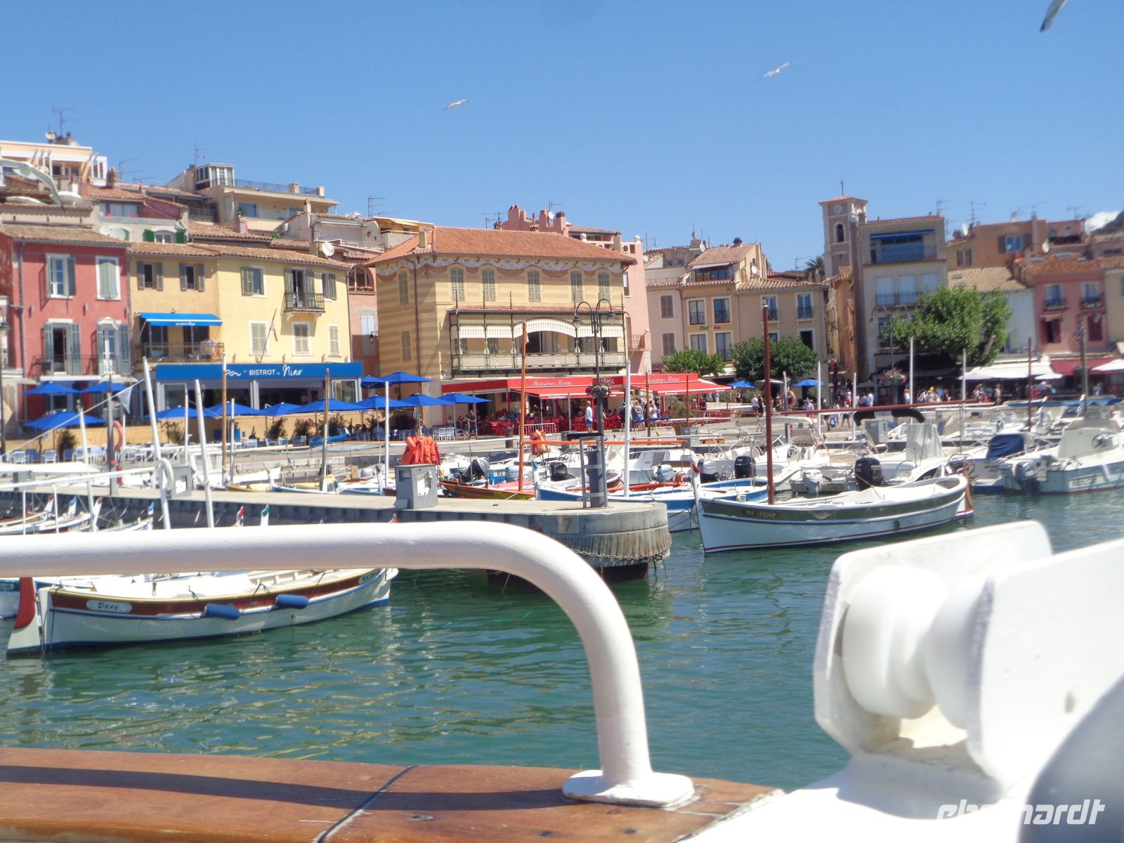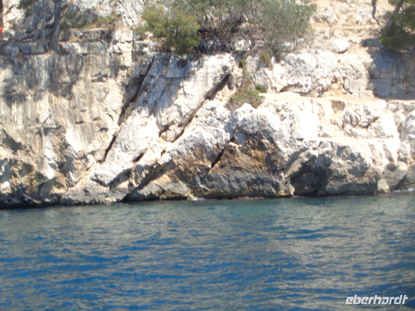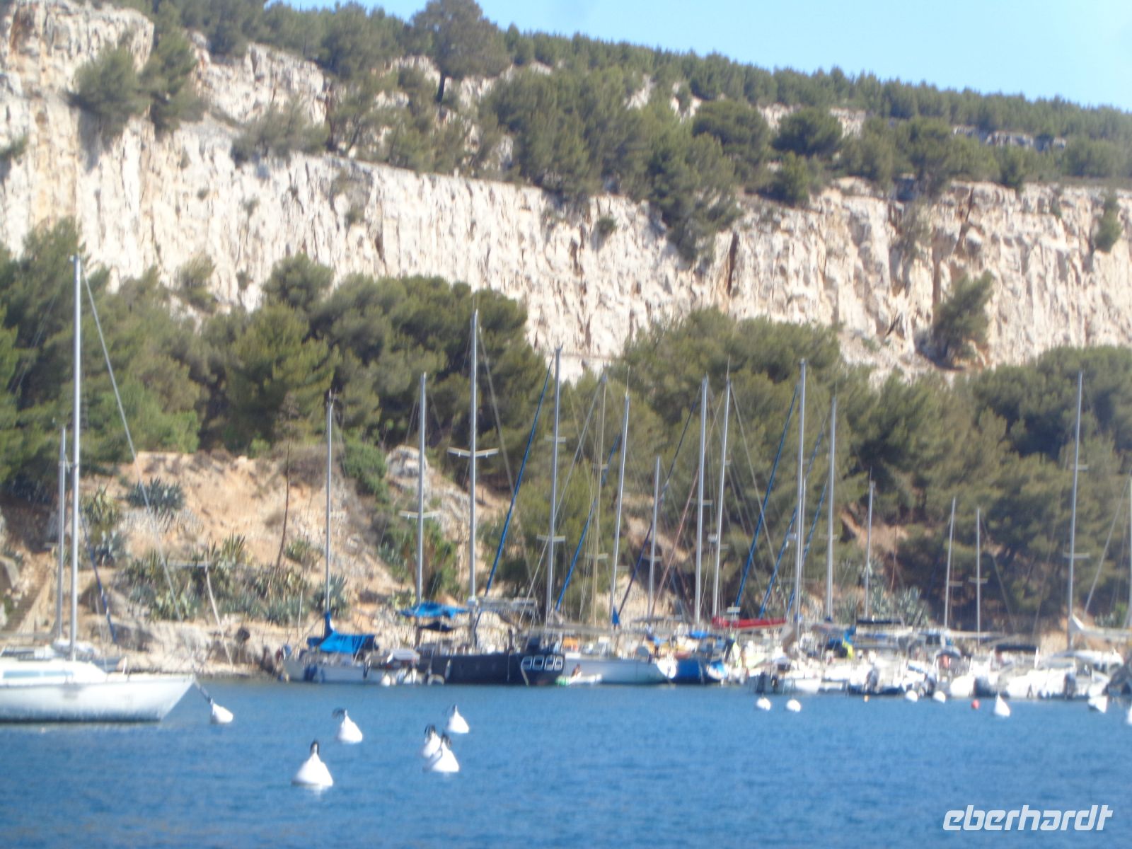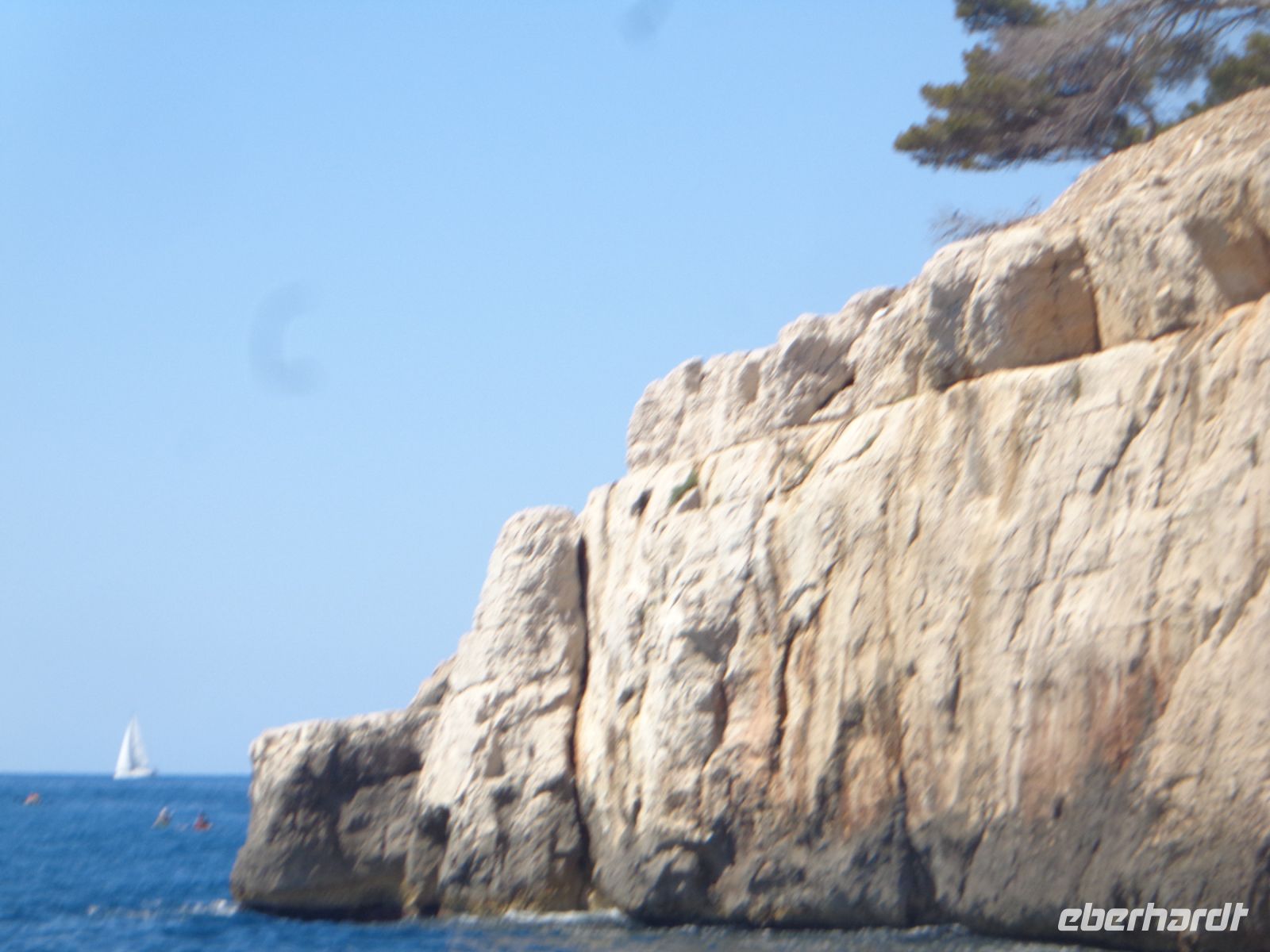 Nach dem Frühstück fahren wir knappe 2 Stunden nach Cassis. Hier wartet schon der Petit Train, der uns vom Busparkplatz zum kleinen Hafen fährt. Das Wetter ist wieder unbeschreiblich schön und nun hat sich die Mehrheit der Gruppe doch für eine Bootsfahrt zu den Calanques, einer Art südfranzösischer Fjorde, entschieden. Die Fahrt dauert ca. 45 min. und führt uns in 3 Calanques. Das Massiv der Calanques besteht aus einer 400 m dicken weißen Kalksteinschicht. Unter Wasser gibt es Täler und Unterwasserquellen.
