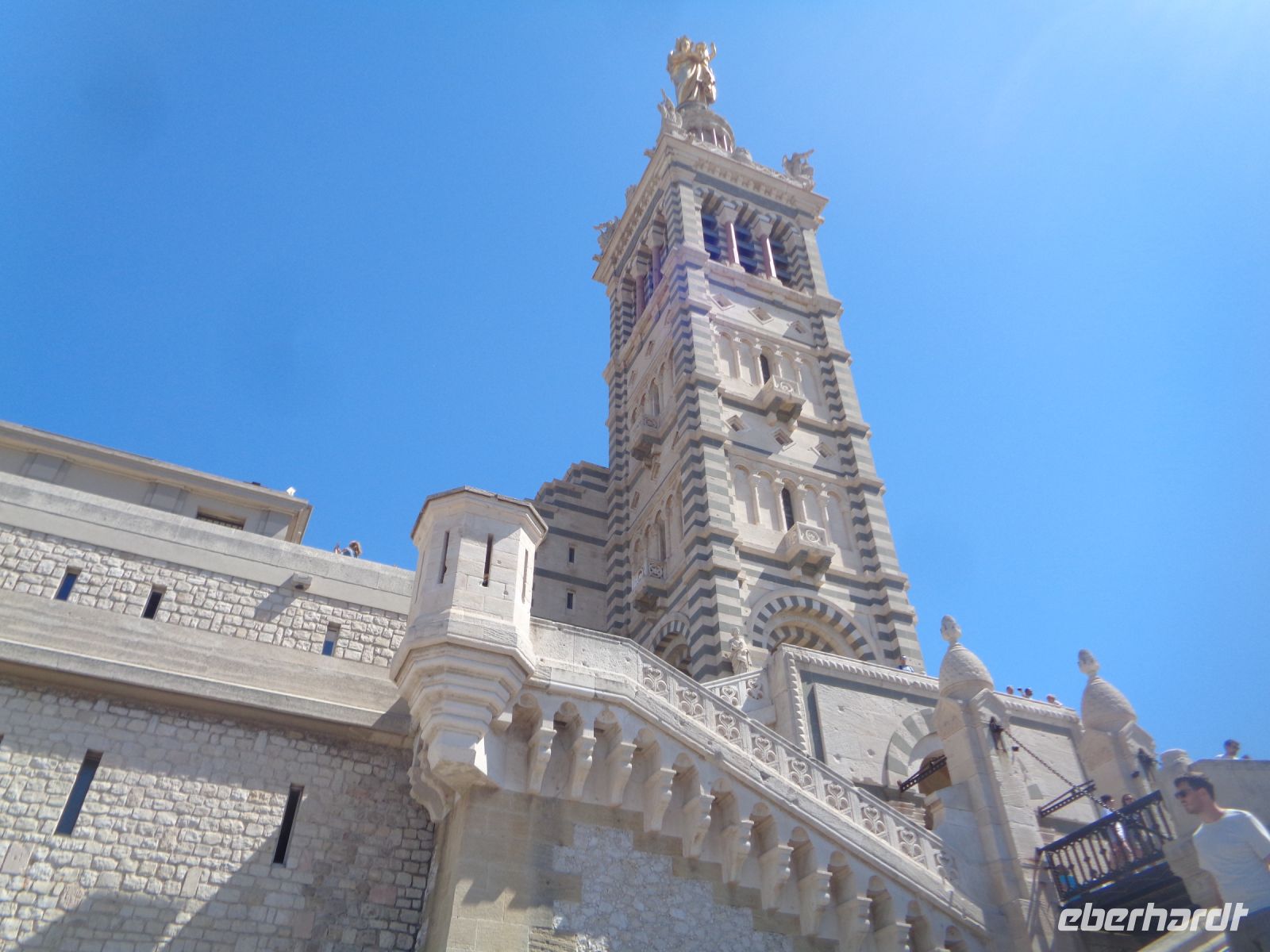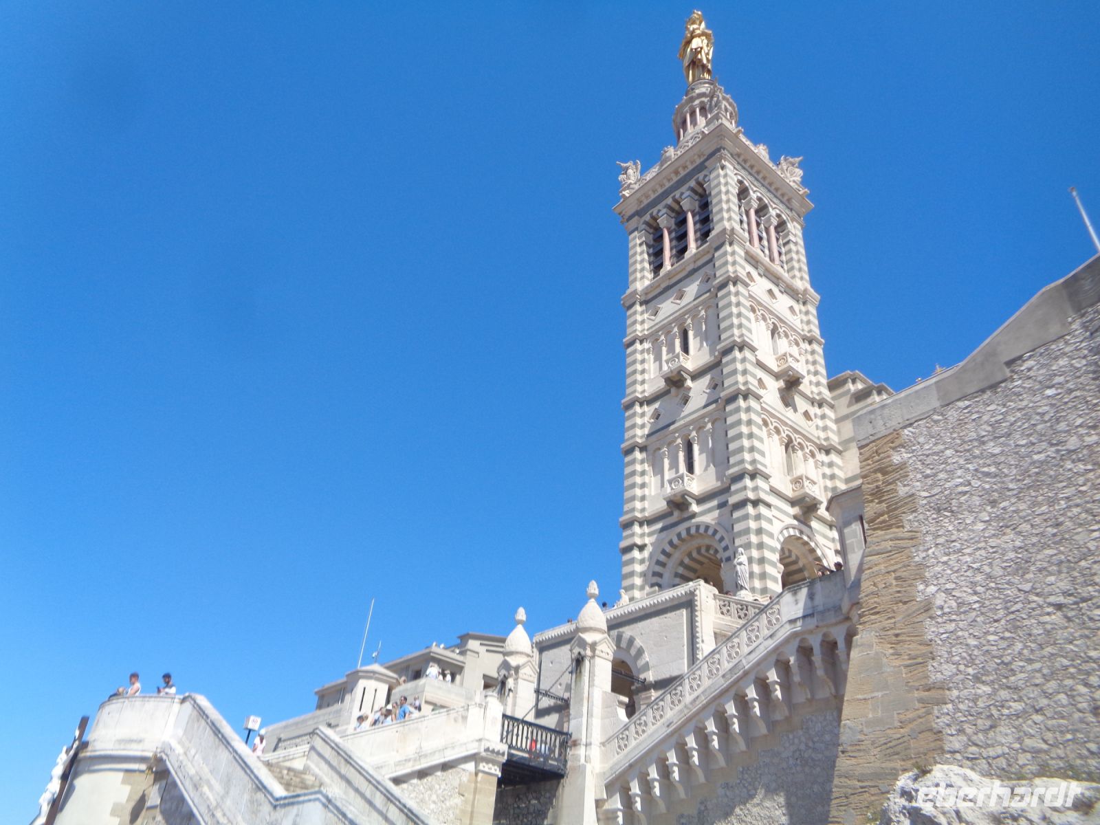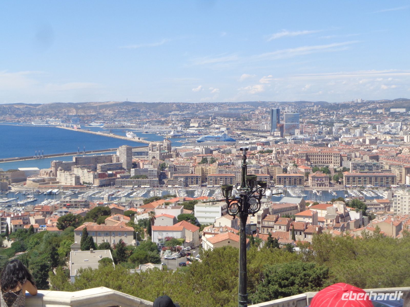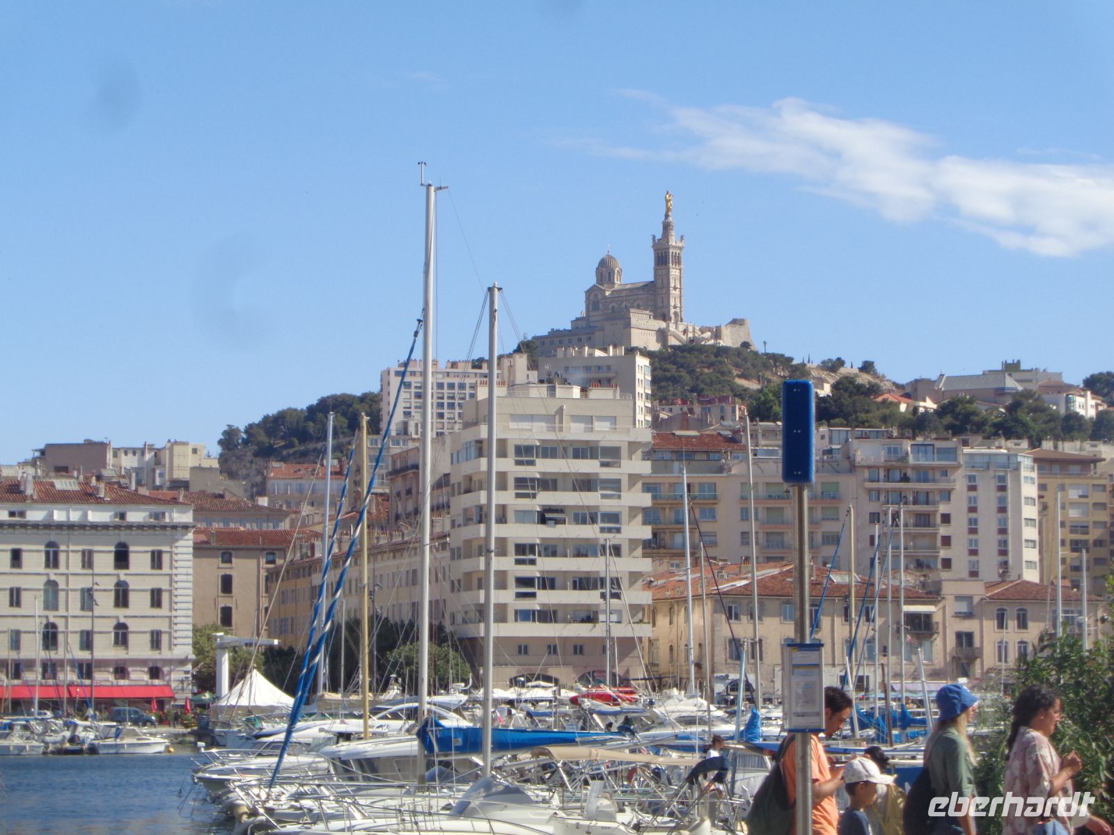 Unser nächstes Ziel ist Marseille. Schon unterwegs kontaktieren wir unsere Stadtführerin Elodie Marie, die wie vereinbart am Hôtel de Ville auf uns wartet. Sie steigt zu uns in den Bus und wir begeben uns sofort auf unsere Stadtrundfahrt. Vorbei an dem kleinen Badestrand und der Insel mit dem Chateau d’If fahren wir hinauf zur Notre-Dame-de-la-Garde. König Franz I. wollte im 16. Jhd. die strategische Lage nutzen, baute ein