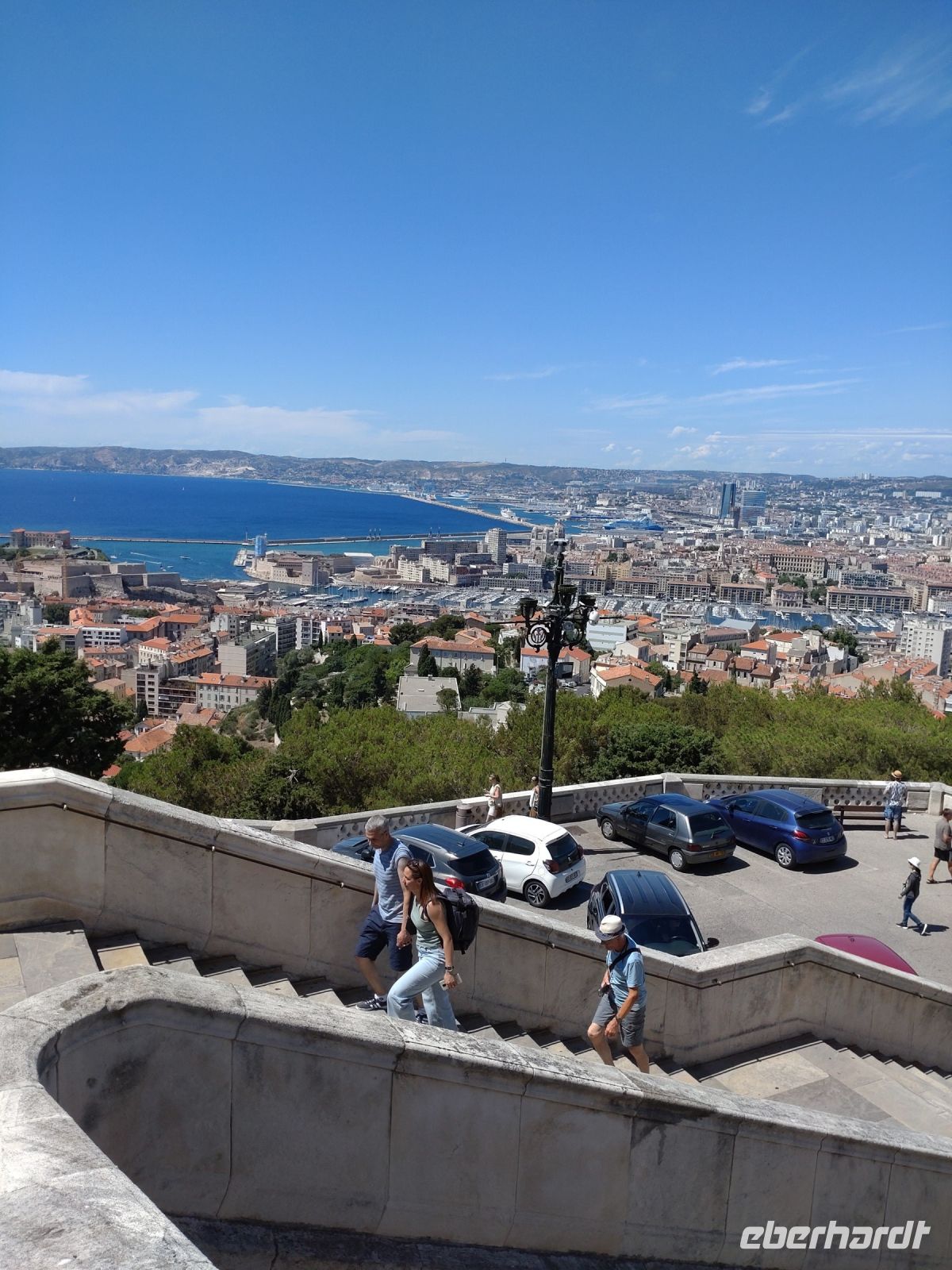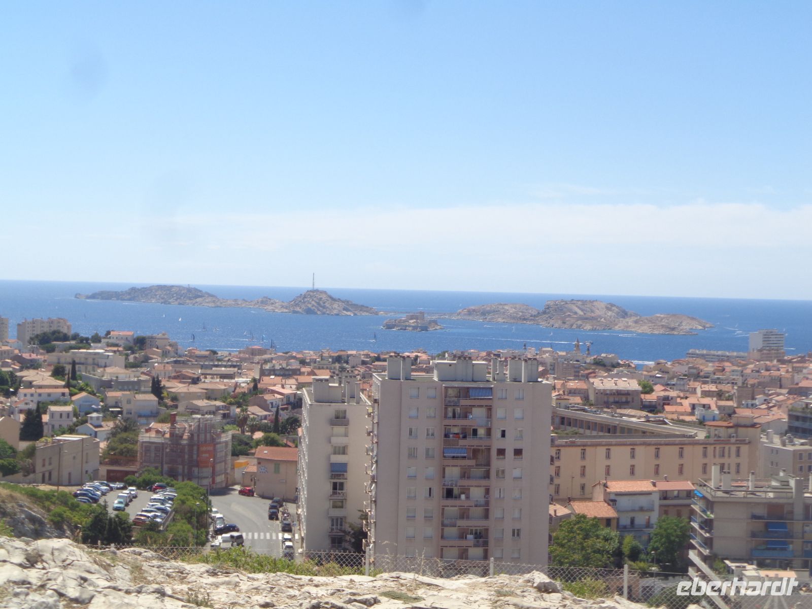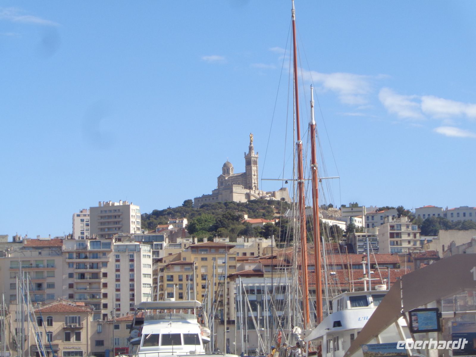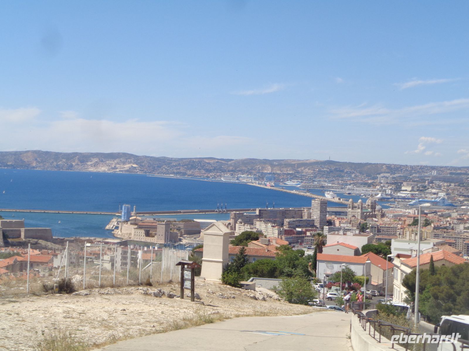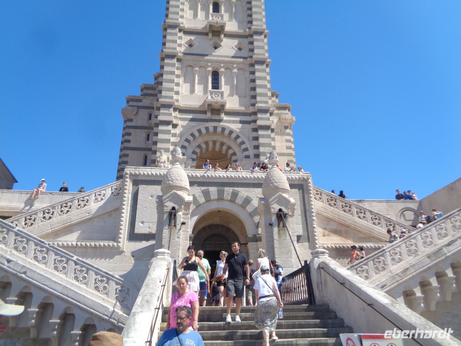 Unser nächstes Ziel ist Marseille. Schon unterwegs kontaktieren wir unsere Stadtführerin Elodie Marie, die wie vereinbart am Hôtel de Ville auf uns wartet. Sie steigt zu uns in den Bus und wir begeben uns sofort auf unsere Stadtrundfahrt. Vorbei an dem kleinen Badestrand und der Insel mit dem Chateau d’If fahren wir hinauf zur Notre-Dame-de-la-Garde. König Franz I. wollte im 16. Jhd. die strategische Lage nutzen, baute ein