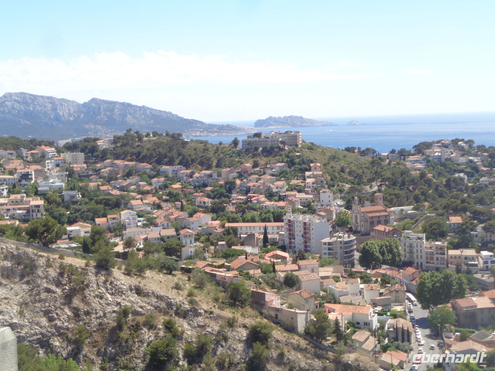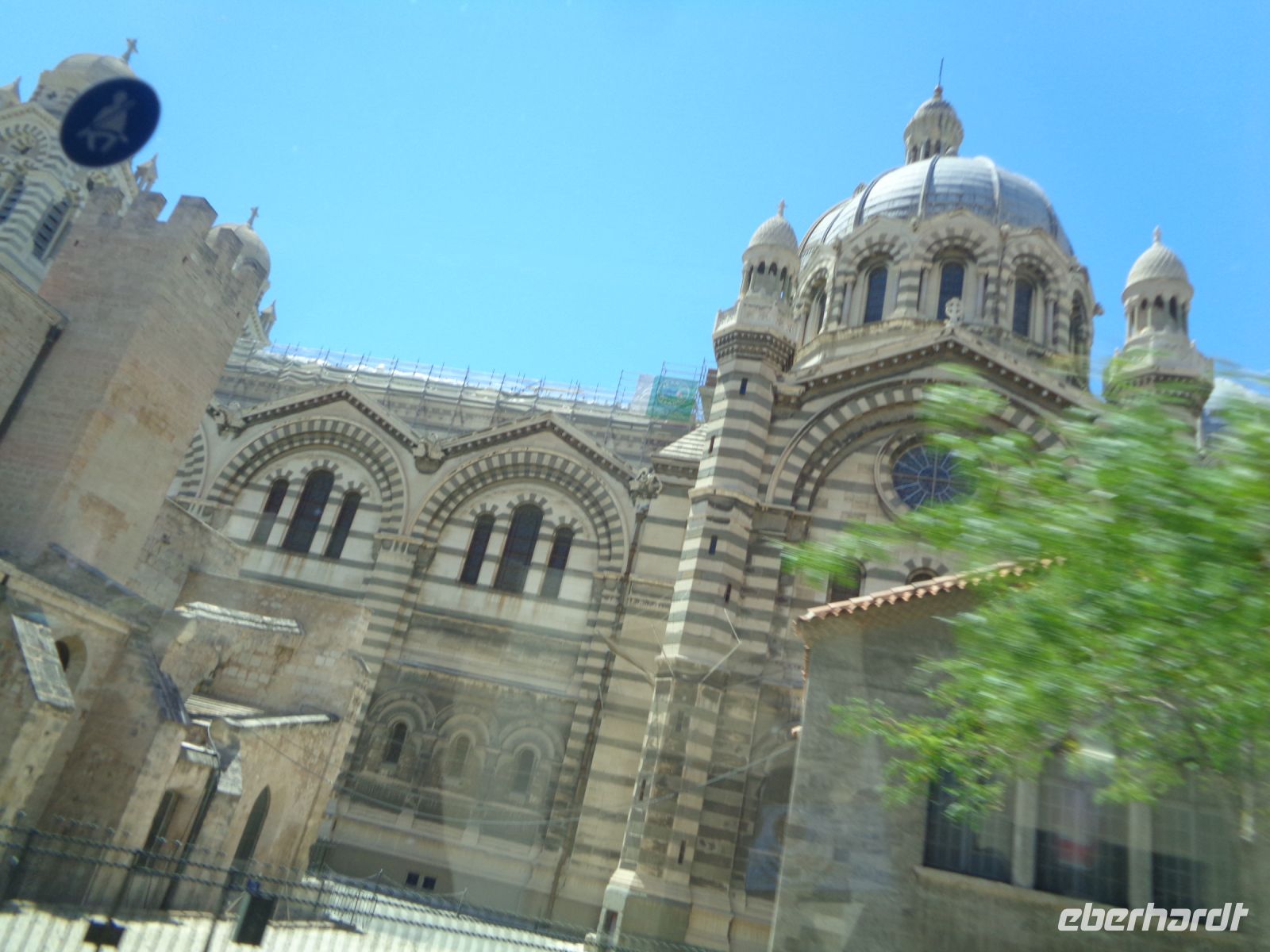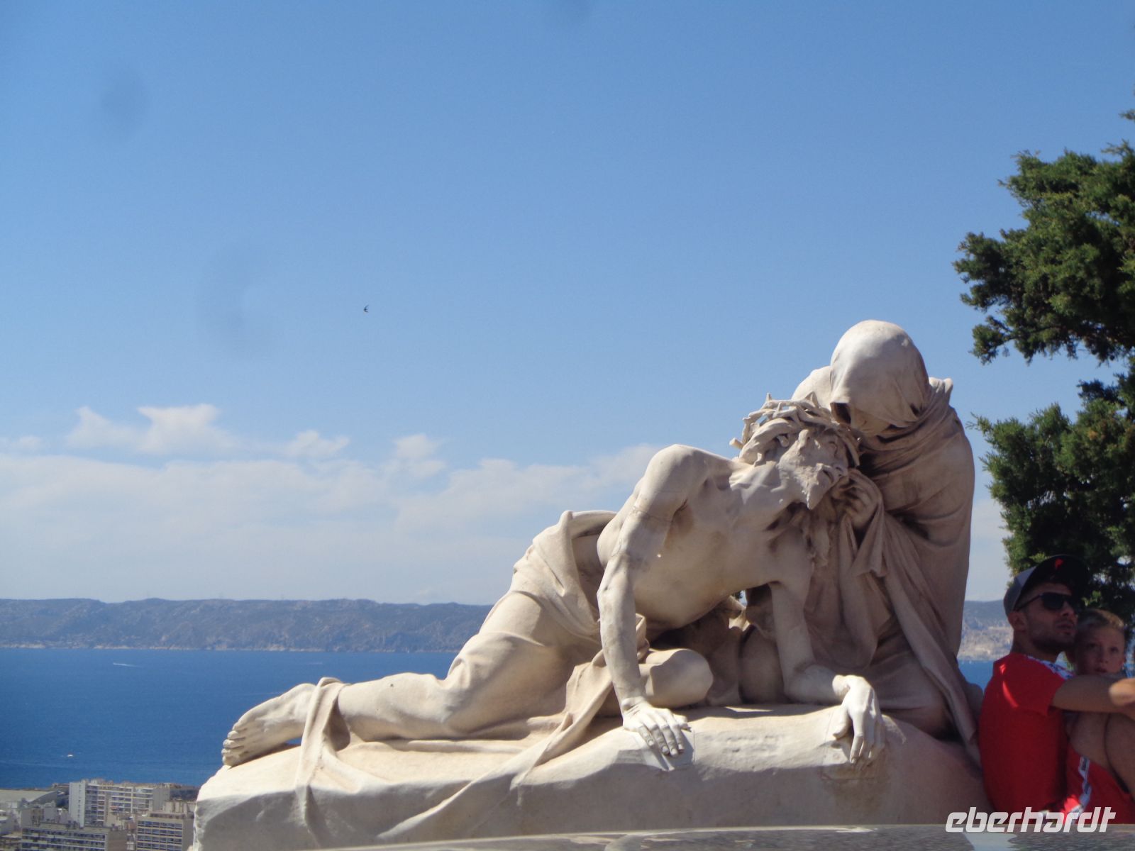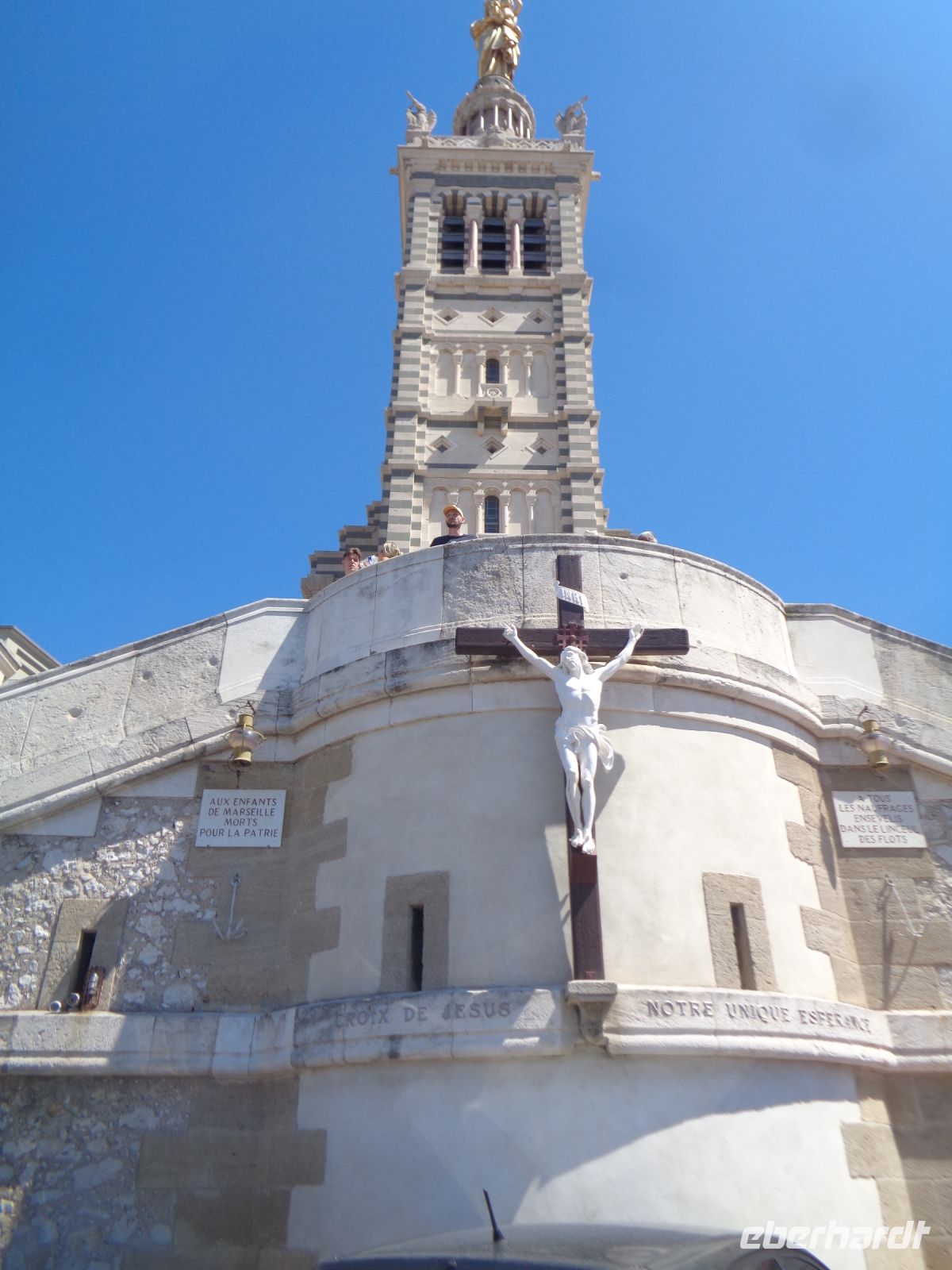 Unser nächstes Ziel ist Marseille. Schon unterwegs kontaktieren wir unsere Stadtführerin Elodie Marie, die wie vereinbart am Hôtel de Ville auf uns wartet. Sie steigt zu uns in den Bus und wir begeben uns sofort auf unsere Stadtrundfahrt. Vorbei an dem kleinen Badestrand und der Insel mit dem Chateau d’If fahren wir hinauf zur Notre-Dame-de-la-Garde. König Franz I. wollte im 16. Jhd. die strategische Lage nutzen, baute ein
