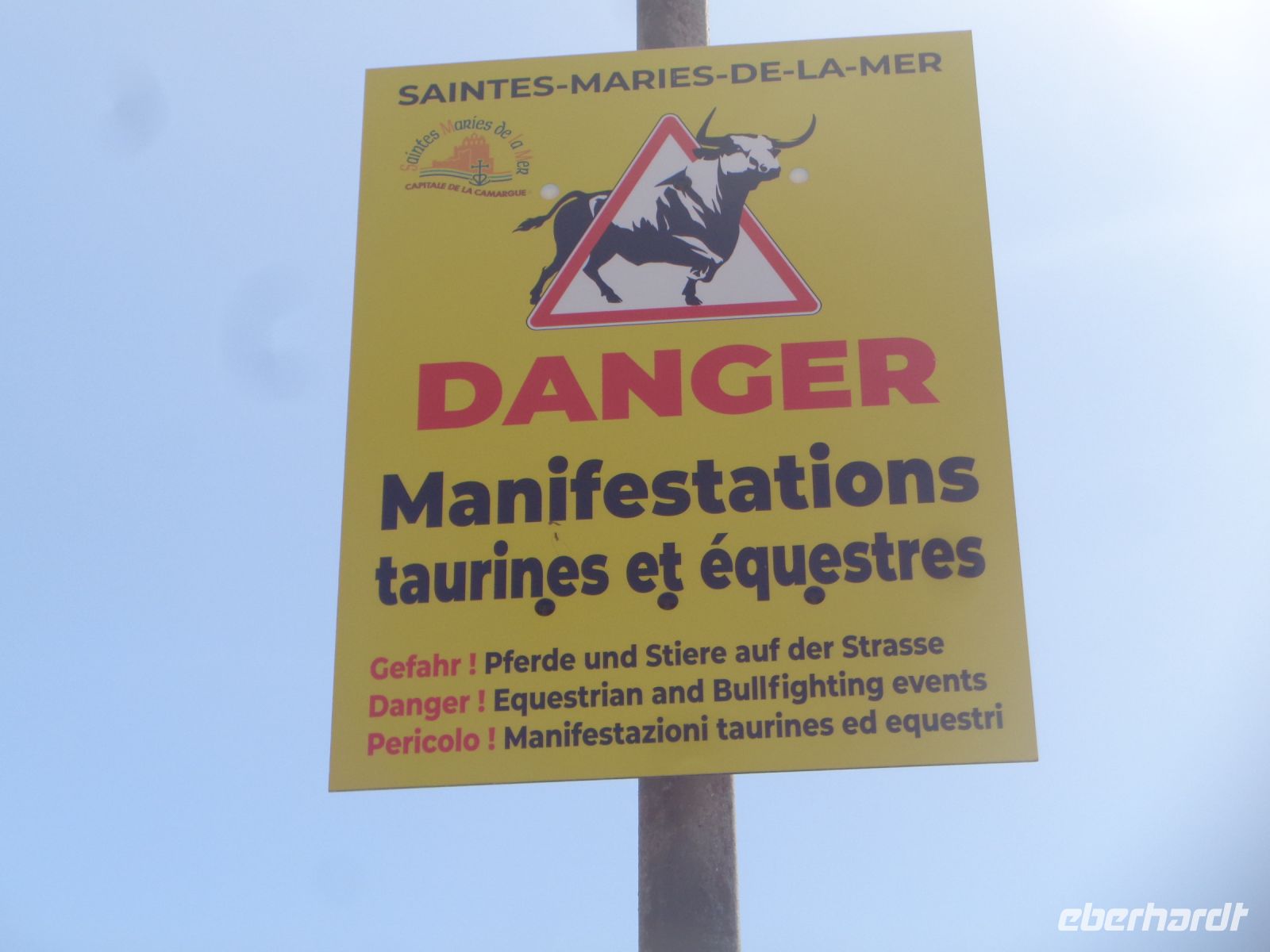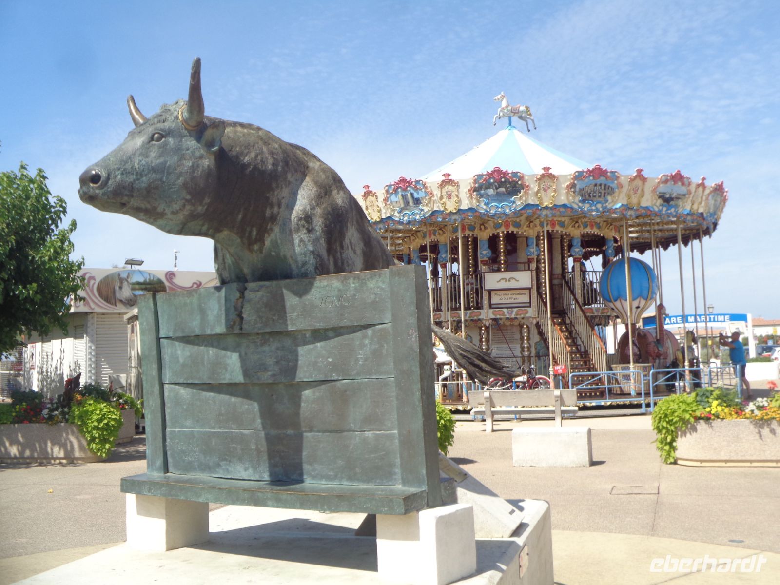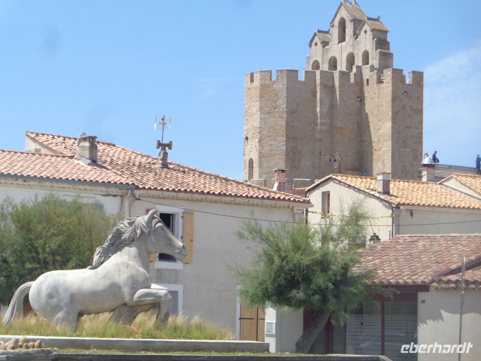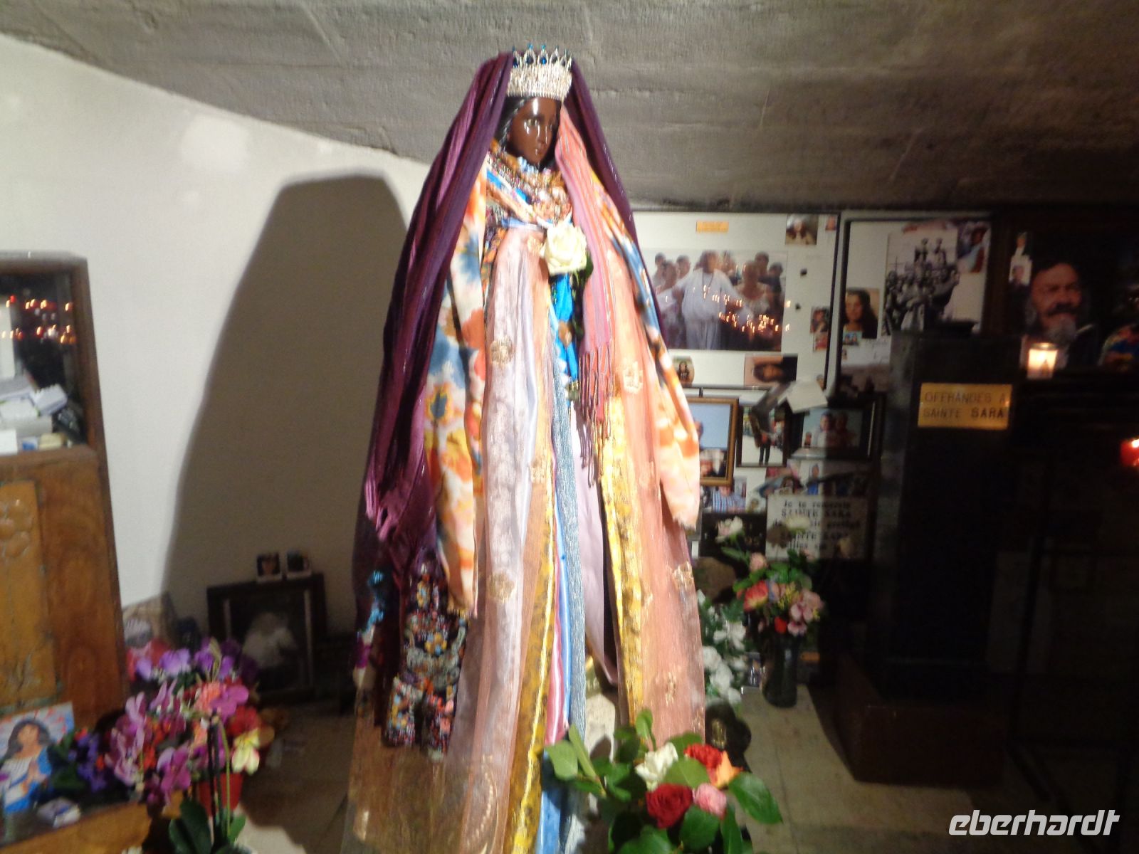 Er bietet Lebensraum und Nistgebiet für viele Zugvögel und die typischen Rosaflamingos. Wie im Bilderbuch sehen wir auch weiße Pferde, schwarze Stiere, Störche, Fischreiher, Kormorane und viele mehr, bevor wir im Wallfahrtsort Saintes-Maries-de-la-Mer ankommen. Die Kirche ist geschlossen, aber ab Mittag kann man die Heilige Sara besuchen. Sie ist das Zentrum des Wallfahrtsortes der Zigeuner, die hier ihre Schutzpatronin Sara verehren. Die schwarze Sara soll die Dienerin der Maria Jacobé und Maria Salomé gewesen sein und ist keine schwarze Madonna. Die Marien kamen in einer ruderlosen Barke hier an Land, um das Christentum zu verkünden, sagt man. Im Ort gibt es jährlich Ende Mai Feste der Gitanes. Beliebt sind auch die Stierrennen durch den Ort und viele kulturelle Ereignisse.