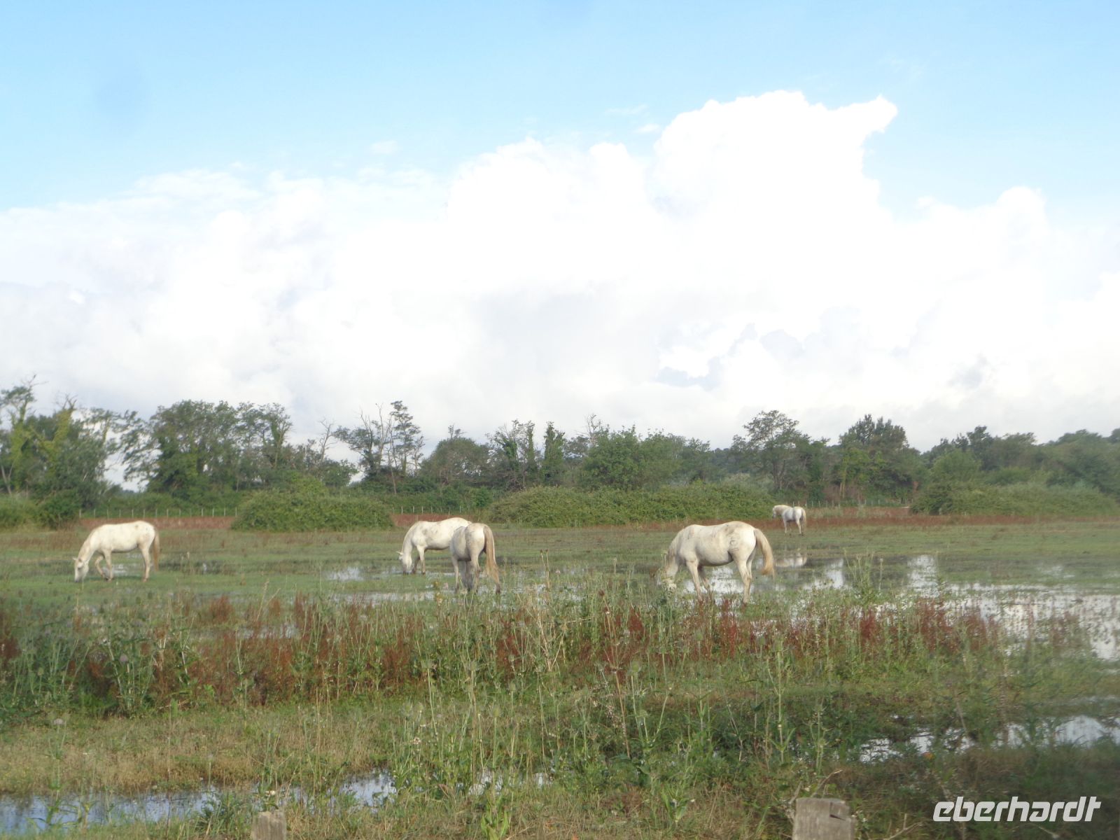 Heute haben wir ein Geburtstagskind an Bord und beginnen den Tag mit einem fröhlichen Geburtstagsständchen. Heute wollen wir die sagenumwobene Camargue erkunden. Wir fahren zunächst zu den Salzfeldern der Salin-de-Giraud. Die Landschaft erscheint öde, aber faszinierend. Nach einem ausführlichen Fotostopp geht es weiter zum Étang de Vaccarès, einem flachen salzigen Strandsee, der durchschnittlich nur 50 cm Tiefe hat, selten mehr als 2 m. Der Kern der Camargue befindet sich zwischen der großen und der kleinen Rhône, die sich scheinbar unendlich im großen Delta verzweigen, das in das Mittelmeer mündet.