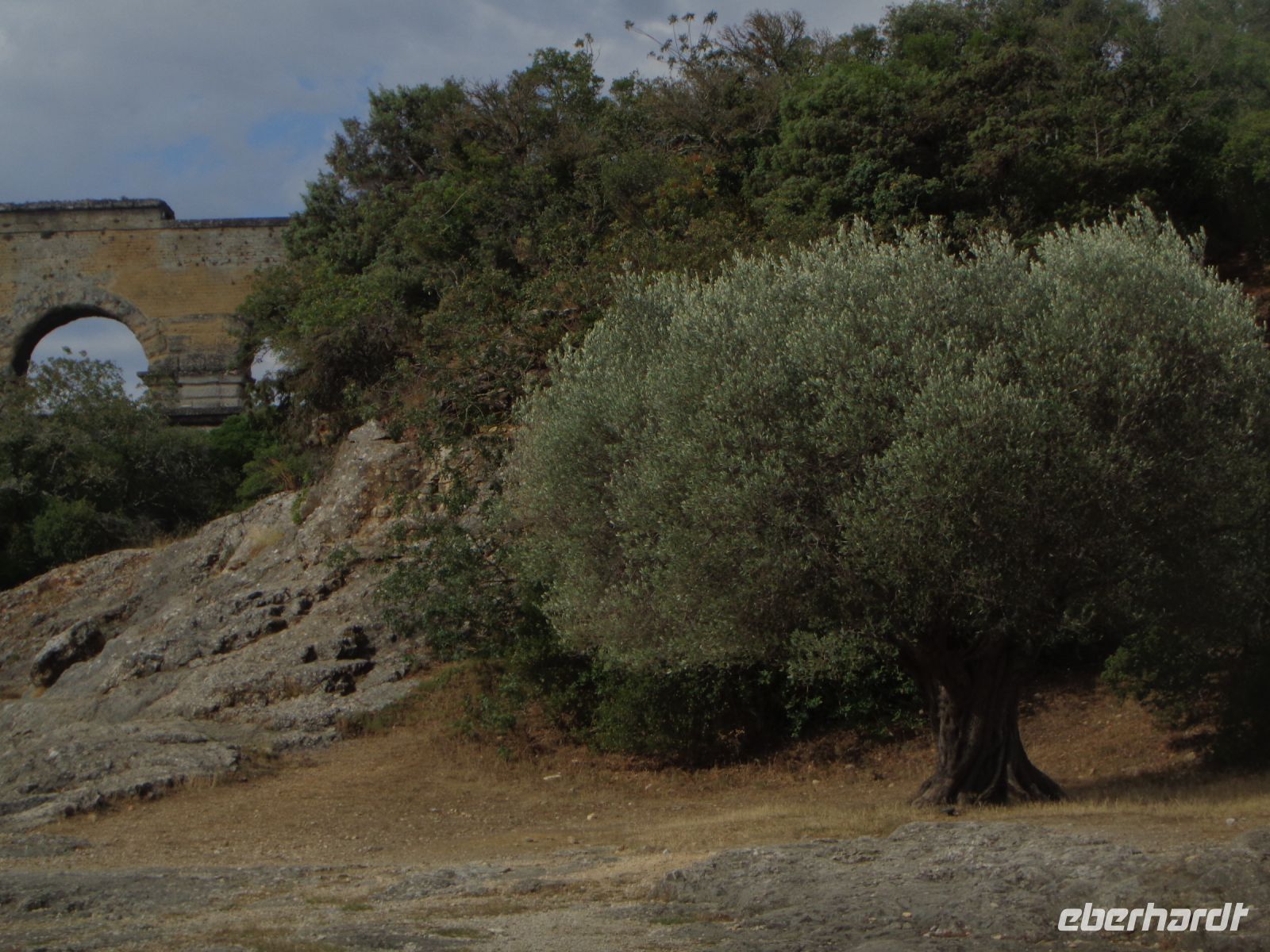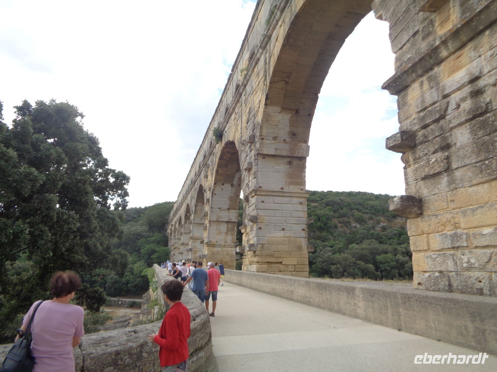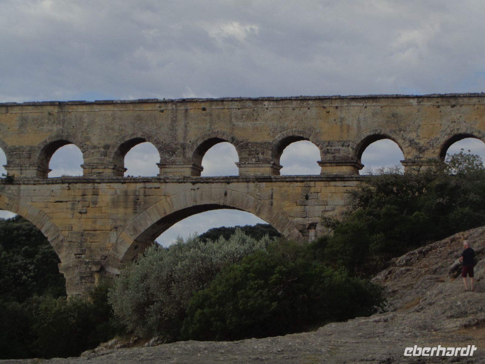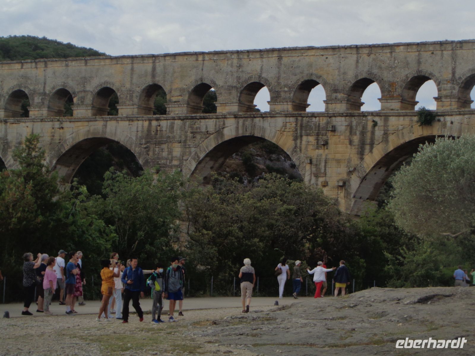 Heute fahren wir mit gepackten Koffern, denn unsere Reise neigt sich dem Ende zu. Erstes Ziel ist die Pont-du-Gard. Die höchste Aquäduktbrücke der Welt, von den Römern in nur 5 Jahren mit einfachen technischen Hilfsmitteln erbaut, versorgte die Stadt Nîmes vor fast 2000 Jahren mit Wasser. Ihre Ausmaße sind gigantisch und ihre 3 Ebenen erheben sich 49 m über dem Fluss Gardon. Sie verbindet beide Seiten über 275 m.