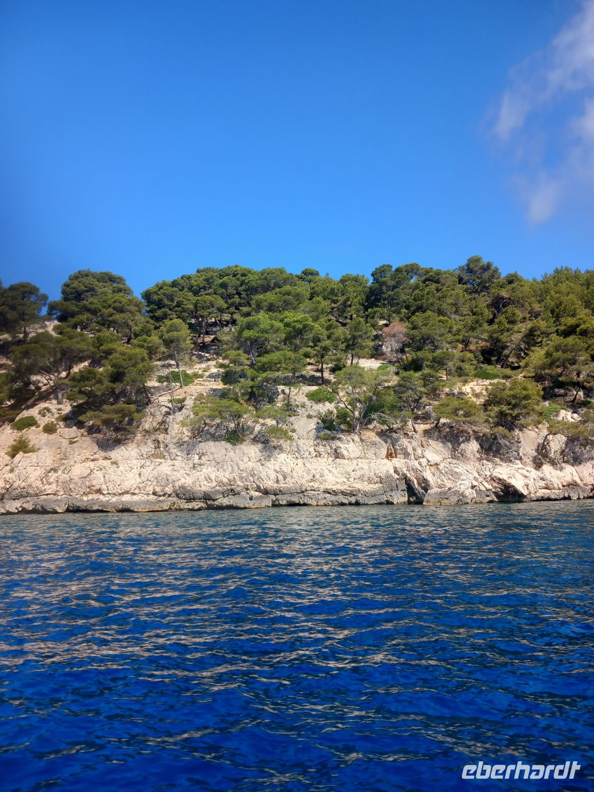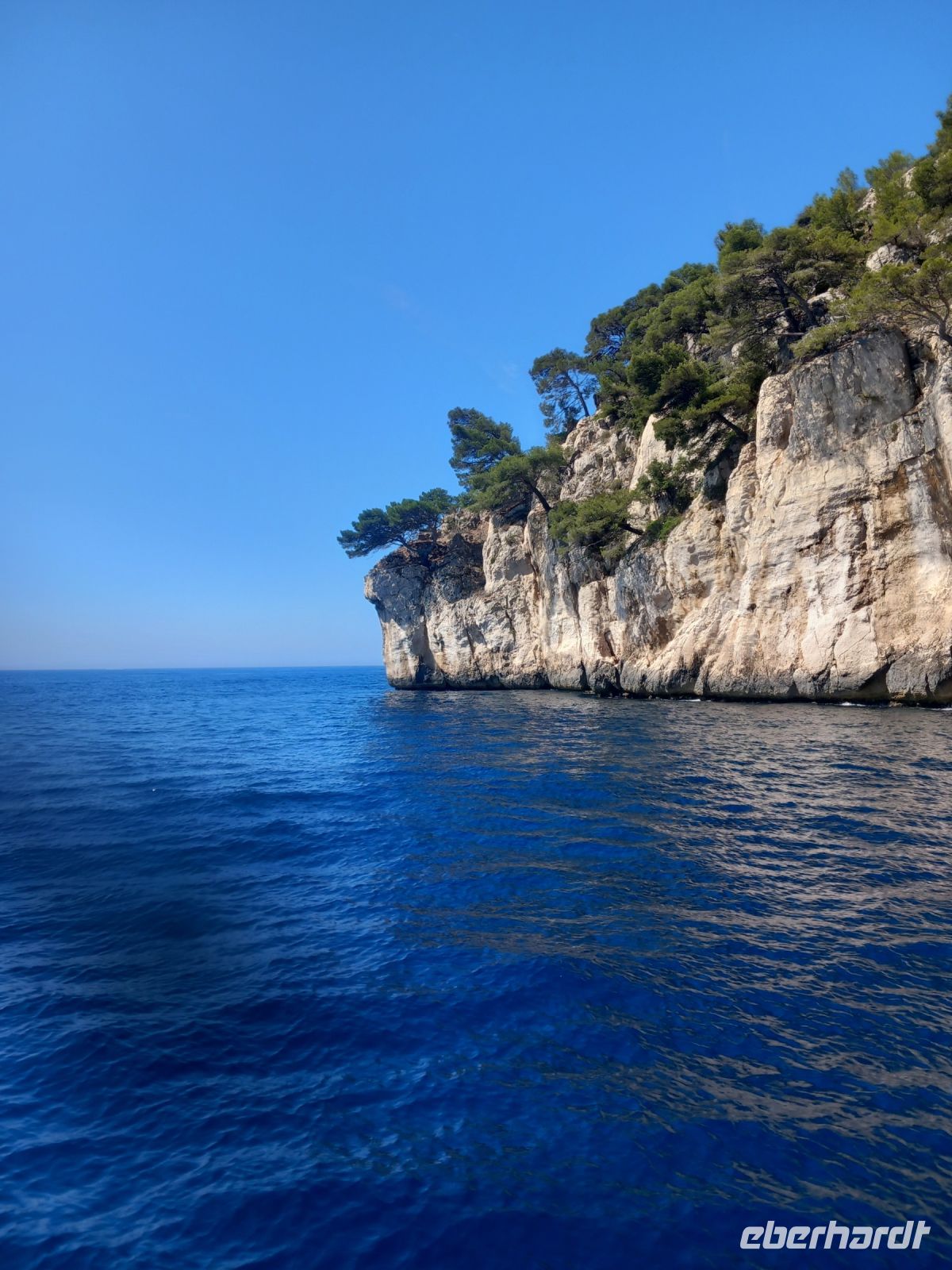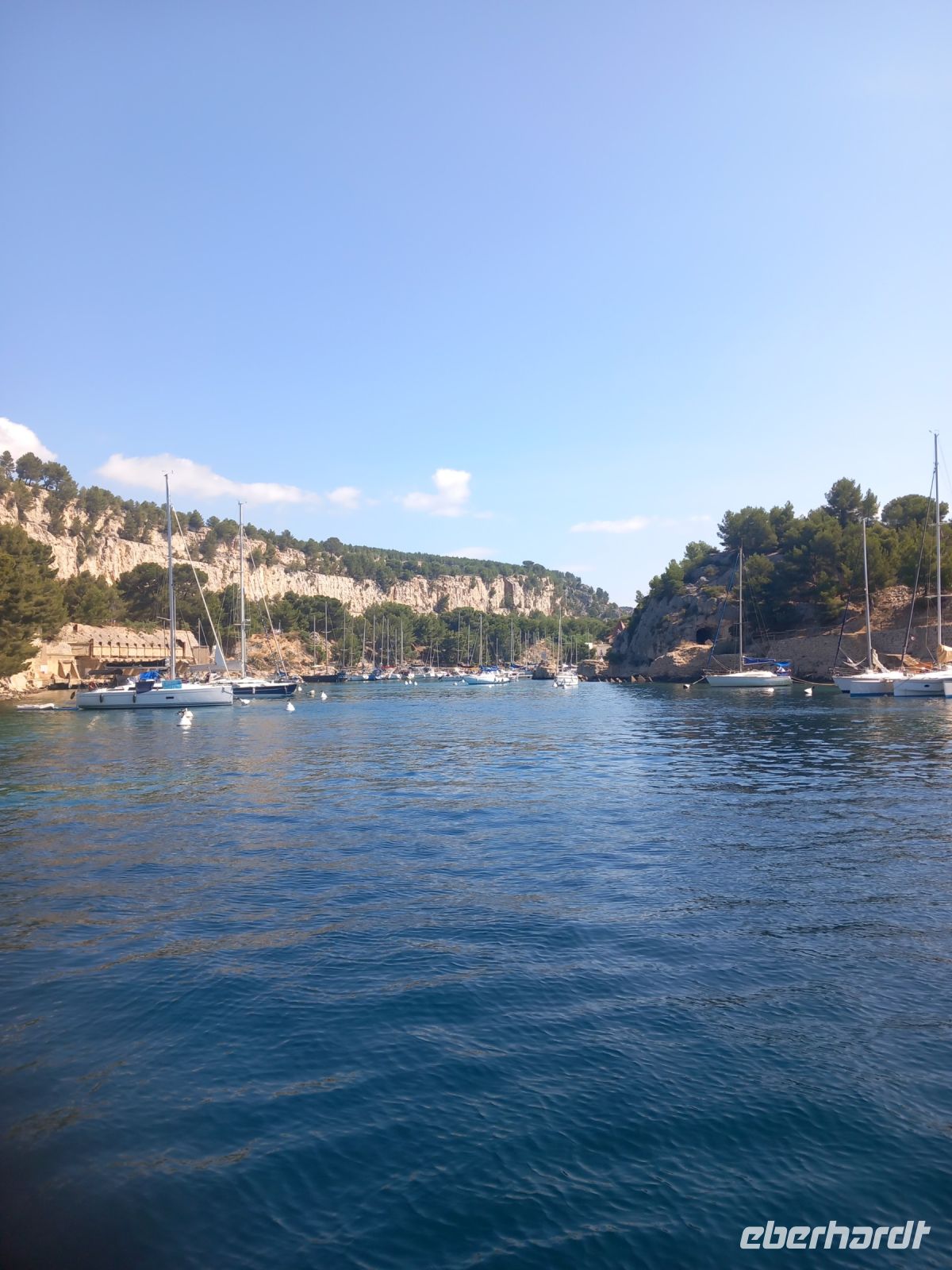 Mit dem Petit-Train fuhren wir hinab zum Hafen nach Cassis. Vom verschlafenen einstigen Fischerdorf sind die Gebäude im besten Zustand noch vorhanden, aber die Stimmung ist pulsierend, zumal an diesem Tag ein wunderschöner Markt im Zentrum war. Aber vor dem Markt ging es zunächst auf das Boot. Und unser sprachgewandter Begleiter darauf ließ keinen Zweifel an seiner Feststellung, den schönsten Arbeitsplatz der Welt zu haben. Glasklares Wasser, spektakuläre Felsen, in die sich die Pinien geradezu hineinfressen. Das ist keine Übertreibung, wir haben gelernt, dass sich die Pinien ihre Mineralien aus dem Fels holen. Und ein kleiner Fjord nach dem anderen, eine Bucht schöner wie die andere.