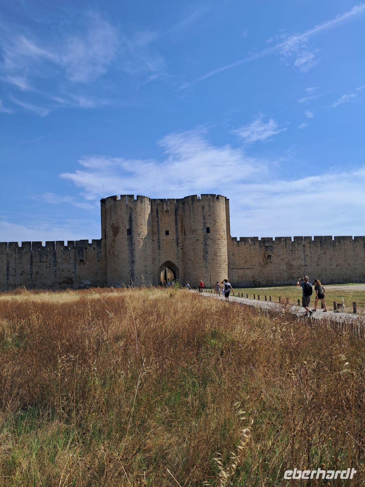 Zunächst fuhren wir nach Aigues Mortes, einer mittelalterlichen Stadt gelegen am Kanal von der Rhone nach Sete. Der Kanal wurde erst später wichtig. Aigues Mortes war im Mittelalter eine Hafenstadt, die durch das Schwemmgut der Rhone im Laufe der Zeit vom Mittelmeer getrennt wurde. Das ermöglichte letztlich, dem Meer Salz abzugewinnen, wodurch durch die Stadt reich wurde und sich eine bis heute einzigartige und intakte Stadtmauer leisten konnte. Von der Stadtmauer aus hat man einen beeindruckenden Blick über die rosafarbenen Salzfelder.