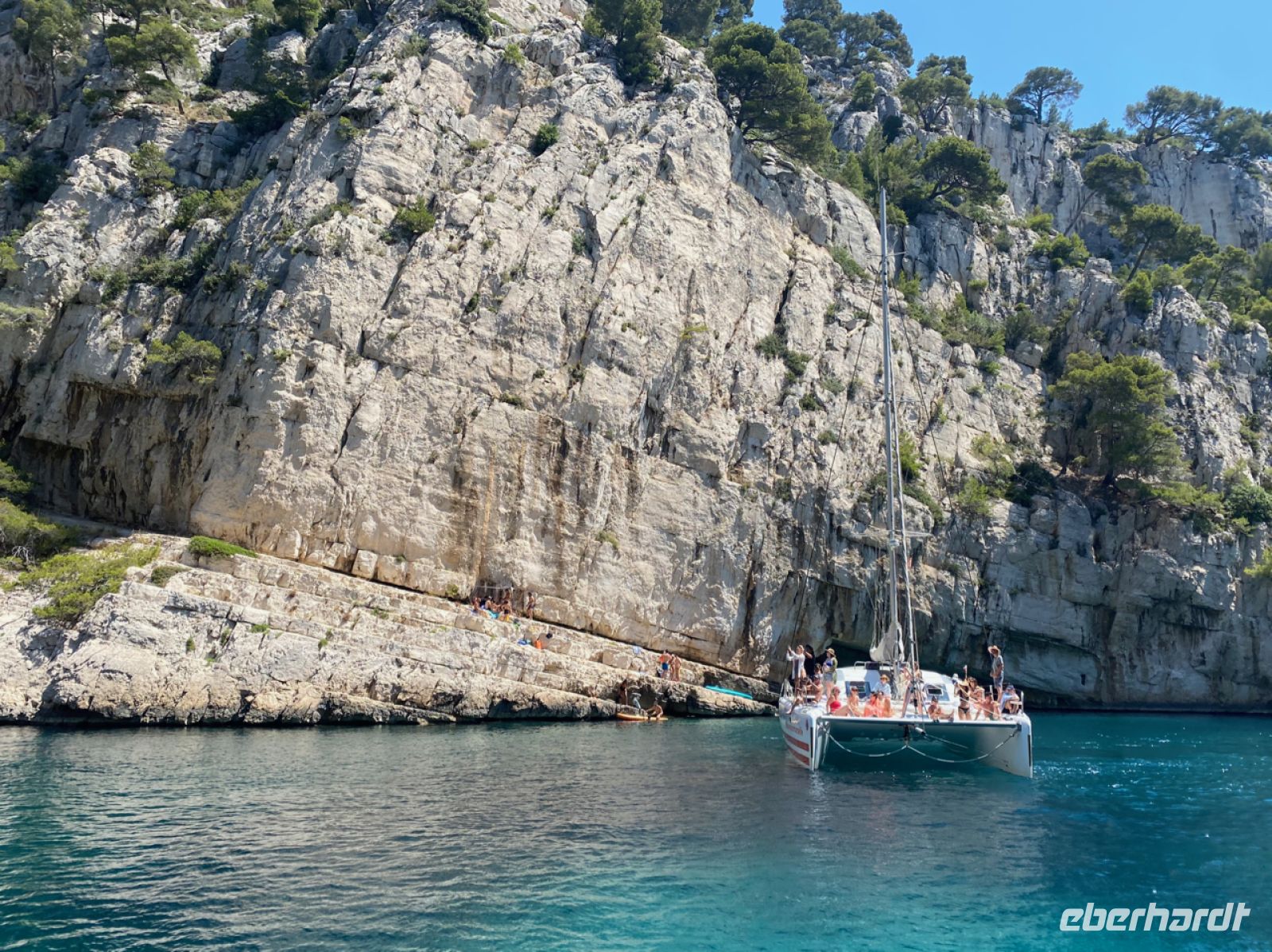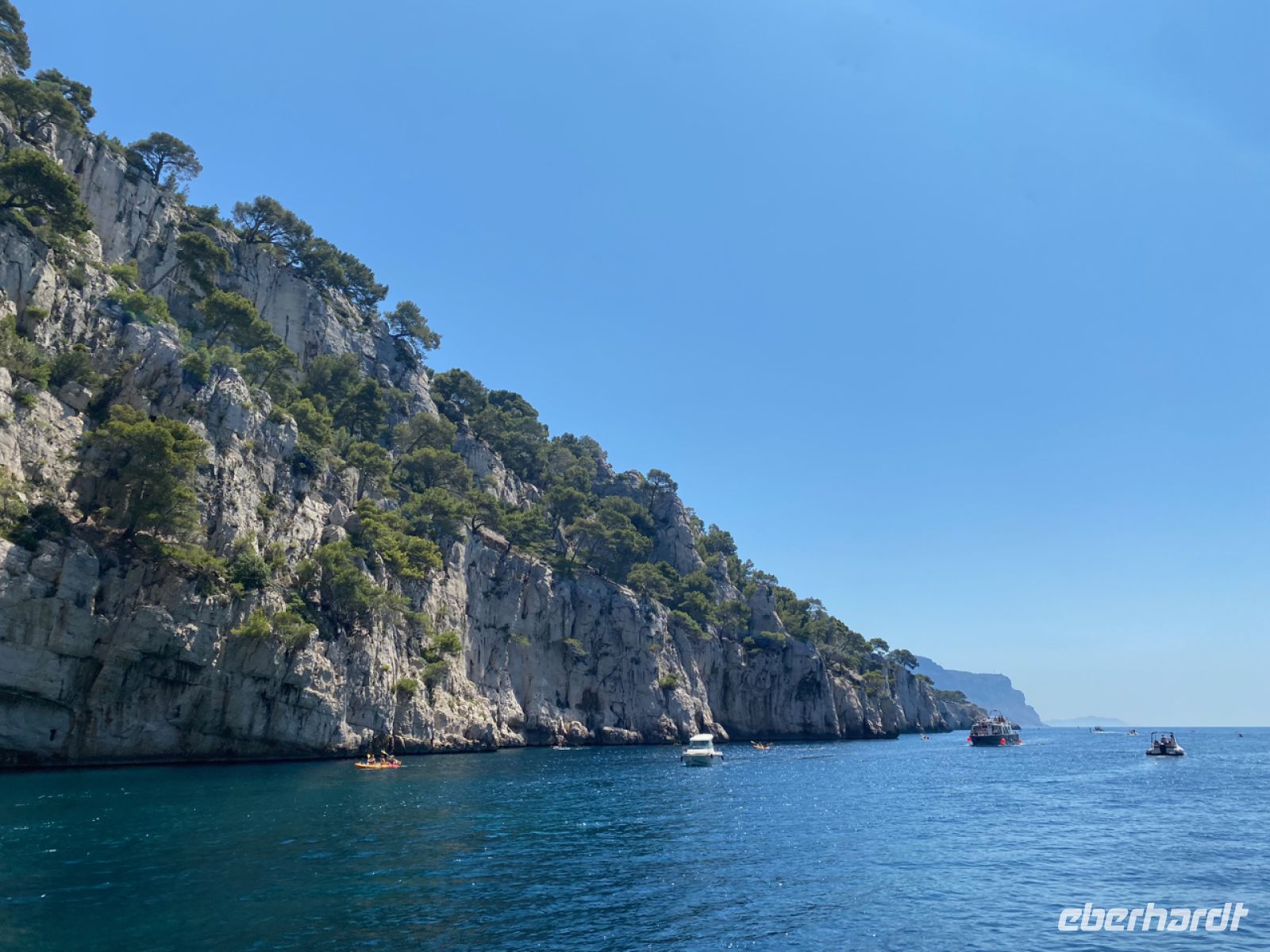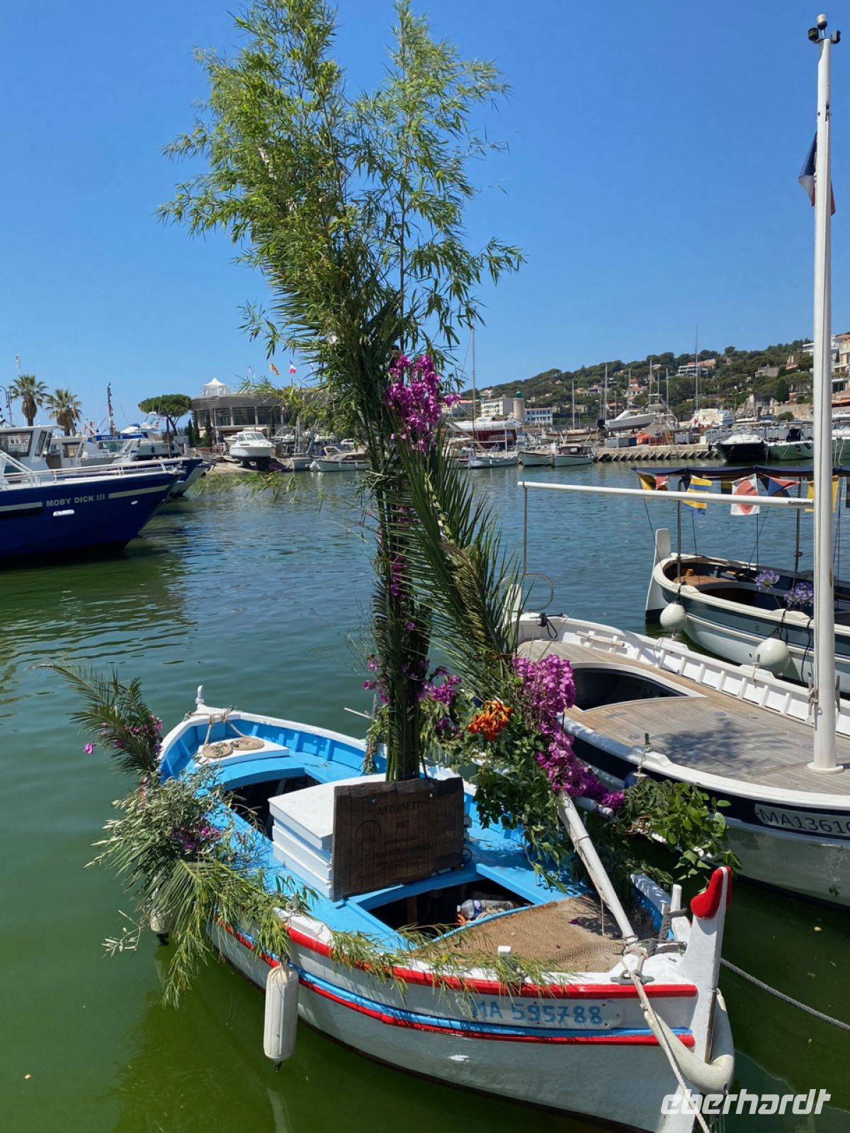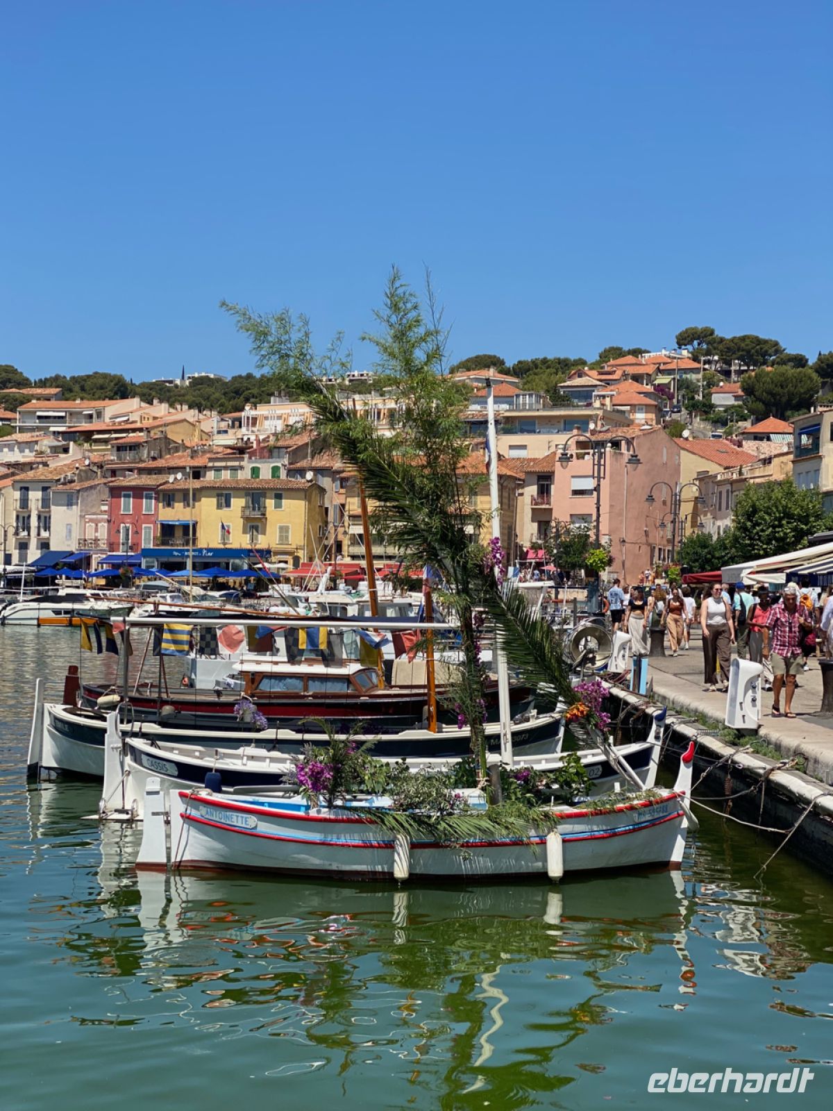 Auch zum Bummeln ist hier Zeit, alles ist nur wenige Schritte voneinander entfernt. Viel zu bestaunen gibt es auch, die Boote werden gerade für das jährliche Fest des Meeres geschmückt. Wir besteigen dagegen ein kleines Ausflugsboot; es bringt uns zu den Calanques, das sind teils tief eingeschnittene Buchten in der für die Gegend typischen Küste aus weißem Kalkstein, der einst auch als sehr beliebtes Baumaterial abgebaut wurde. Im hellen Sonnenschein kommt die Farbe in diesem Zusammenhang in voller Pracht zur Geltung, „die azurblaue Küste“ ist ein wahrlich passender Name!