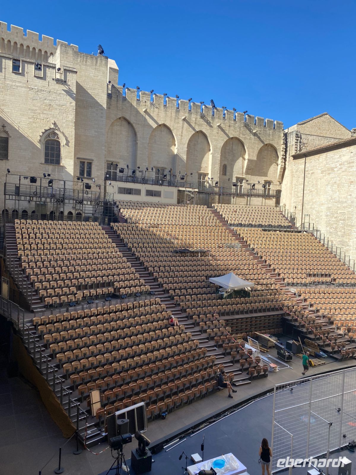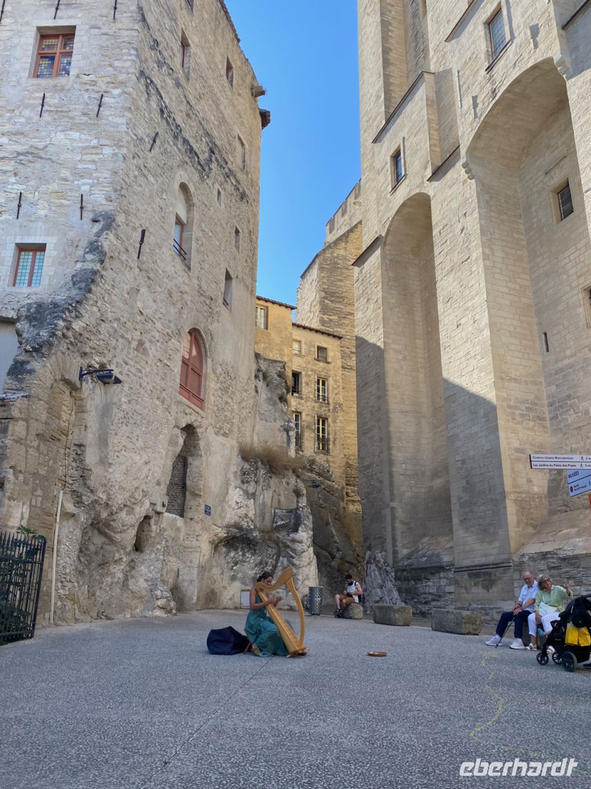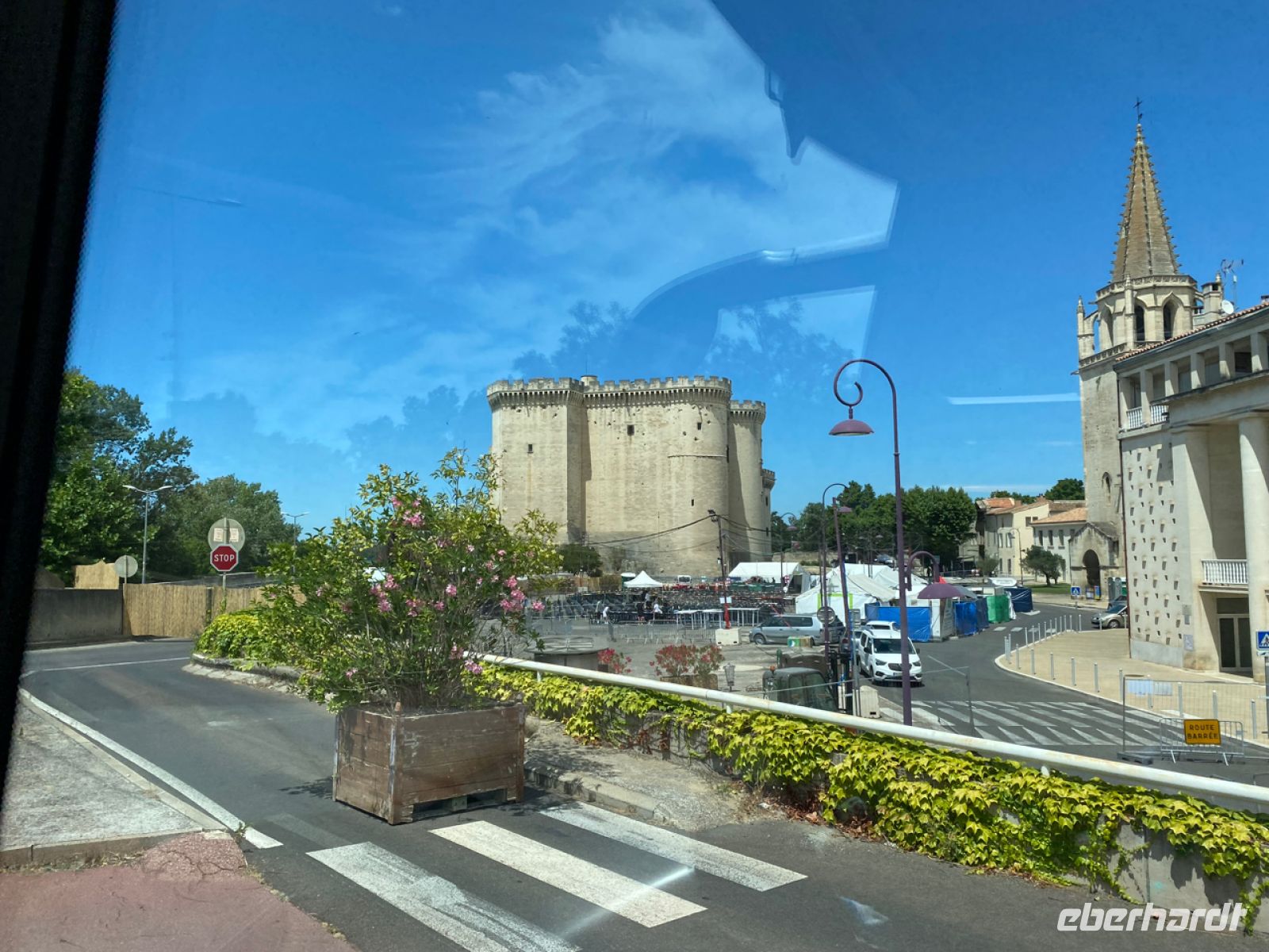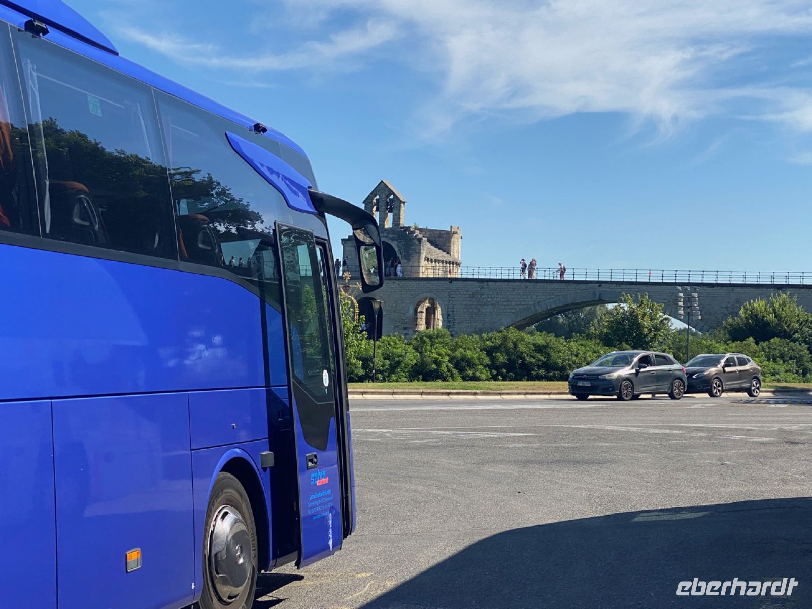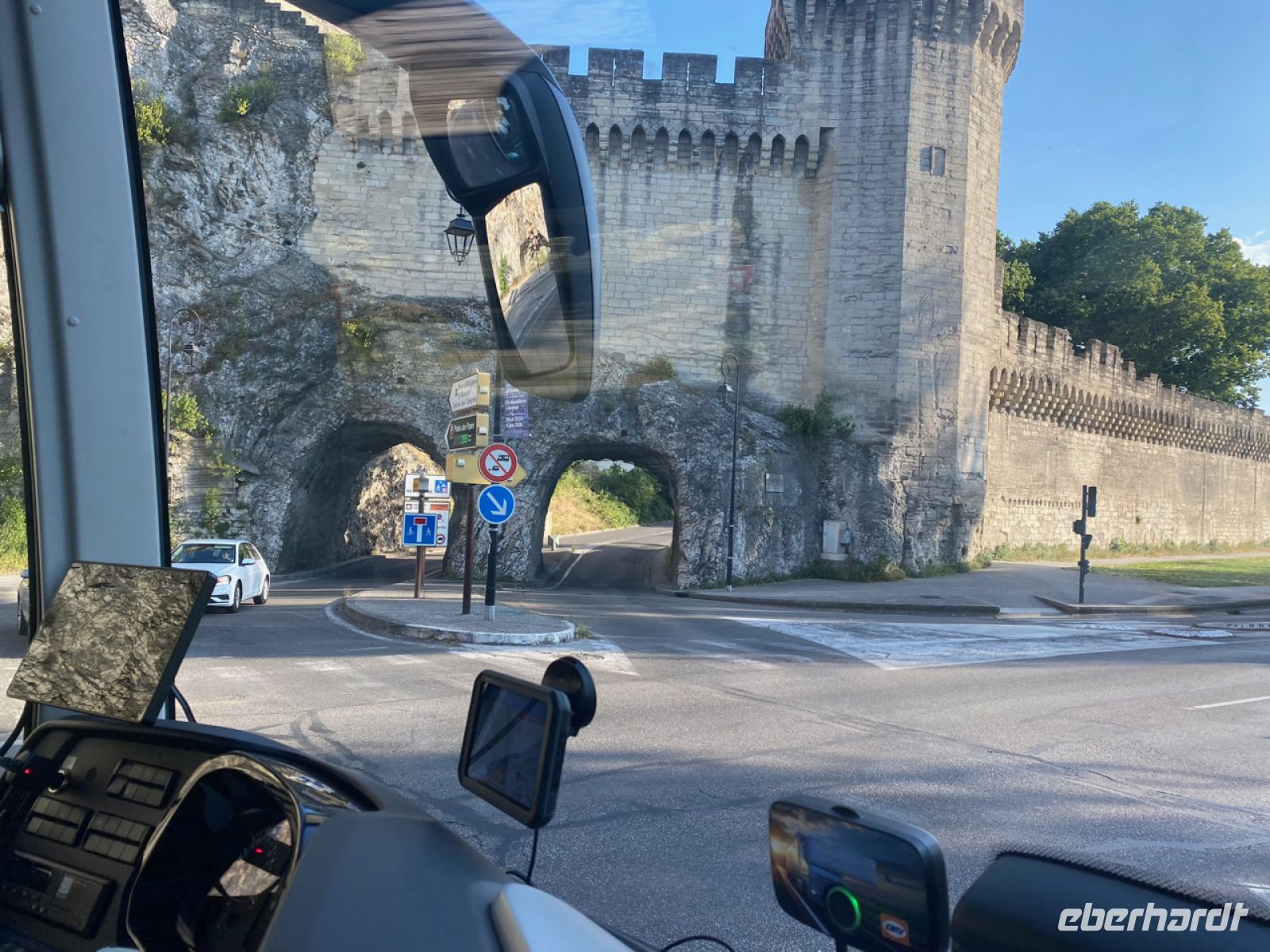 Nun geht es eine ganze Weile auf der Autobahn Richtung Avignon, der alten Papststadt ganz im Westen der Provence. Hier kehren wir, direkt an der Stadtmauer, in unser Hotel für den Rest unserer Reise ein. Kaum zu glauben, wie man hier ein so großes, modernes Hotel in die Altstadt bekommen hat, und noch schwerer, wie es Andreas schafft, so gelassen unseren Bus durch ein winziges Nadelöhr in der Stadtmauer zu rangieren!