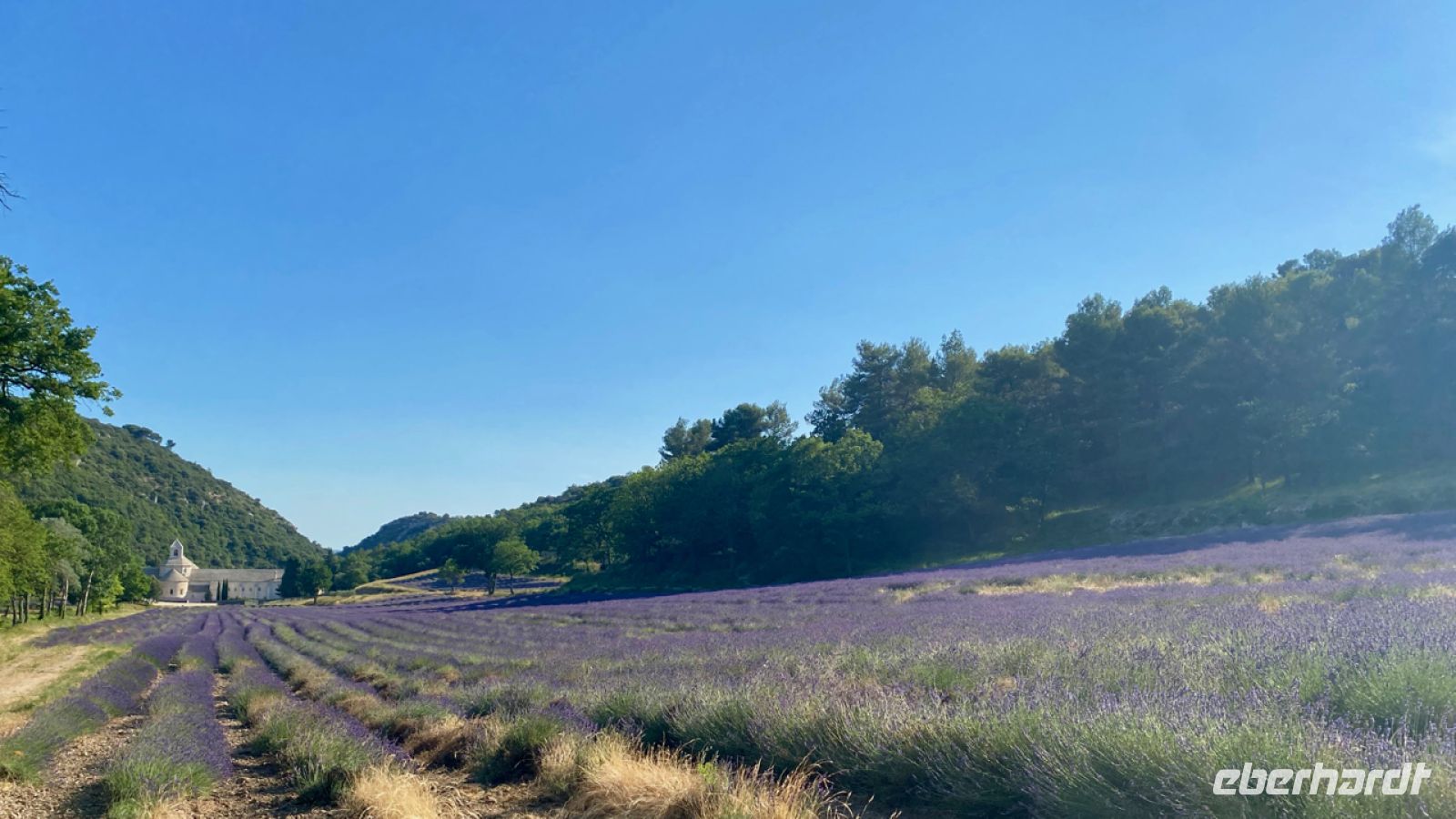 Wir fahren nun mit einem schönen Blick auf Gordes weiter, als wir am frühen Abend das Tal der Sénancole erreichen, ist es dort schon für heutige Verhältnisse angenehm kühler. Hier liegt die Zisterzienserabtei Sénanque, inmitten von Lavendelfeldern, die sich nun wie ein weiter Teppich vor uns in zarter Blüte ausbreiten. Hier am Rande der Felder ist ein guter Ort, um auf unsere Reise anzustoßen; es gibt eiskalten Kir, die Farben passen perfekt zum Lavendel!
