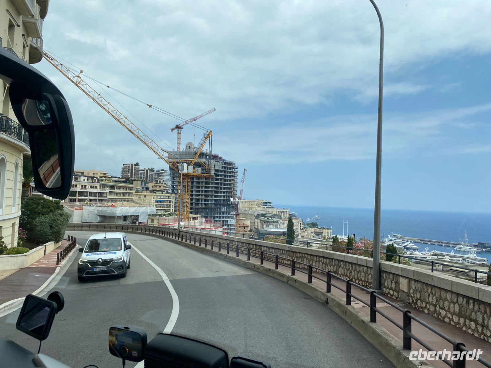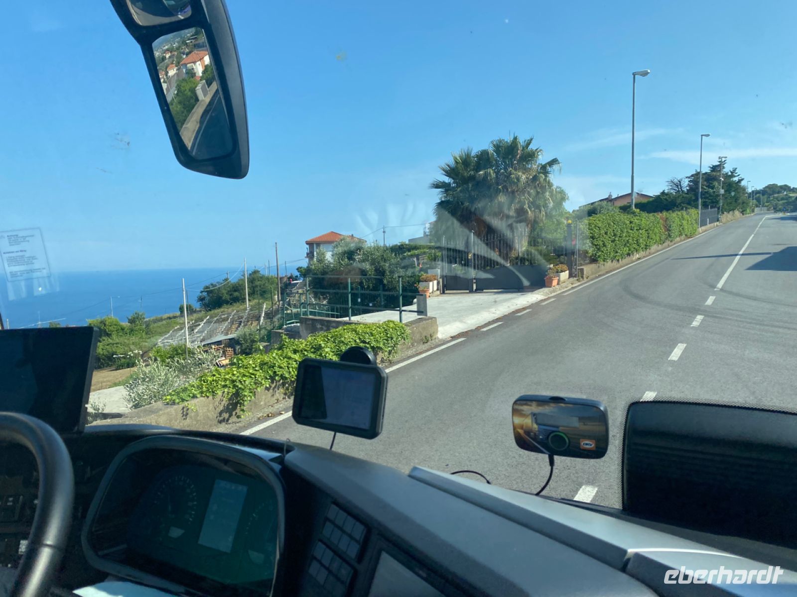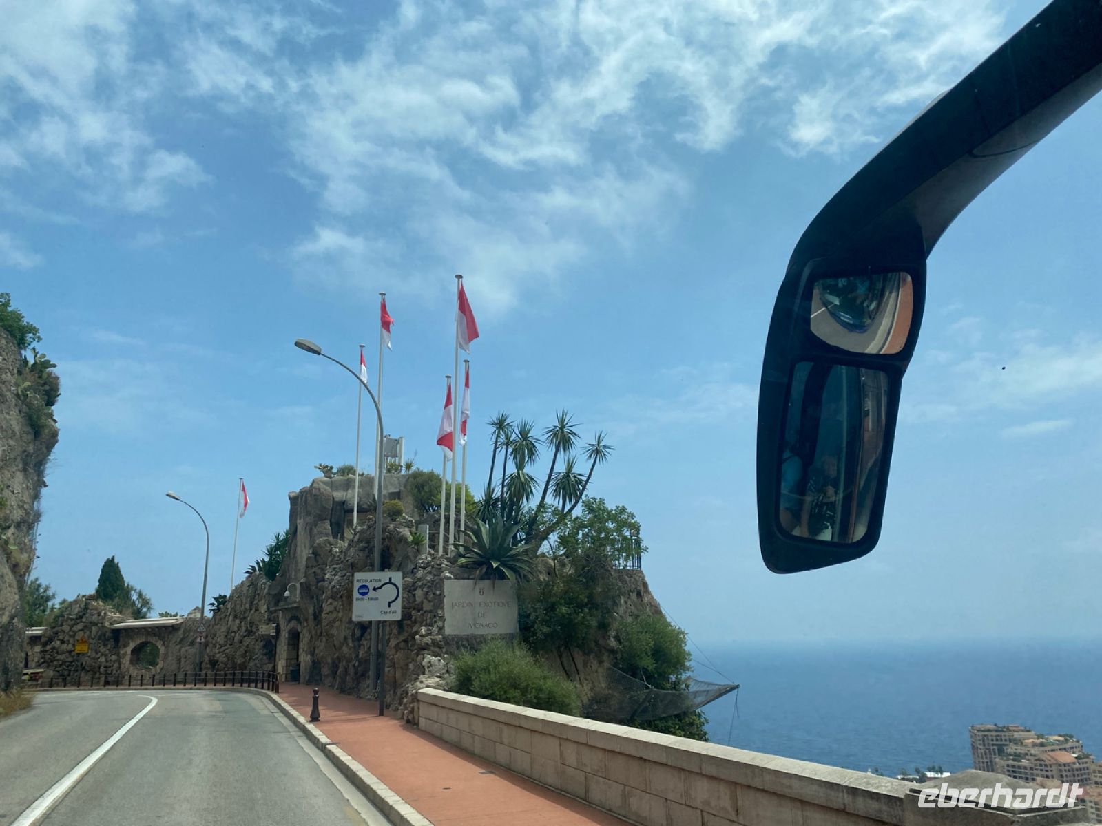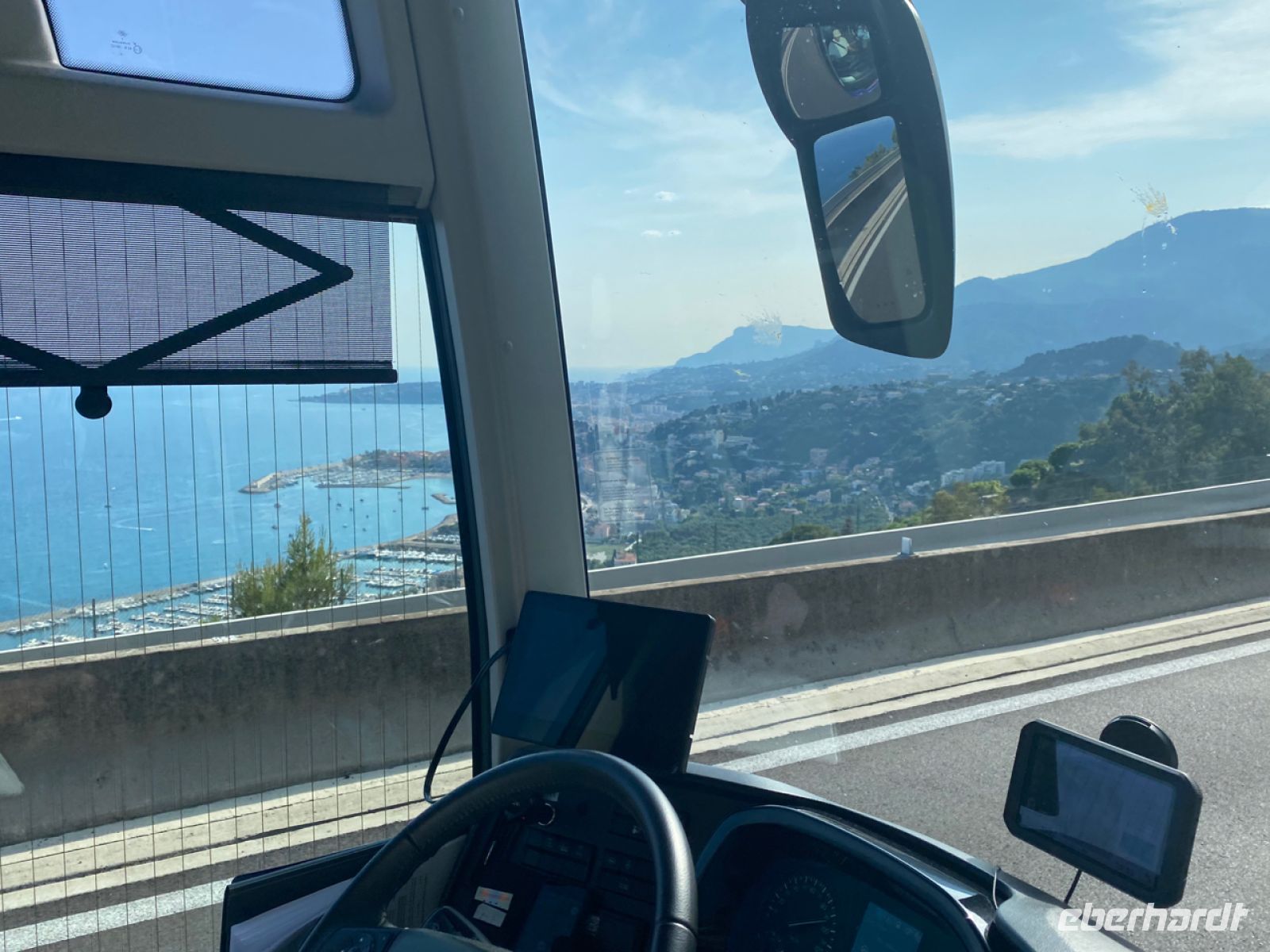 Über spektakuläre Küstenstraßen bringt uns Andreas sicher voran, die Grenze zu Frankreich ist nicht weit, wir haben unser Zielland erreicht. Die andere Hälfte unserer Reisegruppe ist währenddessen bereits erfolgreich auf dem Luftweg an die Côte d’Azur angekommen, die ersten Ankunftsmeldungen gehen ein, sehr erfreulich.