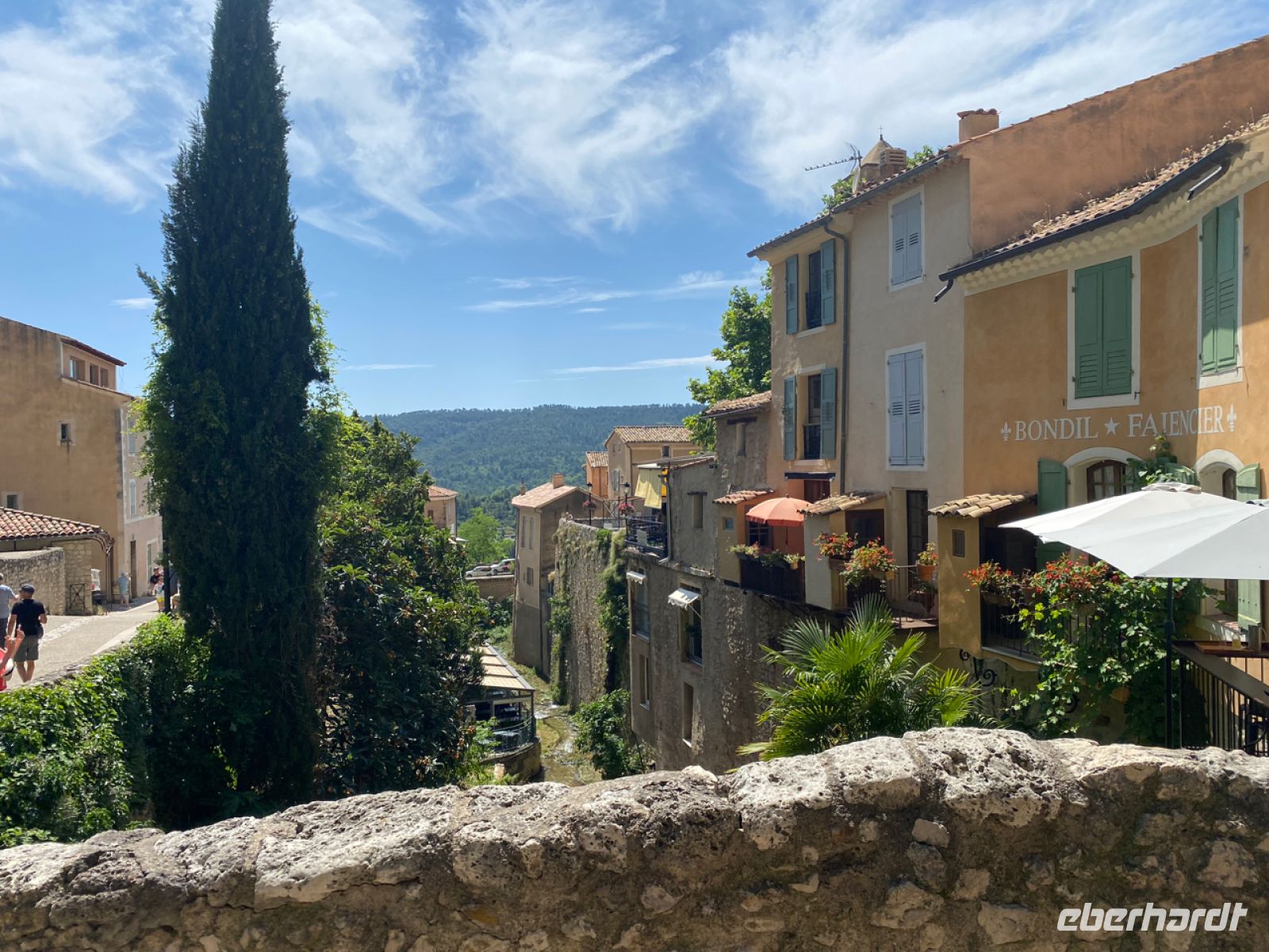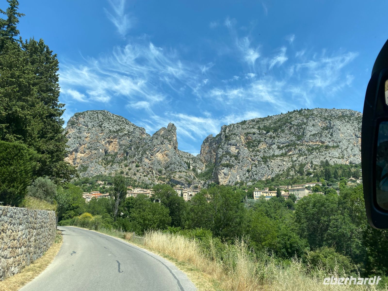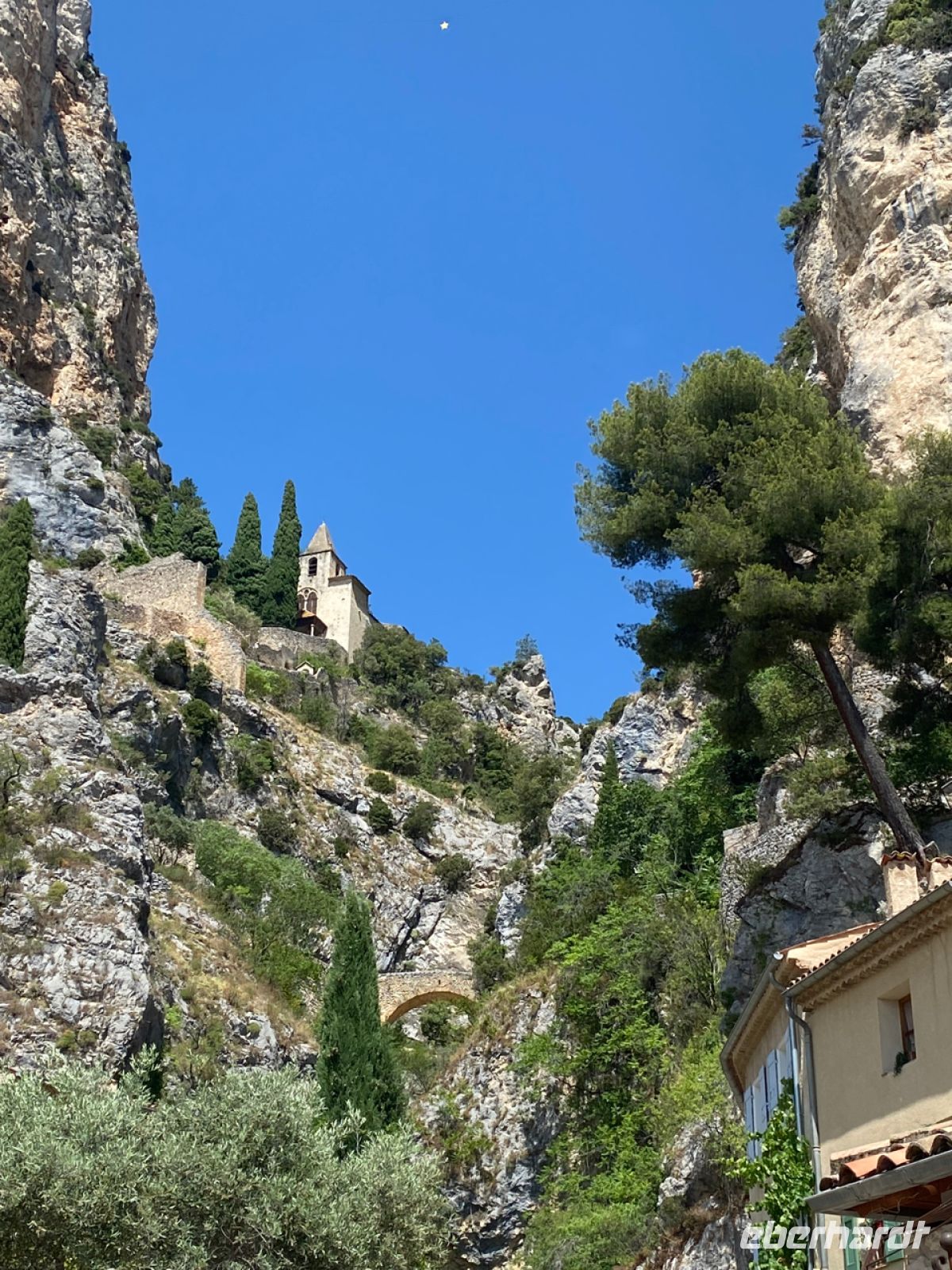 Wir setzen unsere Fahrt der Schlucht entlang fort, nun in entgegengesetzter Richtung, und steuern den Ort Moustiers‑Sainte‑Marie an. Nicht einmal 700 Menschen leben dauerhaft in diesem kleinen Städtchen, das hoch oben an den Felsen errichtet eine weite Landschaft überblickt. Handwerker und Künstler haben hier seit Jahrhunderten eine Heimat gefunden, ihre Traditionen leben heute noch fort. Eine davon ist die Pflege eines goldenen Sterns aus Metall, der über dem Ort in großer Höhe hängt; wir sehen ihn aufgehängt zwischen zwei Felsspitzen.