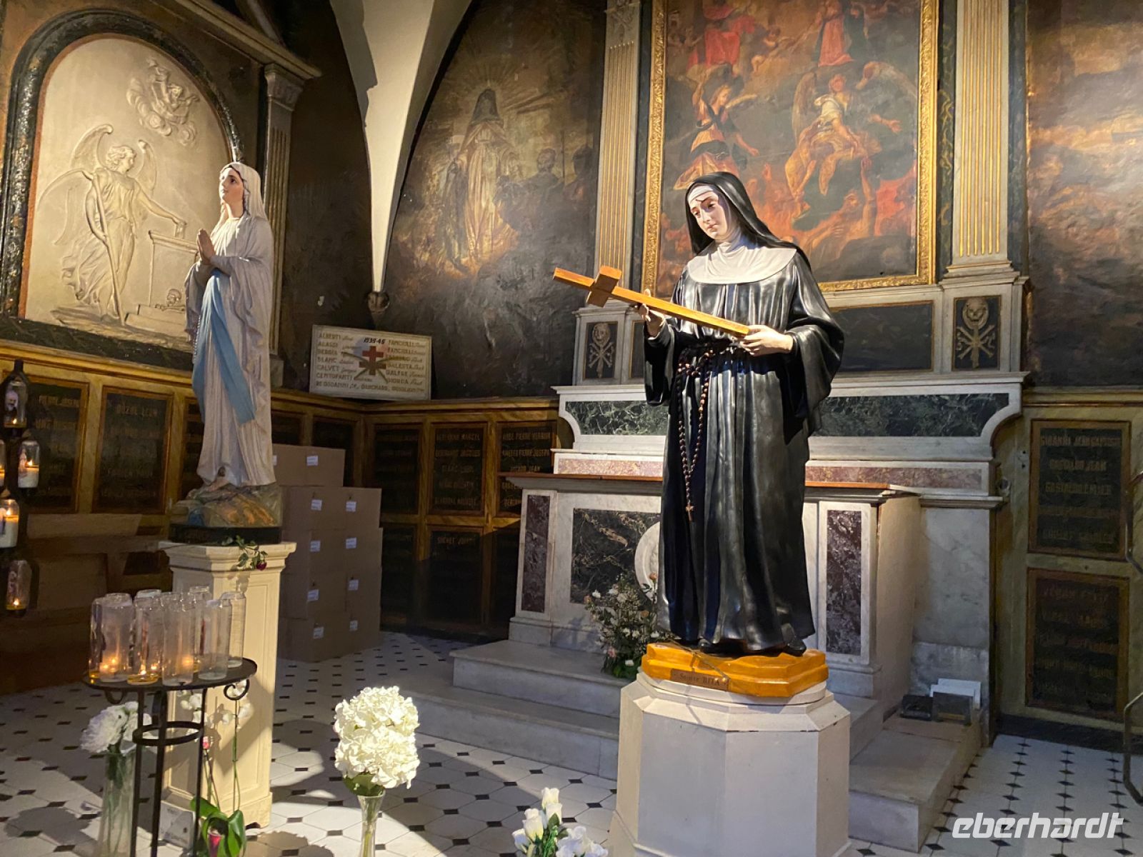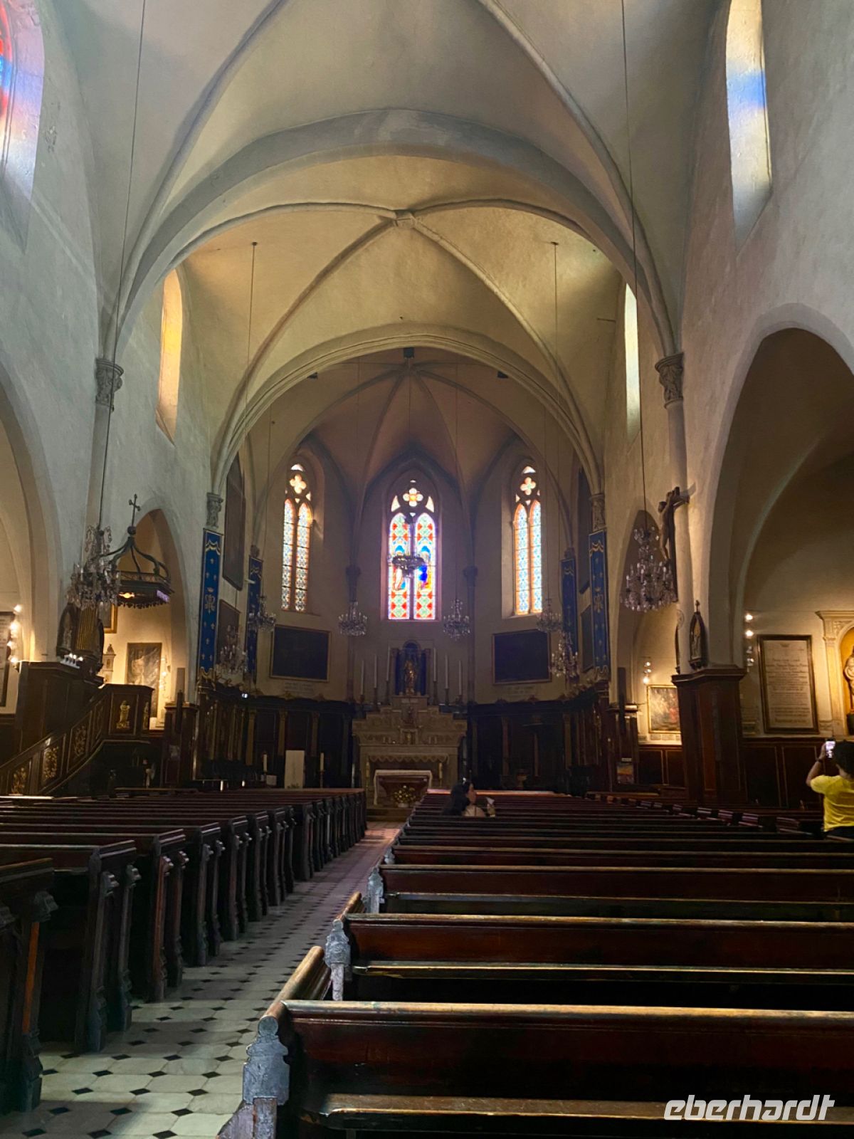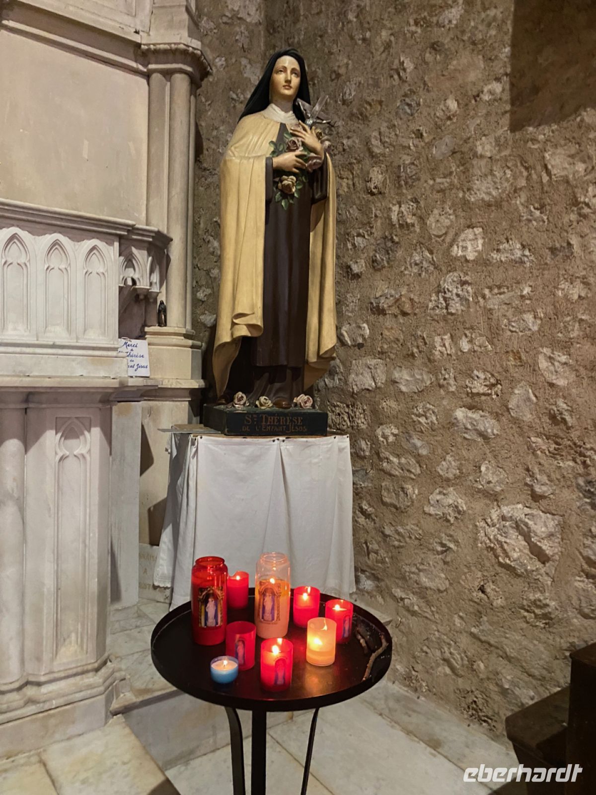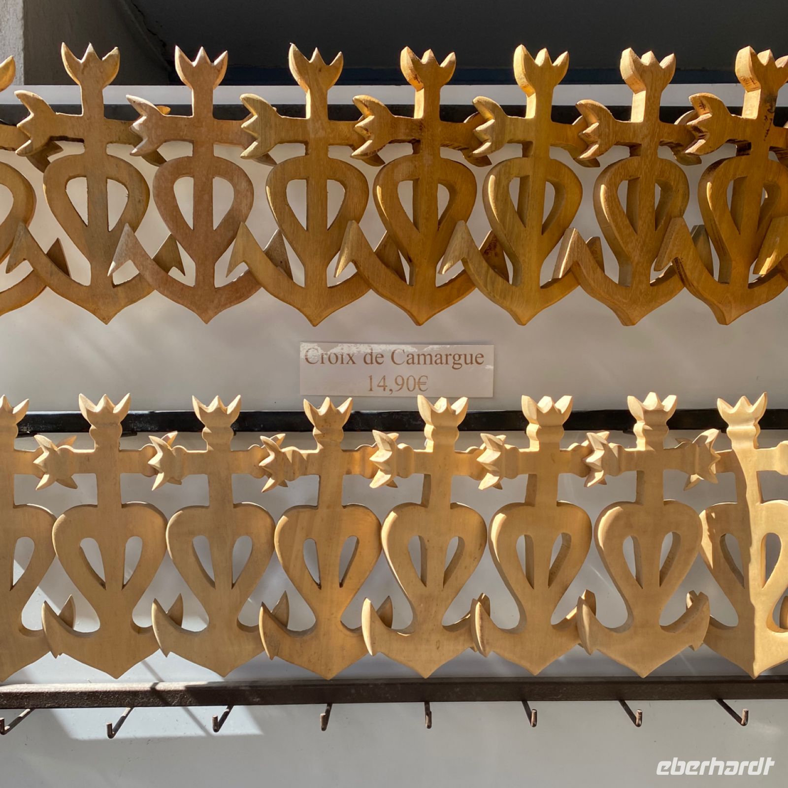 Wir setzen unsere Fahrt der Schlucht entlang fort, nun in entgegengesetzter Richtung, und steuern den Ort Moustiers‑Sainte‑Marie an. Nicht einmal 700 Menschen leben dauerhaft in diesem kleinen Städtchen, das hoch oben an den Felsen errichtet eine weite Landschaft überblickt. Handwerker und Künstler haben hier seit Jahrhunderten eine Heimat gefunden, ihre Traditionen leben heute noch fort. Eine davon ist die Pflege eines goldenen Sterns aus Metall, der über dem Ort in großer Höhe hängt; wir sehen ihn aufgehängt zwischen zwei Felsspitzen.