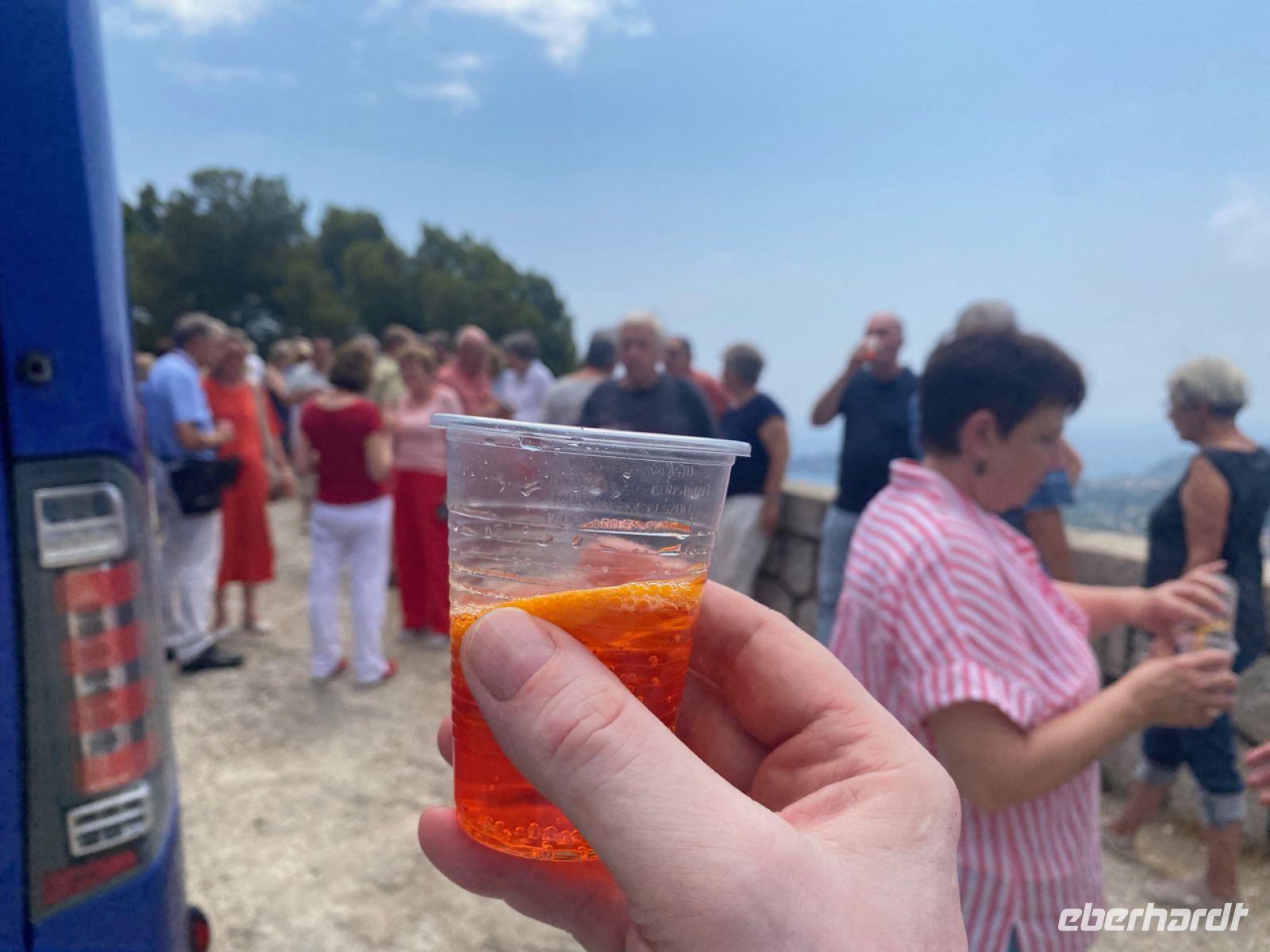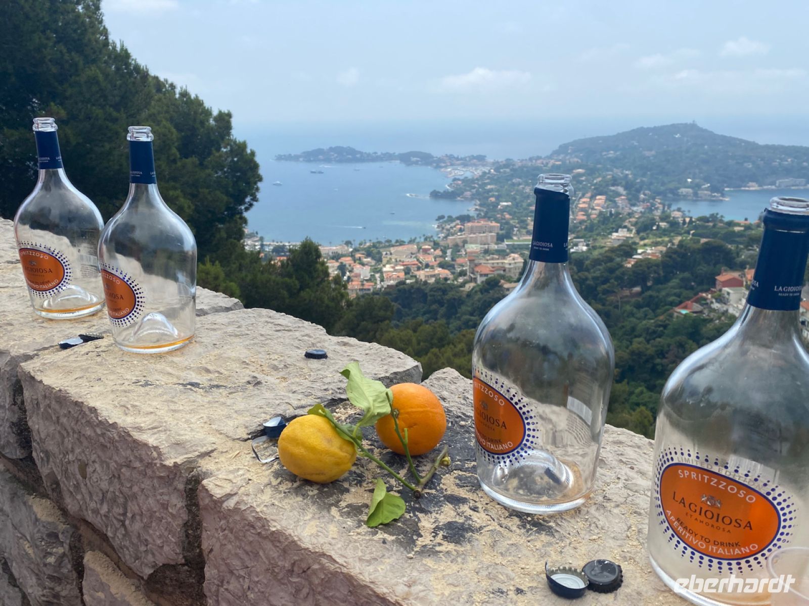 Am lebhaften Obst‑ und Blumenmarkt gibt es eine Pause mit Freizeit, bevor wir (fast) alle zusammen zum Bus zurückkehren, um die Stadt über eine der als Corniche bezeichneten Küstenstraßen zu verlassen. Am Belvédère de Villefranche‑sur‑Mer, einem besonders schönen Aussichtspunkt, halten wir mit Blick aufs Meer. Es gibt einen Geburtstag zu feiern, und wo könnte man besser darauf anstoßen als hier!