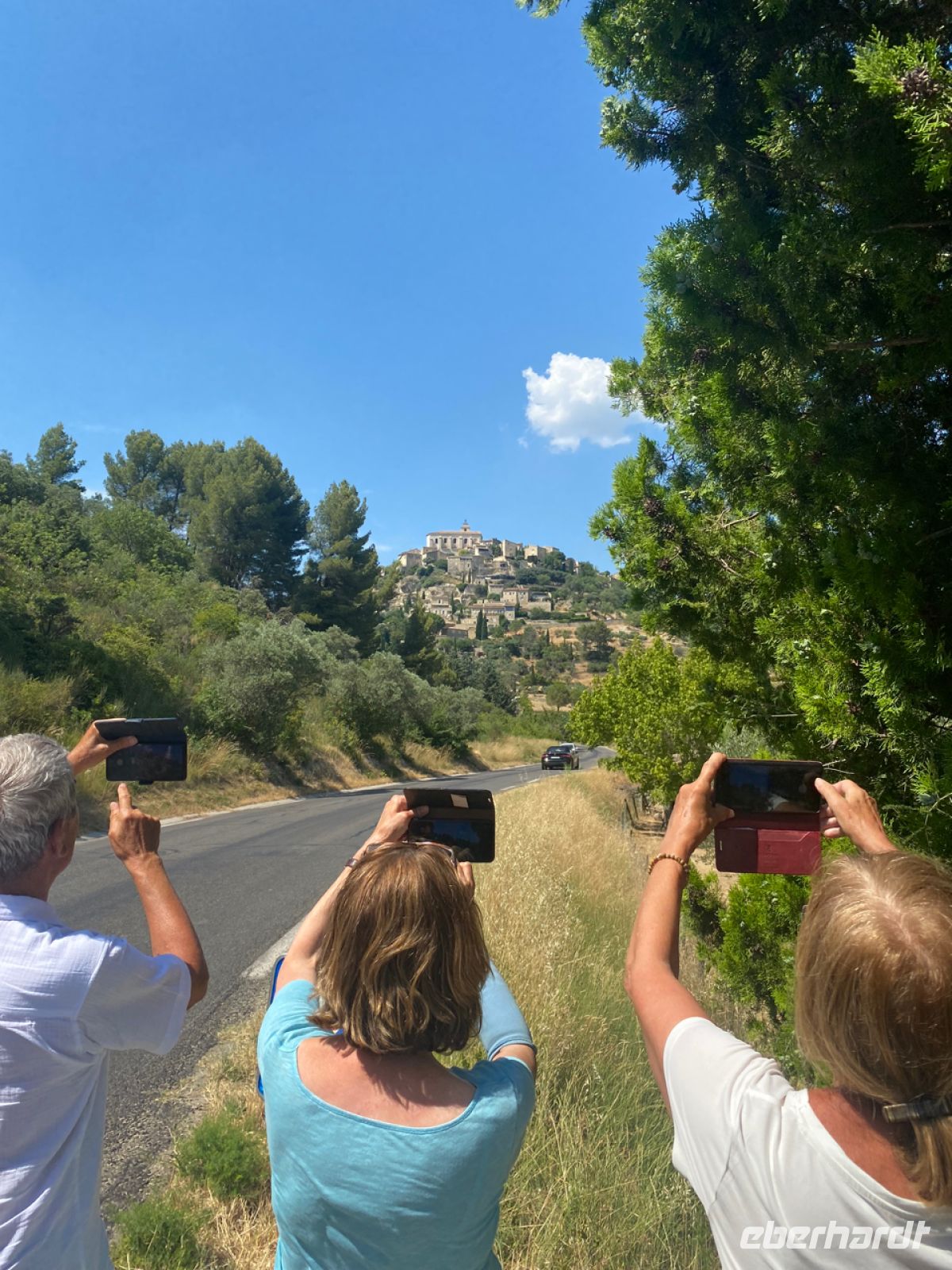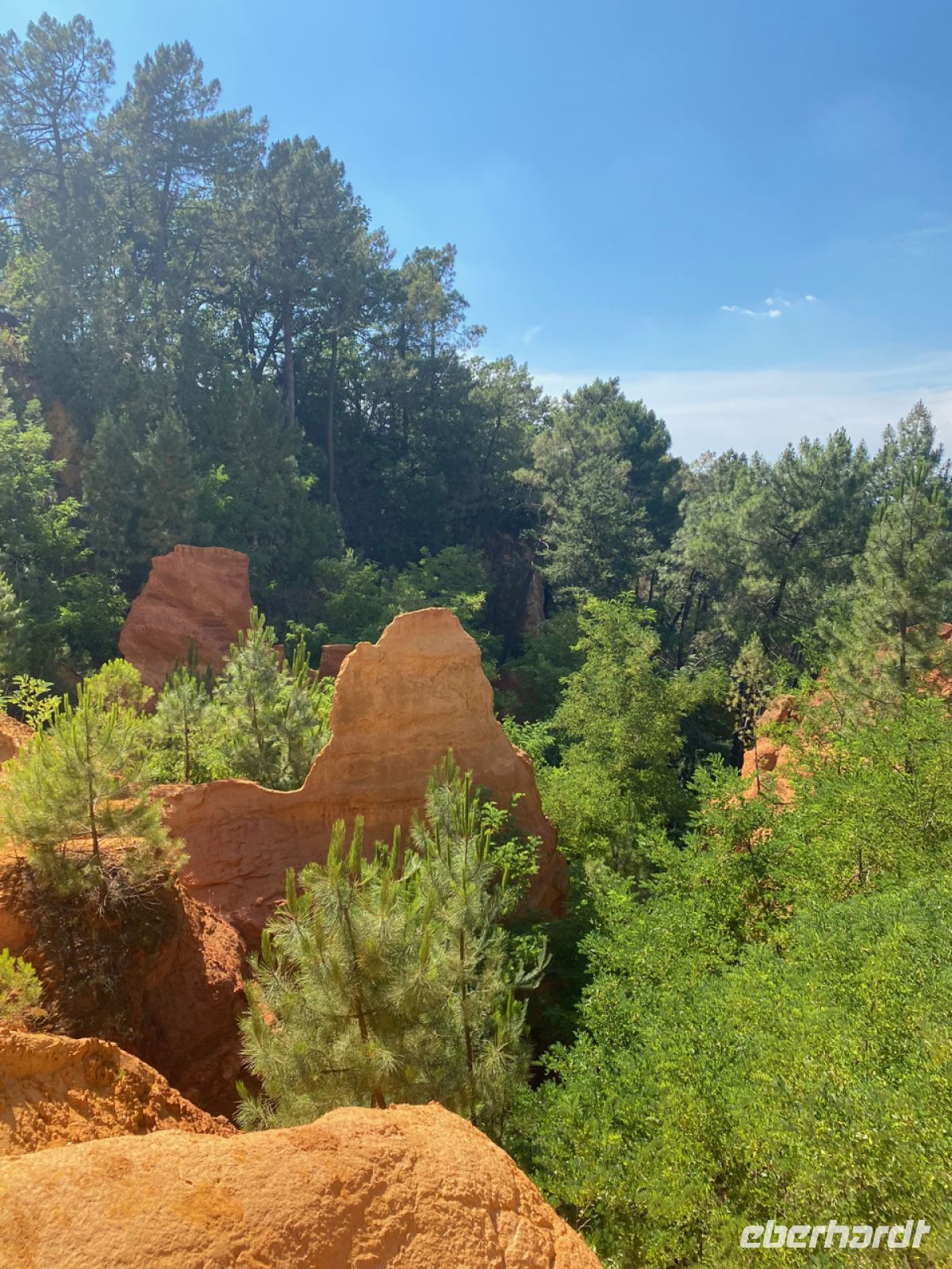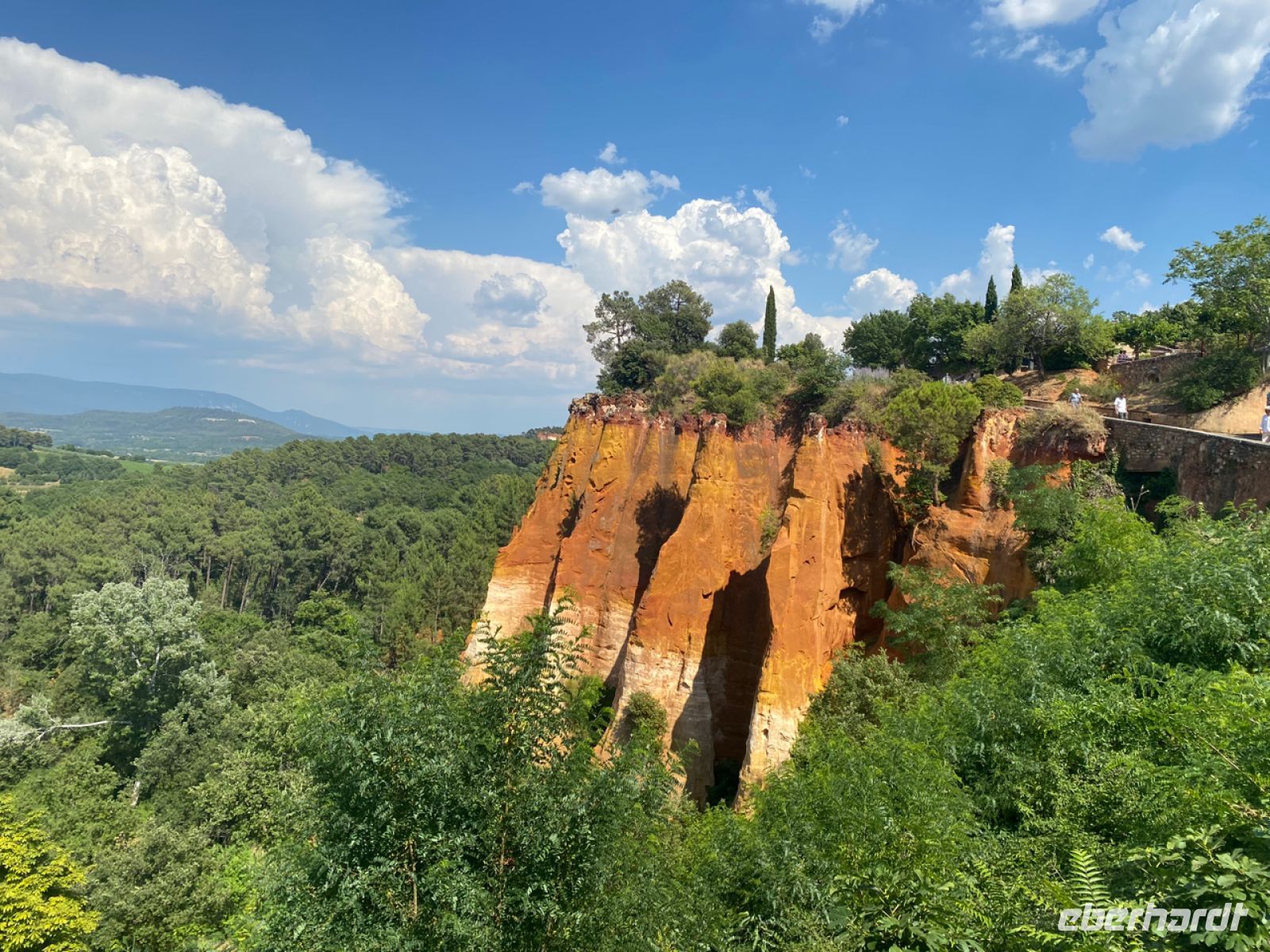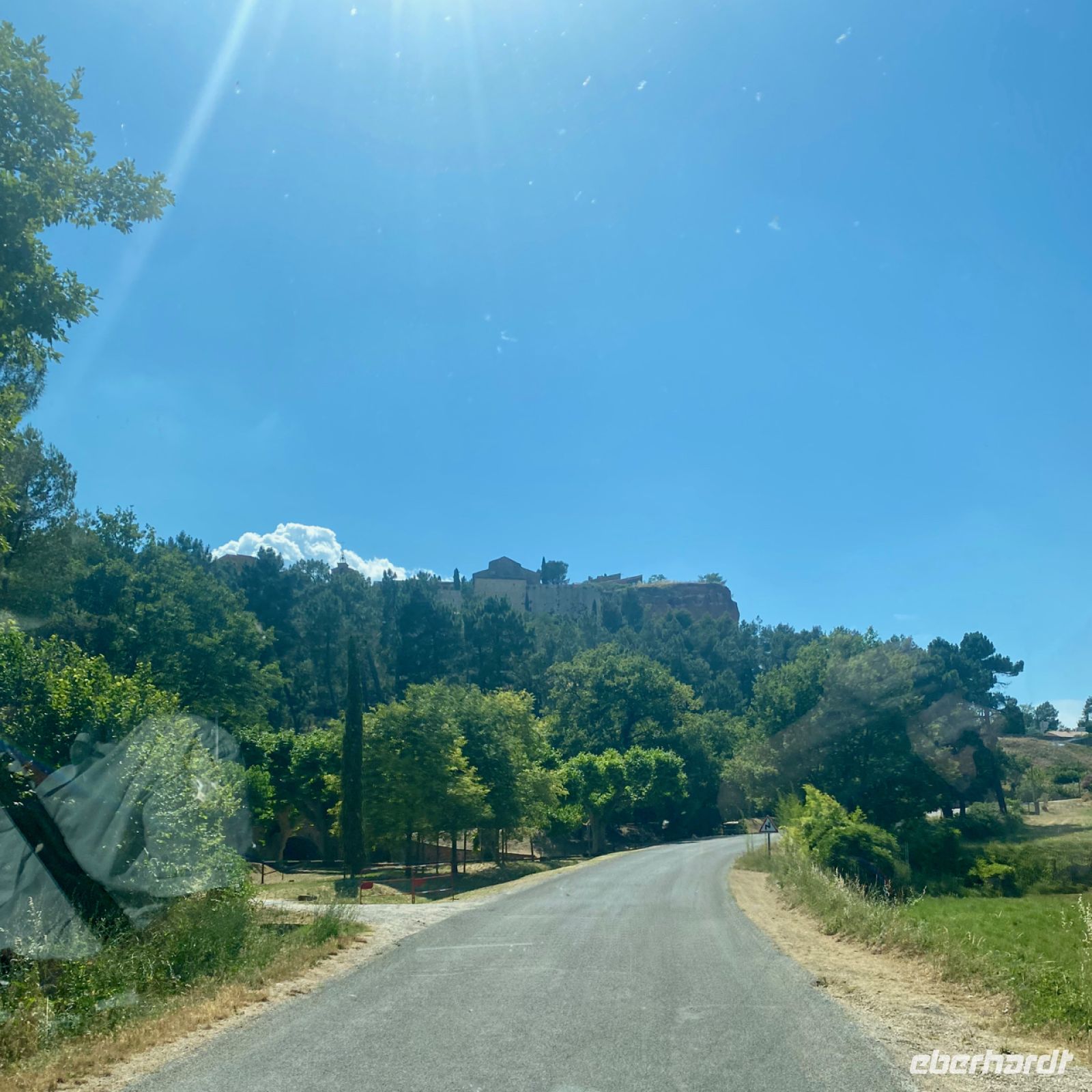 Eine ähnlich befestigte Stadt ist unser nächstes Ziel: Roussillon. Schon von weitem sichtbar unterscheidet sich der Ort durch seine Farbe von den bisher besuchten. Leuchtend orange strahlt er schon aus der Ferne. Die Farbe kommt vom lange Zeit hier abgebauten Ocker; hier gab es Farbfabriken, deren kostbare Produkte von Künstlern hoch geschätzt wurden. Wir schätzen heute ganz besonders kalte Getränke; inzwischen haben die Temperaturen die 40‑Grad‑Marke geknackt, zurück im klimatisierten Bus können wir uns erholen.