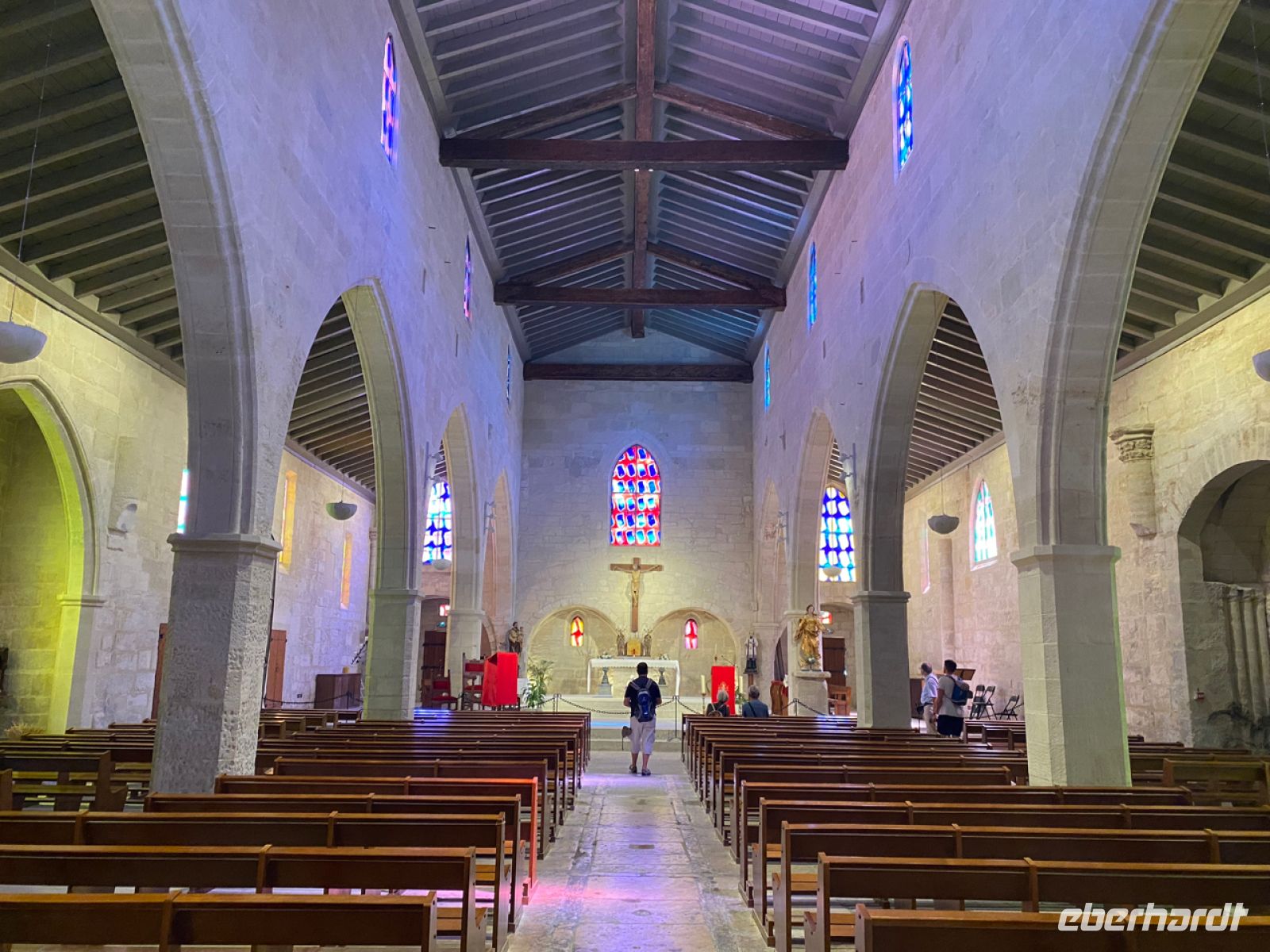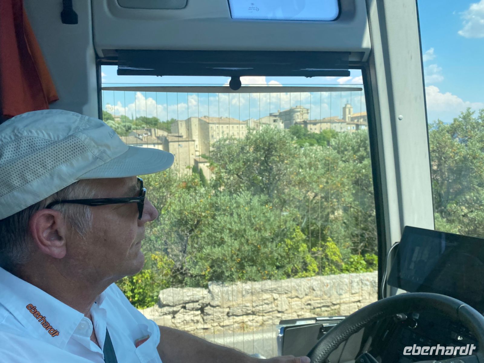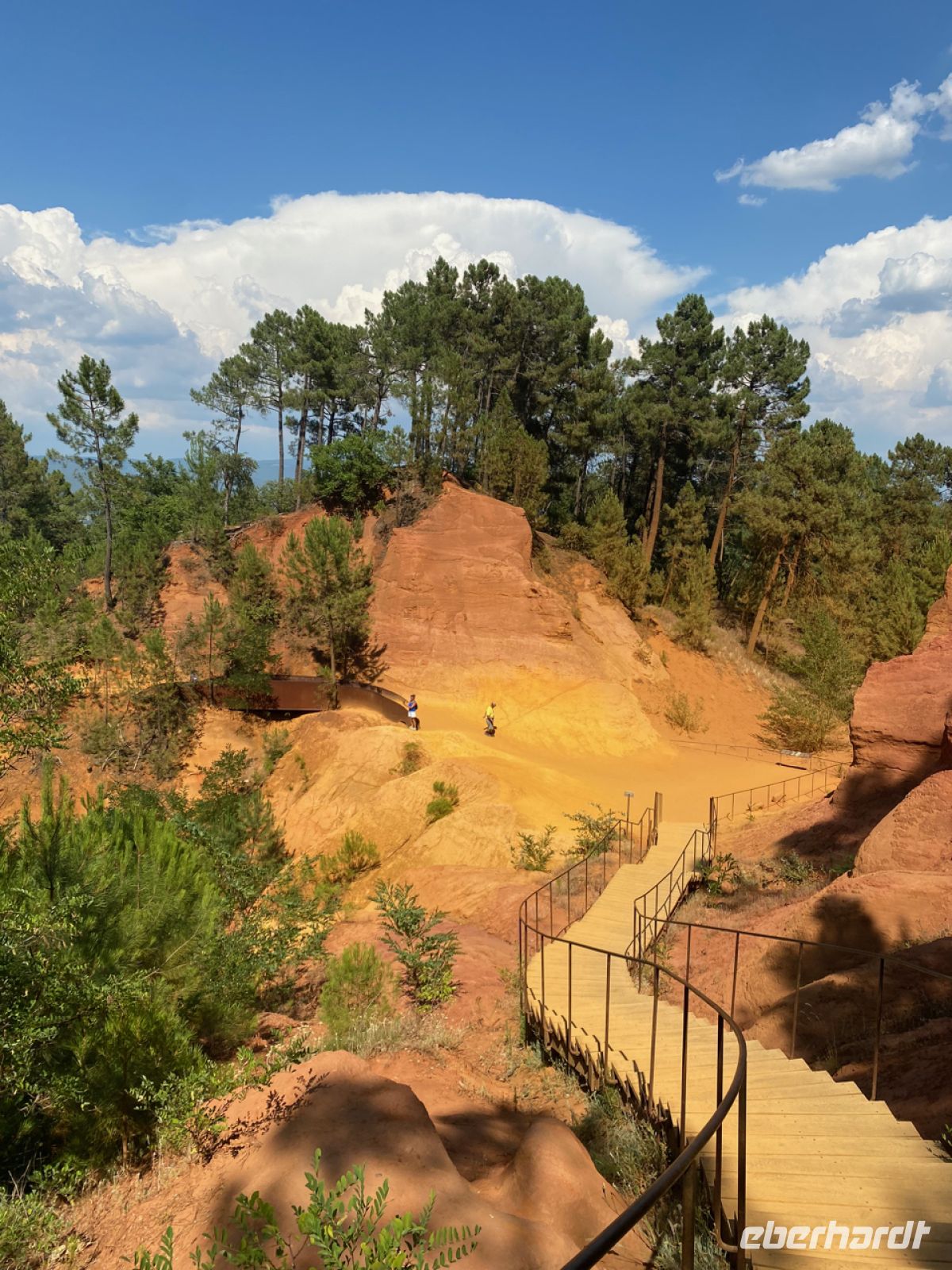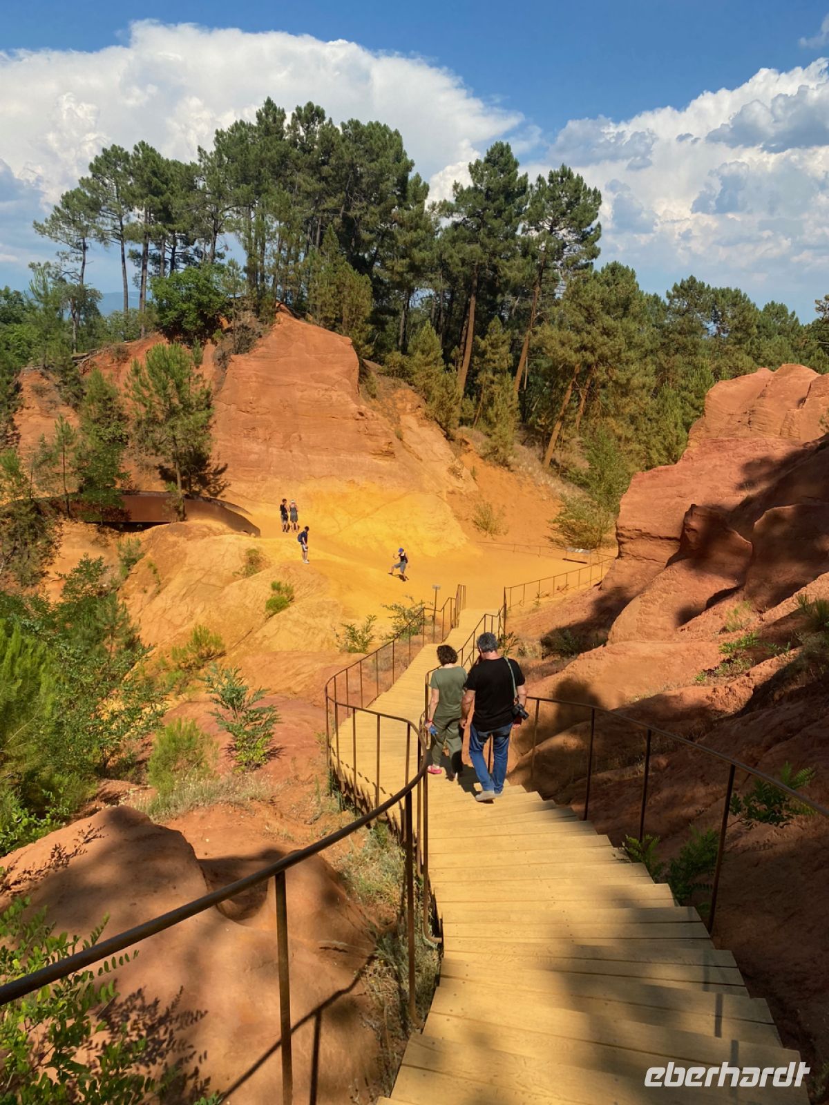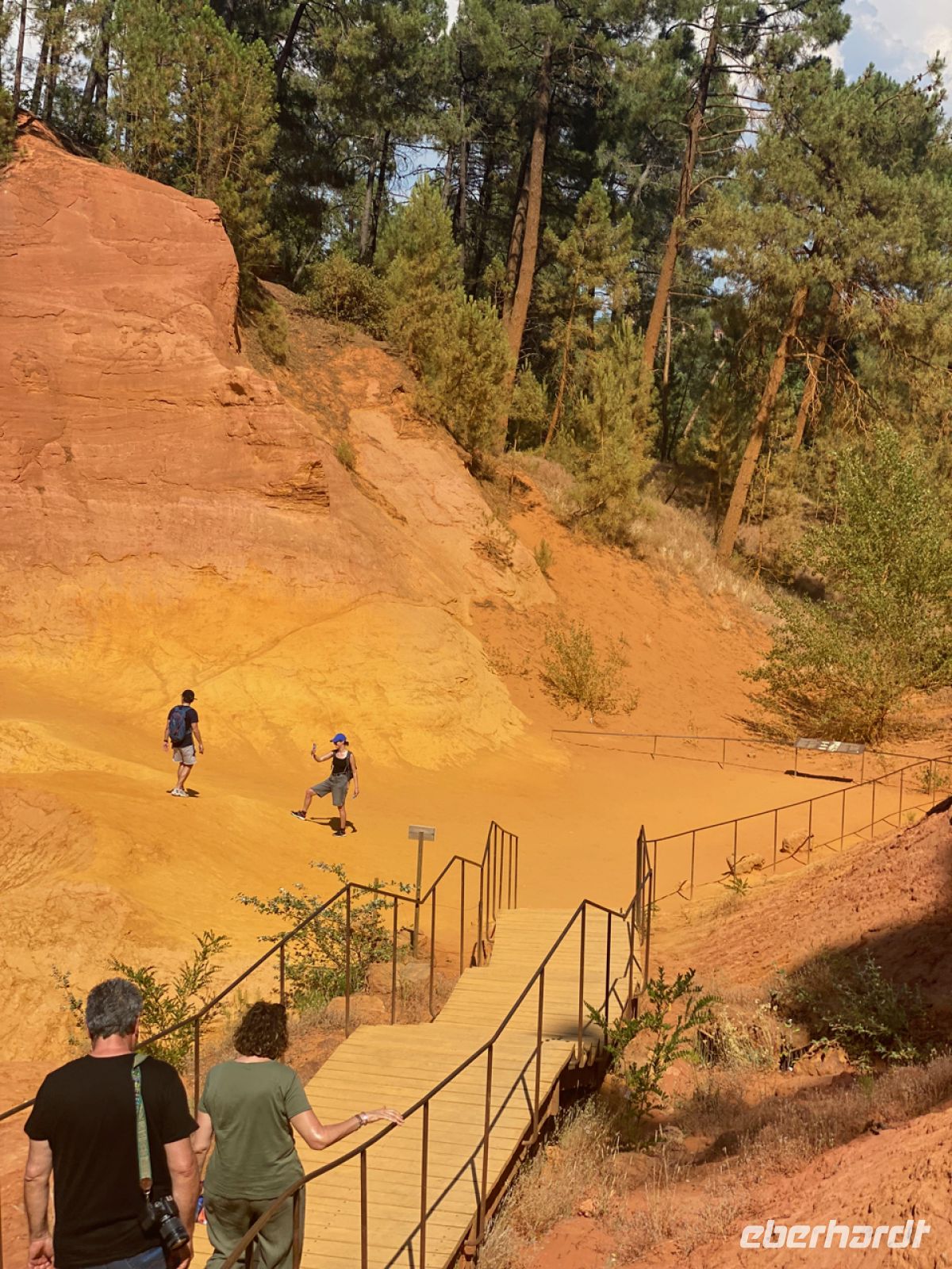 Eine ähnlich befestigte Stadt ist unser nächstes Ziel: Roussillon. Schon von weitem sichtbar unterscheidet sich der Ort durch seine Farbe von den bisher besuchten. Leuchtend orange strahlt er schon aus der Ferne. Die Farbe kommt vom lange Zeit hier abgebauten Ocker; hier gab es Farbfabriken, deren kostbare Produkte von Künstlern hoch geschätzt wurden. Wir schätzen heute ganz besonders kalte Getränke; inzwischen haben die Temperaturen die 40‑Grad‑Marke geknackt, zurück im klimatisierten Bus können wir uns erholen.