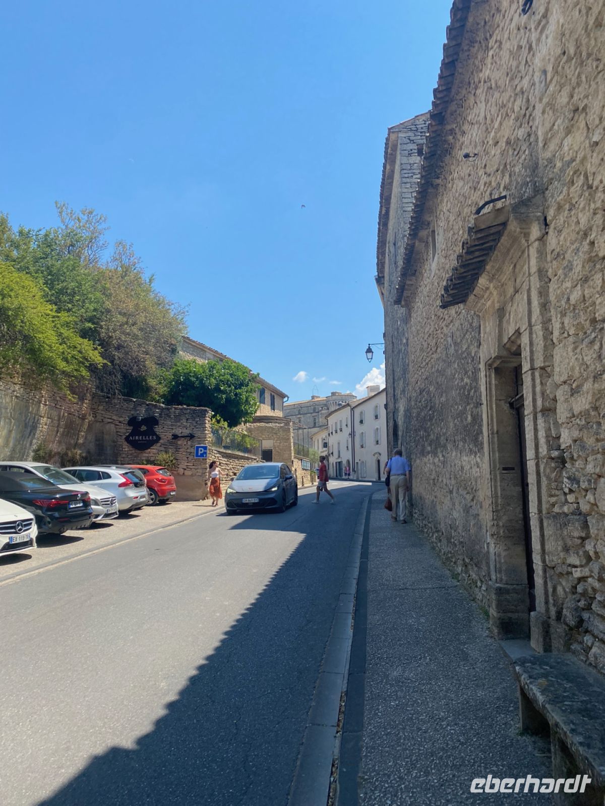 Es geht nun vorbei an Saint‑Rémy‑de‑Provence, ebenfalls eine ehemalige römische Stadt und für Vincent van Gogh ein Ort der Inspiration, nach Gordes. Dieser kleine Ort liegt wieder steil auf einem Felsen; die letzte Steigung wird heute zu einem sportlichen Ereignis, denn inzwischen ist es wirklich sehr heiß geworden. Die schattigen, engen Gassen wusste man hier schon vor Jahrhunderten ebenso zu schätzen wie die früher notwendige militärische Sicherheit auf dem Felsen.