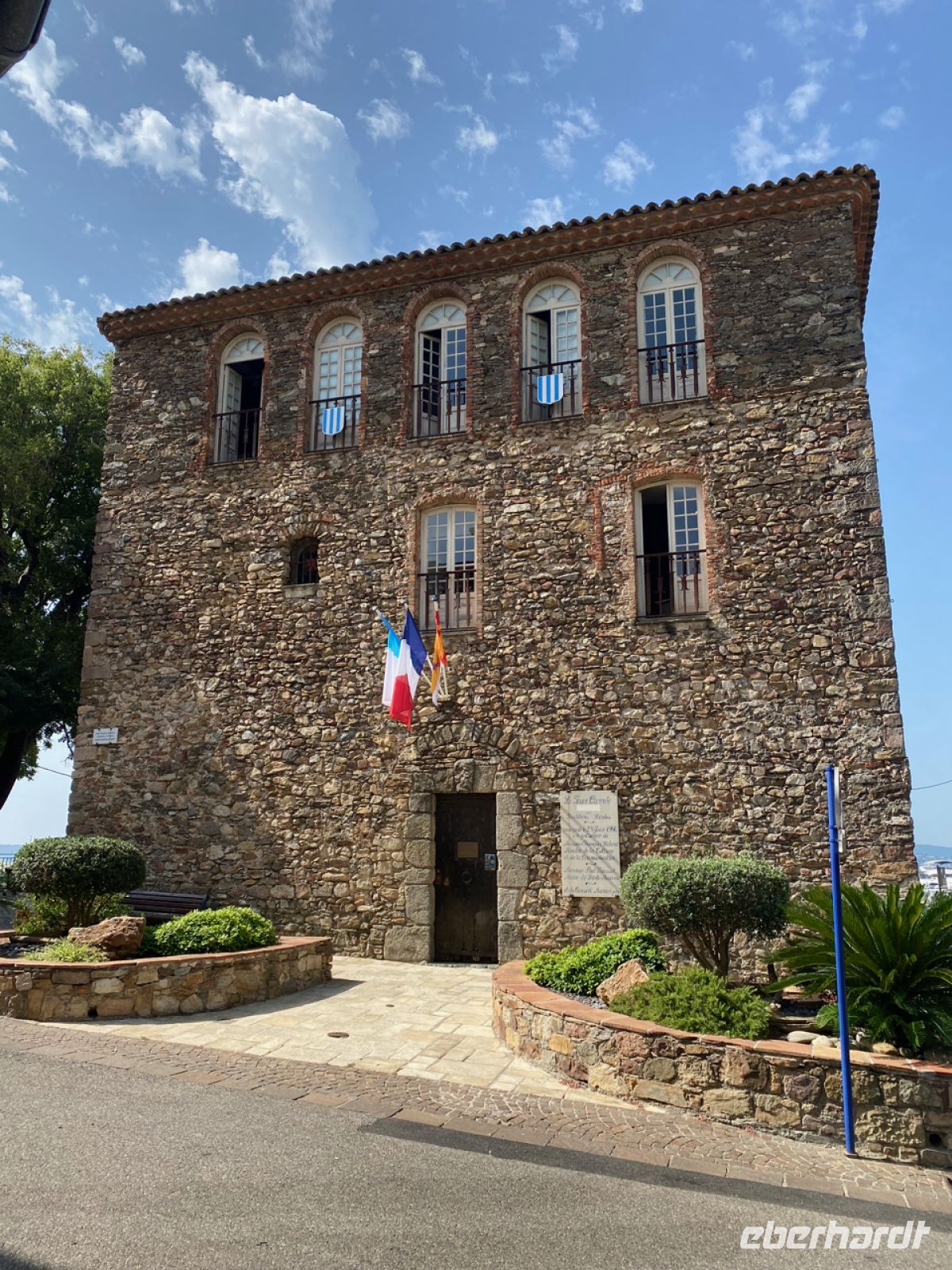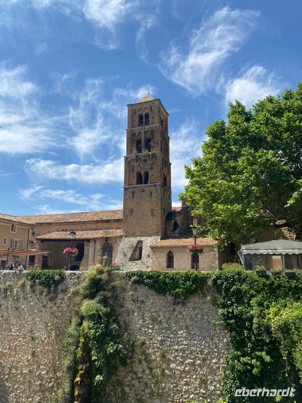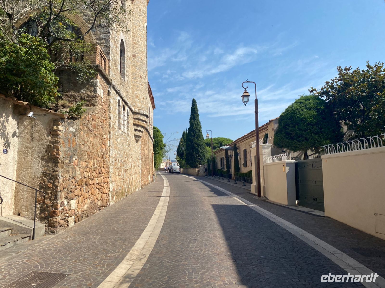 Im alten Hafen, an der Altstadt, gehen wir an Land; hier sind einige legendäre Cafés zu finden. Dahinter überragt der bunte Turm der Pfarrkirche das Szenario. Es ist wunderschön hier – und durchaus heiß inzwischen. Wir haben hier viel Zeit, manche essen mehr als ein Eis, bevor es weitergeht. Wir spazieren noch durch den Rest des Ortes, vorbei am Gebäude der Gendarmerie, das viele aus den Louis‑de‑Funès‑Filmen kennen, und fahren dann mit unserem Bus landeinwärts nach Norden.