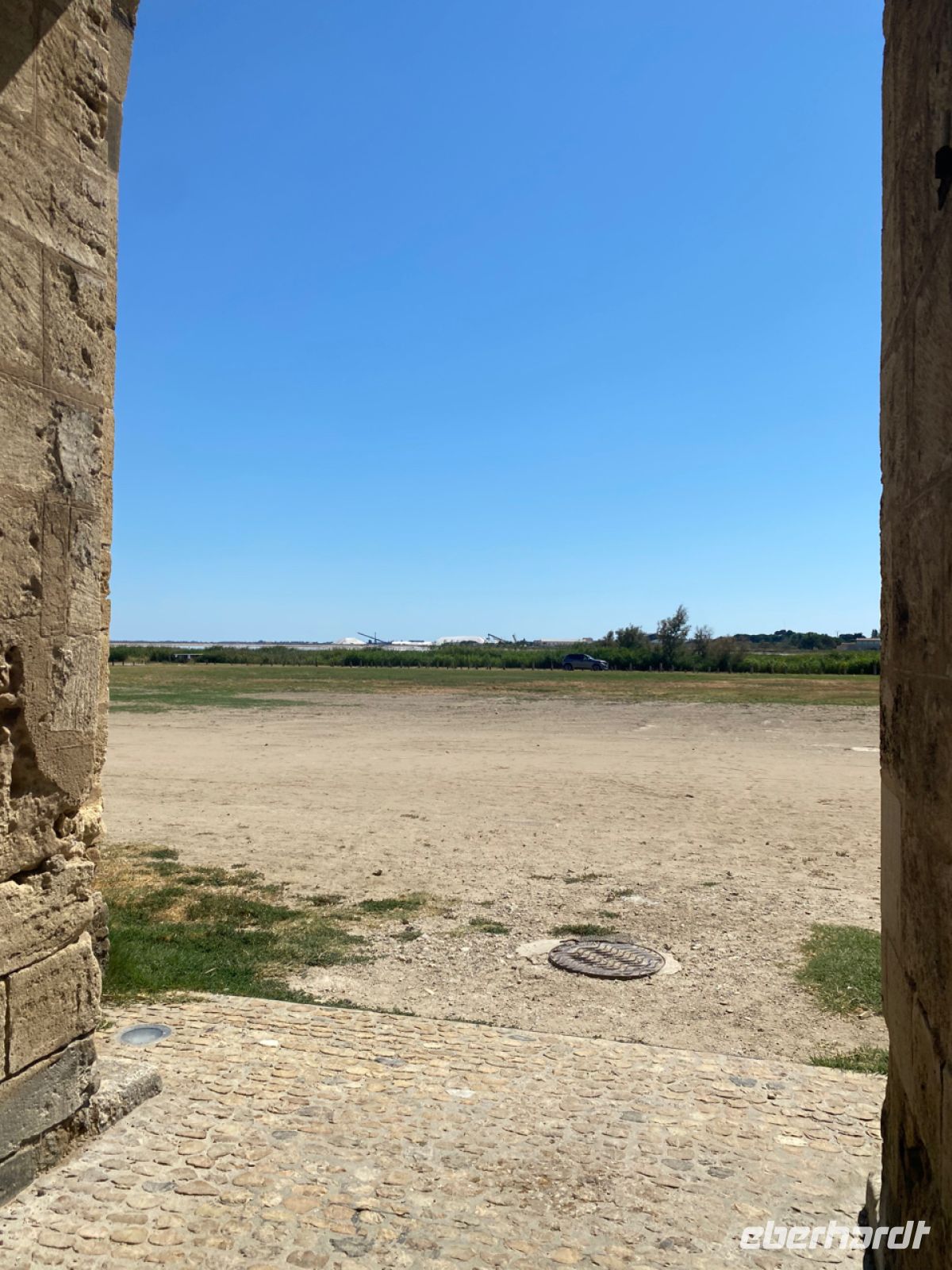 Nun gilt es, den Petit‑Rhône‑Fluss zu überqueren, keine so leichte Aufgabe, wenn die einzige Brücke weit und breit gesperrt ist. Natürlich finden wir einen Weg und erreichen am Westrand der sogenannten kleinen Camargue einen Ort mit dem seltsamen Namen Aigues‑Mortes. Inzwischen ist es sommerlich heiß geworden, wie gut, dass unser Bus sehr gute Kühlschränke hat, in denen sich ganz überraschend kalte Melonen für alle finden!