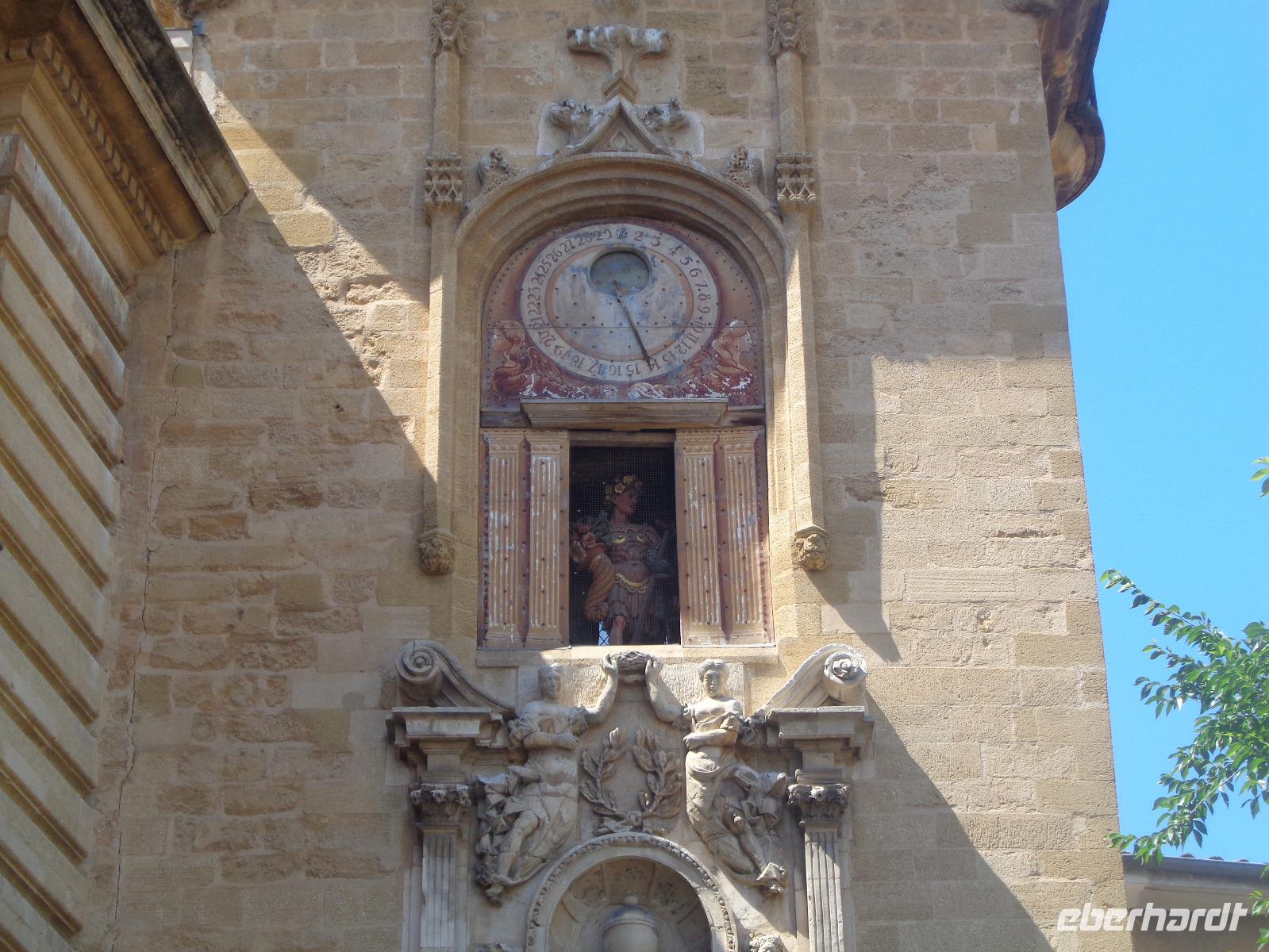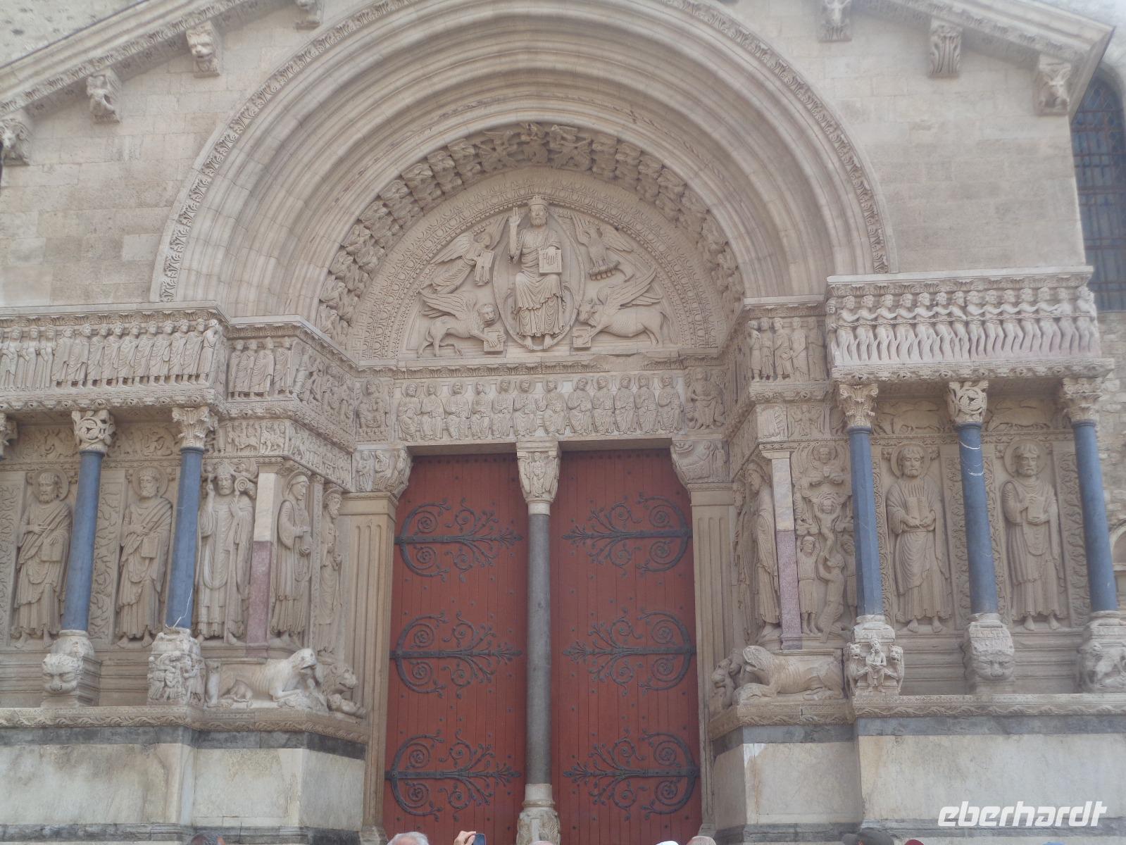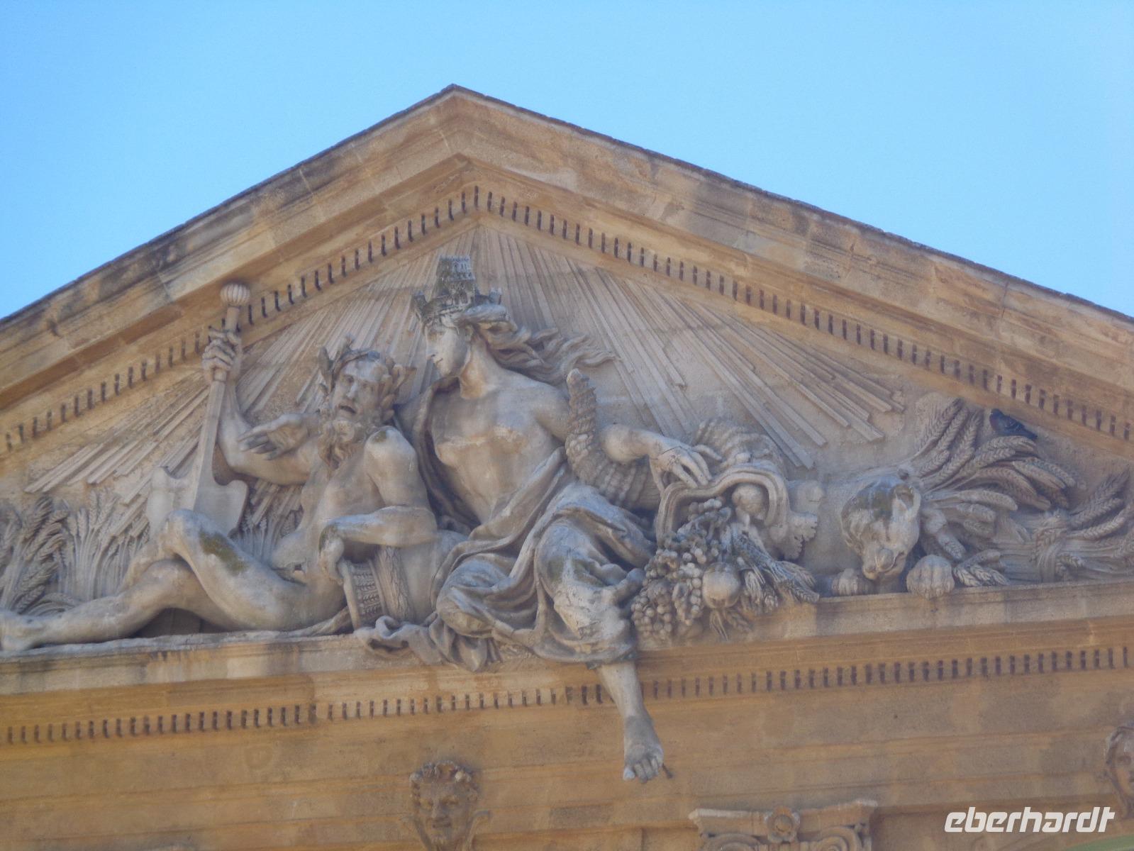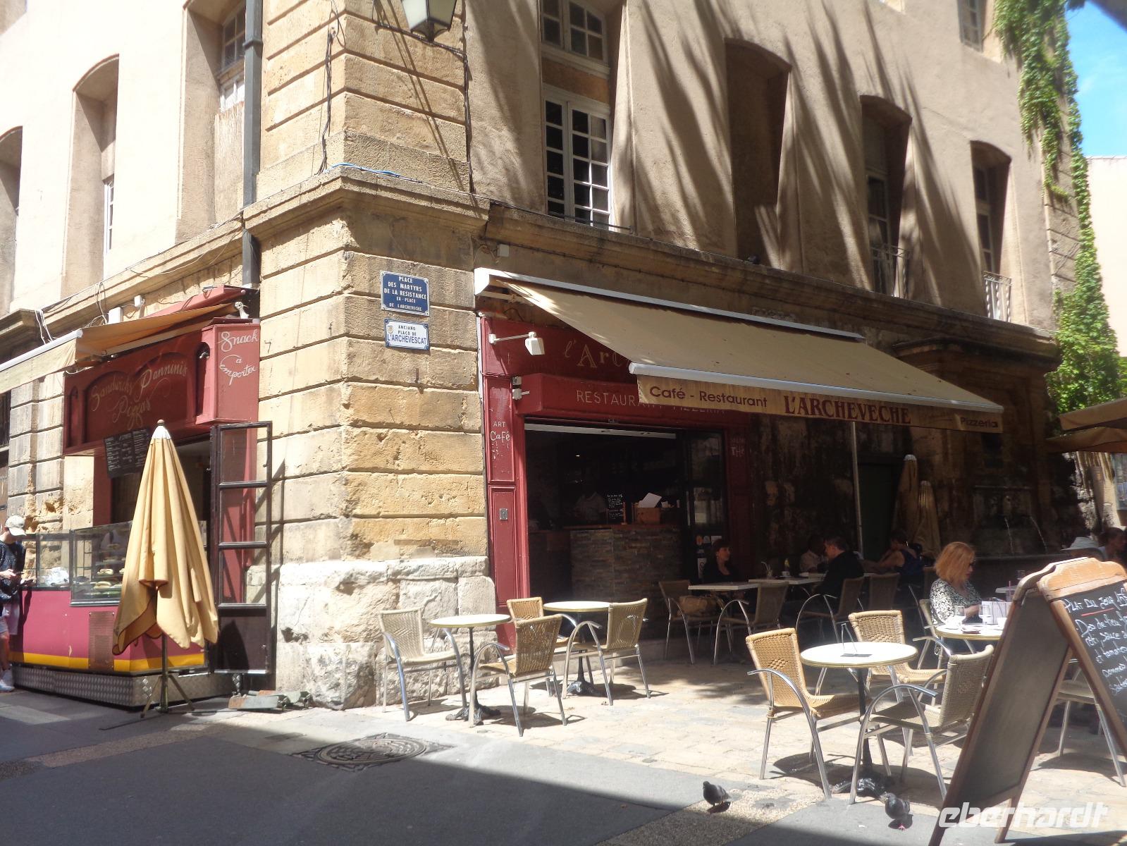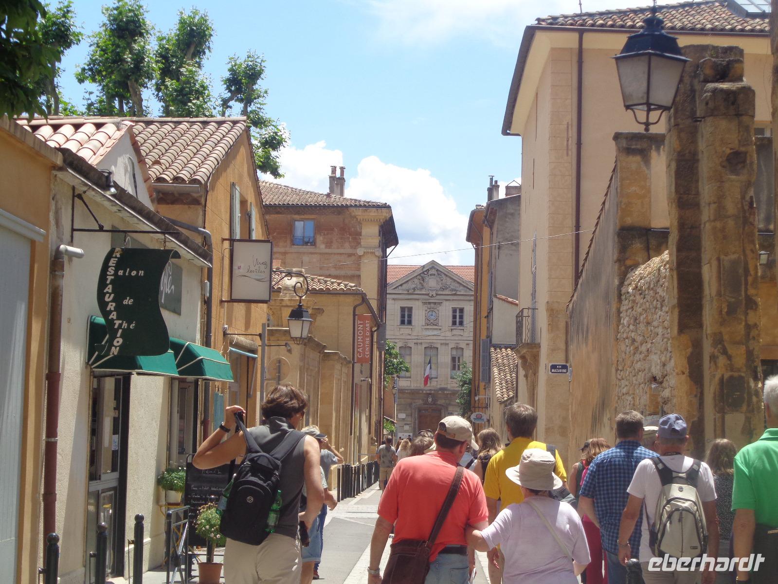 Nach unserem ausgiebigen Frühstück bringt uns heute Christian nach Aix-en-Provence, in die lichtdurchflutete und elegante Stadt, ca. 15 km westlich vom sogenannten Hausberg Sainte-Victoire entfernt. In Aix wird gebaut und heute finden auch die beliebten Wochenmärkte statt, die die Stadt besonders lebendig machen. Wir haben genügend Zeit, uns ins Gewühl zu stürzen, denn auf unsere örtliche Reiseleiterin Sonia mit ihrem sprühenden italienischen Charme treffen wir erst am frühen Nachmittag am Place de la Rotonde. Sie zeigt uns ihre Stadt mit viel Herzblut. Über Mittag wurden alle Marktstände rasant abgebaut und wir haben endlich Platz, die schönen Gebäude auf der Prachtstraße Cours Mirabeau zu betrachten. Die berühmte Brasserie "Les Deux Garcons" ist wieder voll besetzt. Hier tafelten Paul Cézanne und Émile Zola bis zu 3 Stunden. Aber auch Picasso, die Piaf und Camus waren hier Stammgäste und Stars und Sternchen der Neuzeit lieben dieses hübsche Restaurant der Belle Epoque ebenso. Wunderschön sind das Gebäude des Handelsgerichtes Hôtel Maurel de Pontevès mit seinen zwei Atlanten, Hôtel de Caumont und Hôtel de Gallifet. Im Collège Mignet beschützte Émile Zola seinen späteren unzertrennlichen Freund Paul Cézanne, den berühmten Sohn der Stadt. Aix hat viele hübsche Brunnen wie den der vier Delfine oder den des guten Königs René, der die Stadt im 15. Jhd. zur Blüte brachte. Wir treffen auf das Haus, in dem der Vater Paul Cézanne's ein Hutgeschäft führte und dann eine Bank gründete. Ein hübscher Brunnen steht auch auf dem Place d'Albertas, den wir passieren und über den Place d'Richelme zum Rathausplatz gelangen. Neben dem Rathaus steht der Turm mit der astronomischen Uhr und an der anderen Seite das alte Kornhaus mit seinem Relief von Rhône und Durance. Aix ist Sitz des Erzbischofs mit der Kathedrale Saint Saveur, die wir besichtigen. Danach kosten wir noch die berühmten Callissons und natürlich als Abschluss noch ein Eis. Auch dieser Tag hatte es wieder in sich. Christian bringt uns souverän nach Arles und wir tauschen bei unserem gemütlichen feinen Abendessen noch unsere Eindrücke aus.