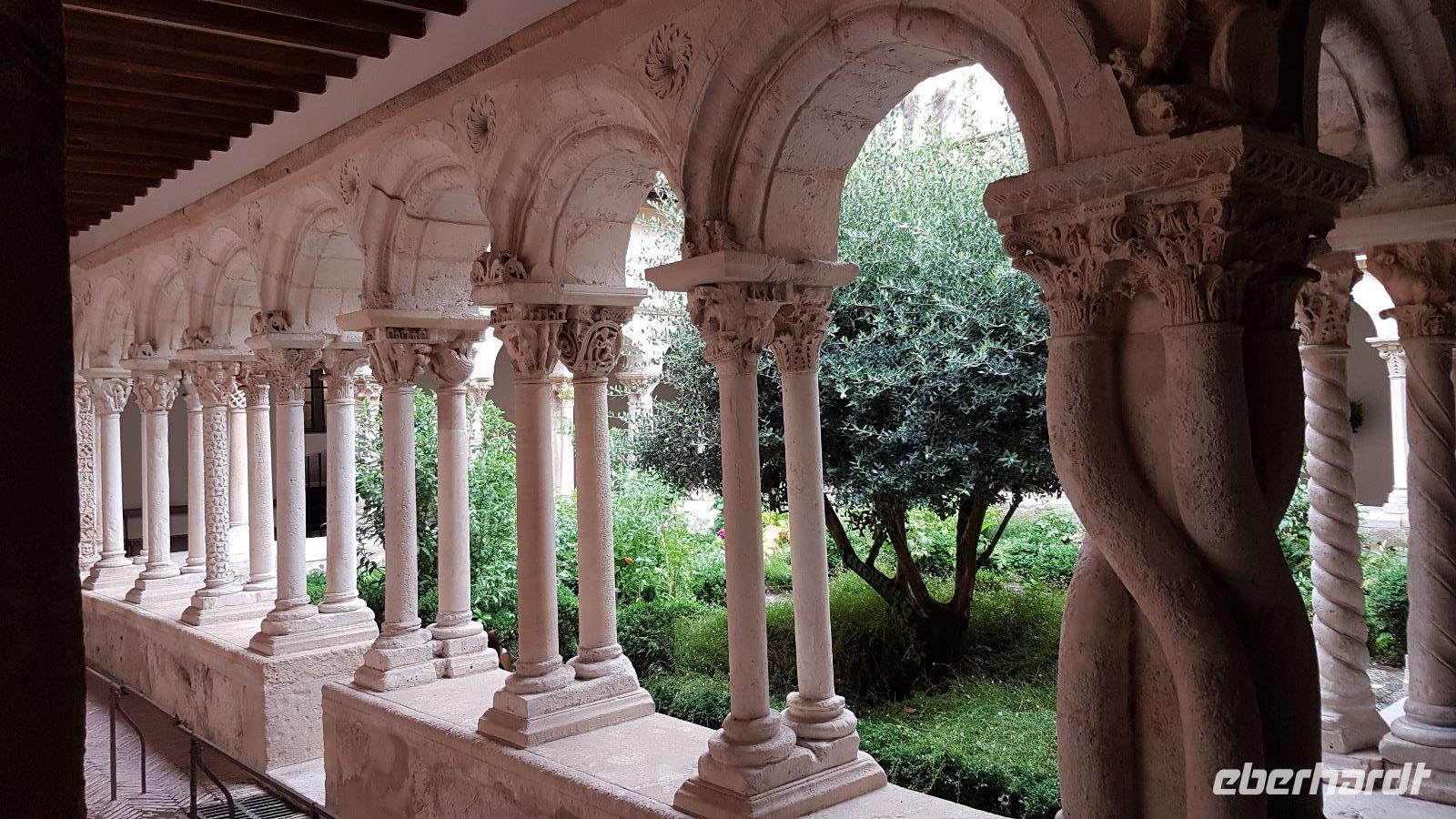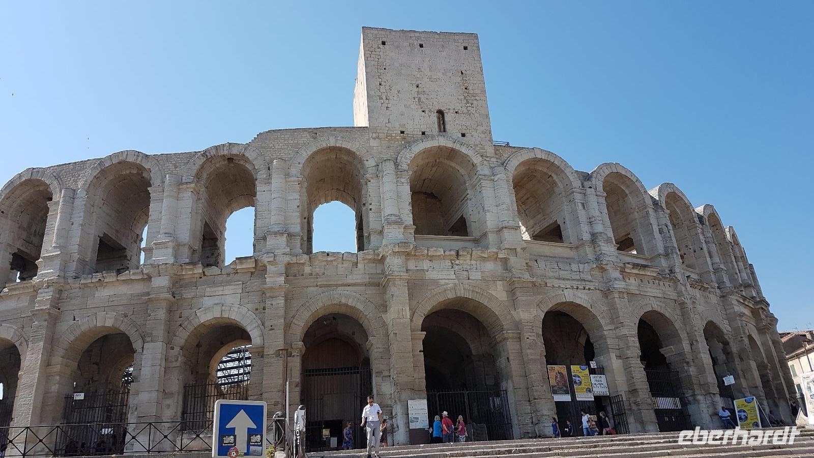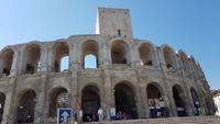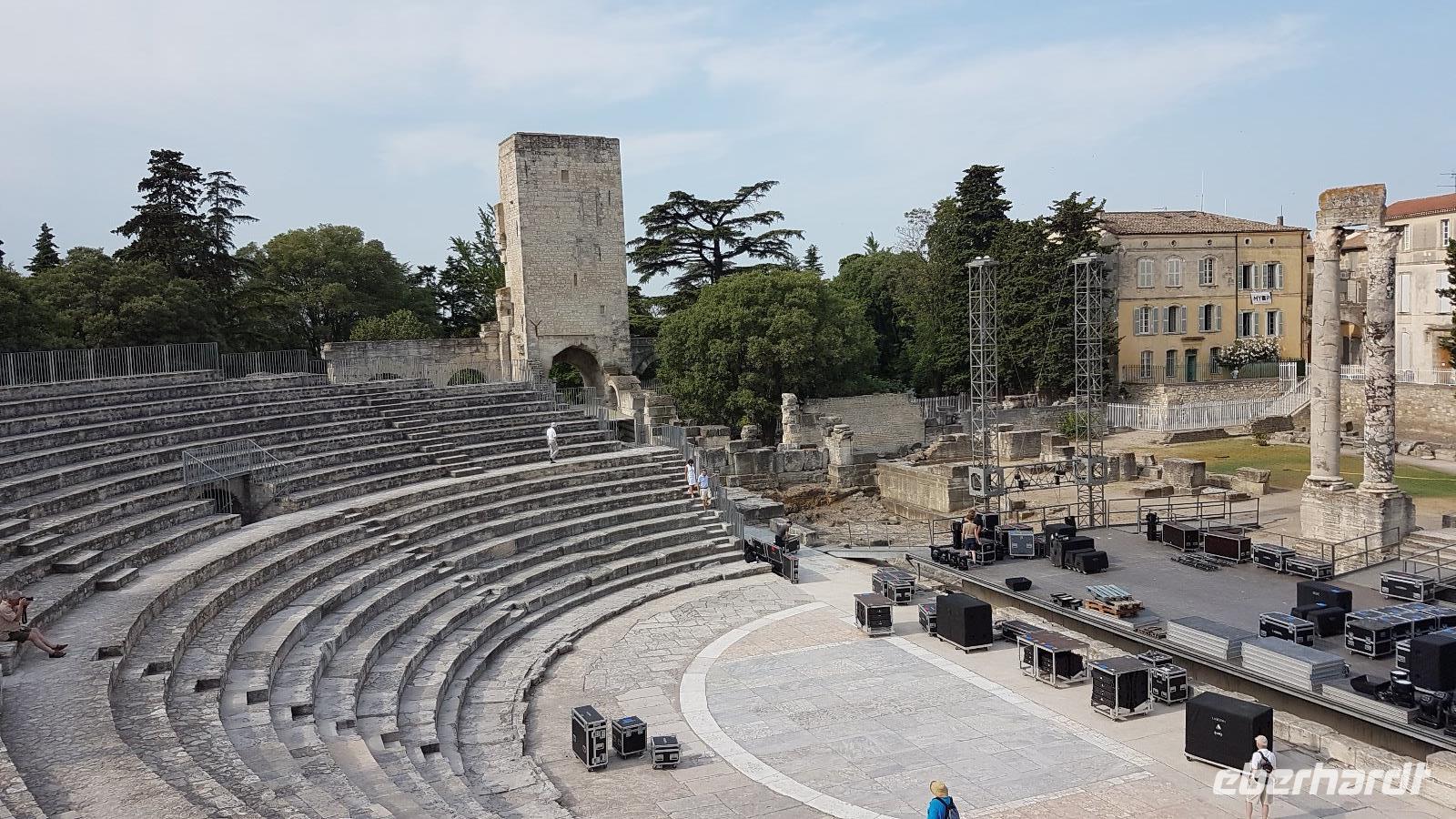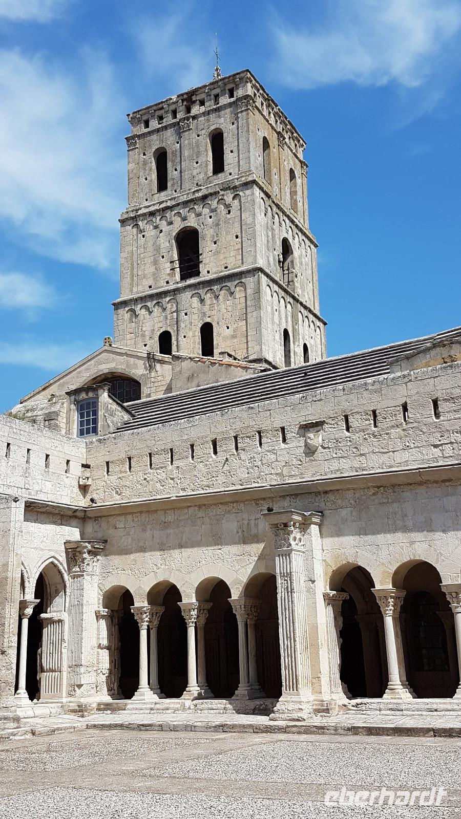 Wir fahren mit unserem netten Busfahrer Jérôme erstmal eine kurze Strecke bis zum Verkehrsverein von Arles, um unsere sympathische nierderländische Gästeführerin Astrid zu treffen. Sie zeigt uns das antike Theater (wo gerade ein Konzert für den "Süden" Musikfestival vorbereitet wird), die beeindruckenden Arenen (wo immer noch grosse Veranstaltungen stattfinden, darunter auch Stierkämpfe) und den sehr schönen Kreuzgang von der Saint-Trophime Kirche. Wir sehen auch mit ihr, unweit vom Bahnhof, die Stelle wo einst das Haus des Malers Vincent Van Gogh stand.