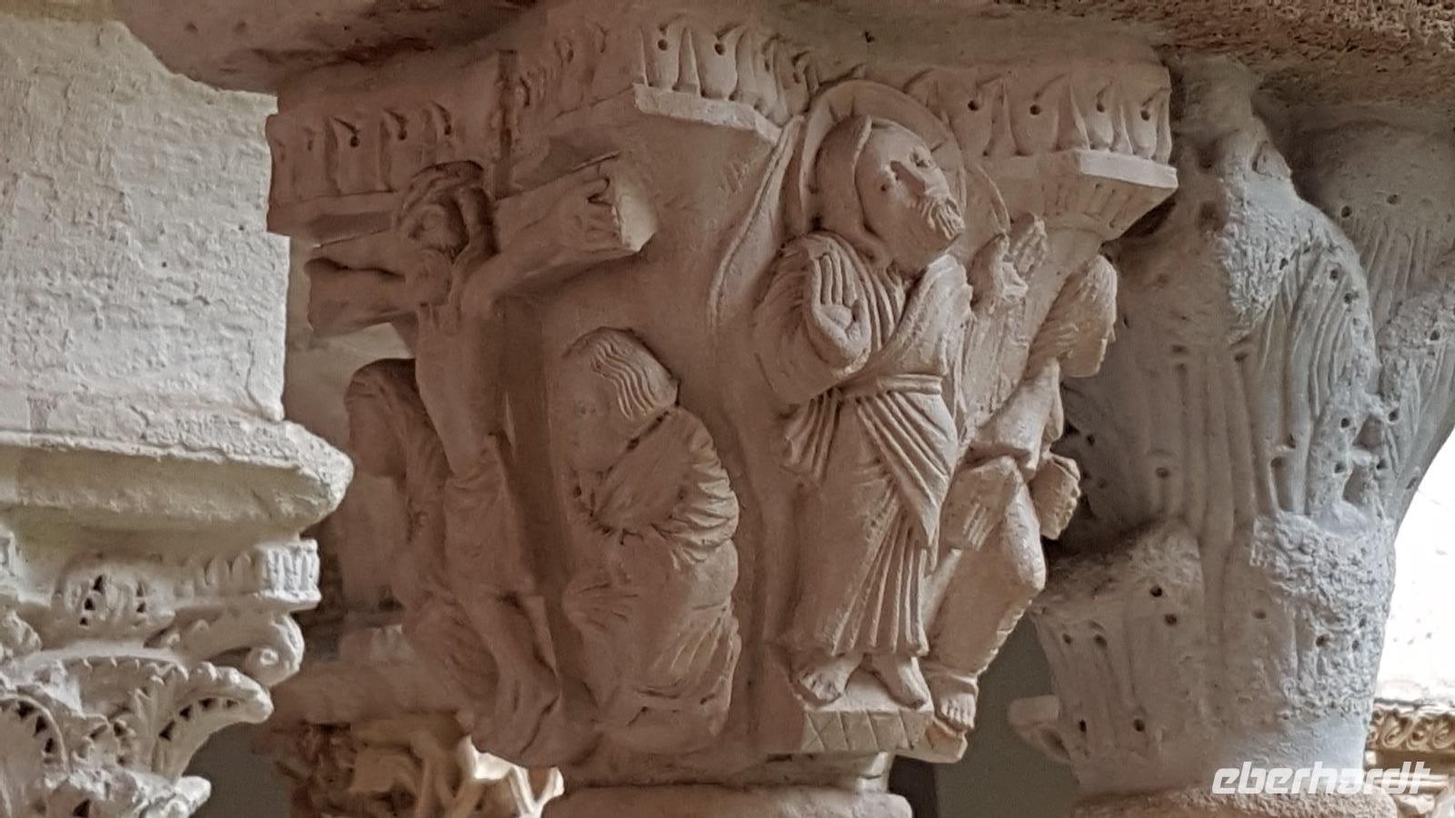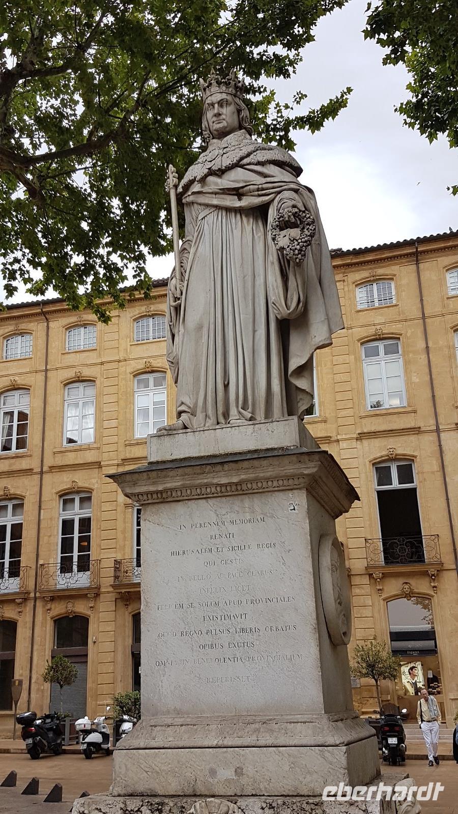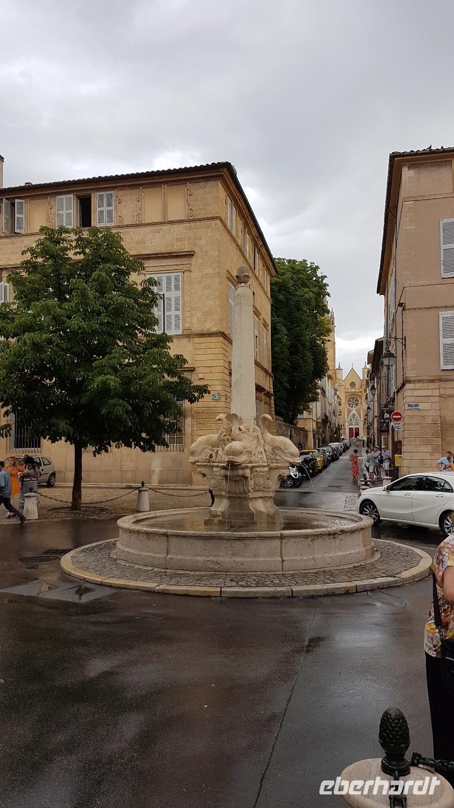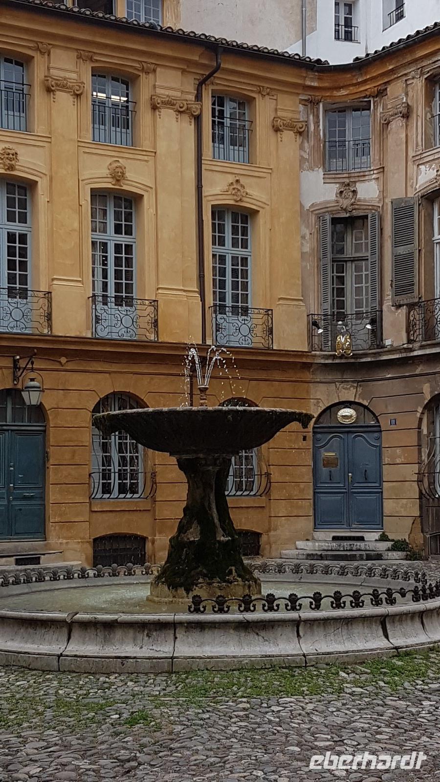 Heute fahren wir nach Aix-en-Provence, wo wir wieder Astrid treffen. Sie zeigt uns erst den Brunnen der 4 Delfine, einer der vielen Brunnen der Stadt, die für frische Luft sorgen. Wir sehen auch das Lycée (Gymnasium) Mignet, wo viele Prominente studiert haben, zum Beispiel Cézanne und Zola. Bald sind wir nach ein paar Tropfen aus dem Himmel vor dem Hôtel de Caumont, ein schöner Palast vom 18. Jahrhundert, der jetzt ein erstklassiges Kunstzentrum mit tollen Ausstellungen beherbergt. Dann laufen wir am Cours Mirabau vorbei, die Hauptachse der Stadt, wo man sieht und sich sehen lässt. Die Statue des « guten Königs René » grüsst uns auf dem Weg, und wir entdecken bald durch die Passage Agard, die sehr schön renoviert wurde, den grossen Justizpalast. Aix-en-Provence hat eine historische Tradition als Stadt des Rechts, und es gibt immer noch eine hoch angesehene Jura-Fakultät bei der dortigen Uni. Wir erreichen bald den Albertas-Platz, vermutlich der schönste der Stadt, der wie eine wunderbare Theaterkulisse wirkt. Dann geht es zum Rathausplatz mit dem netten Markt zur Kathedrale Saint-Sauveur, wo wir das historische Taufbecken (Baptisterium) vom 4. Jahrhundert sehen, bevor wir den wunderschönen Kreuzgang mit feiner Steinmetzarbeit bewundern.