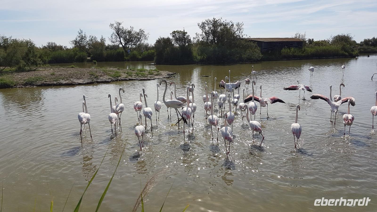 Der heutige Tag ist der Camargue gewidmet : schwarze Stiere, weisse Pferde, Flamingos, Reisfelder und Salzbecken sind also zu erwarten. Wir starten mit einer schönen Entdeckung der lokalen Landschaft und Fauna im Vogelpark Pont de Gau, wo man bei verschiedenen Teichen sehr viele Flamingos und Reiher aber auch Nutrias sehen kann. Es tut gut, ein bisschen frische Luft nach den vielen Stadtbesichtigungen zu schnappen !