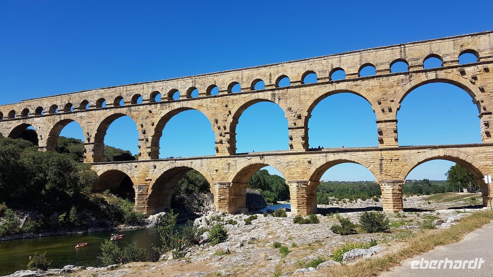 Nach Freizeit mit Mittagessen fahren wir zum Pont du Gard, ein Meisterwerk der römischen Ingenieure, eigentlich ein Aquädukt des 1. Jahrhunderts, also eine riesige Wasserleitung, die erst im Mittelalter als Brücke benutzt wurde. Napoleon war von der Einrichtung so beeindruckt, dass er die Wasserleitung restaurieren liess. Die 3 Etagen mit majestätischen Bögen haben den Schriftsteller Stendhal so sehr bewegt, dass er sich fragte, warum er bloss kein Römer war.