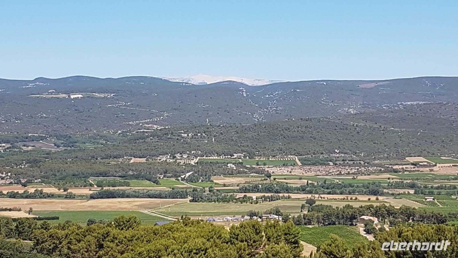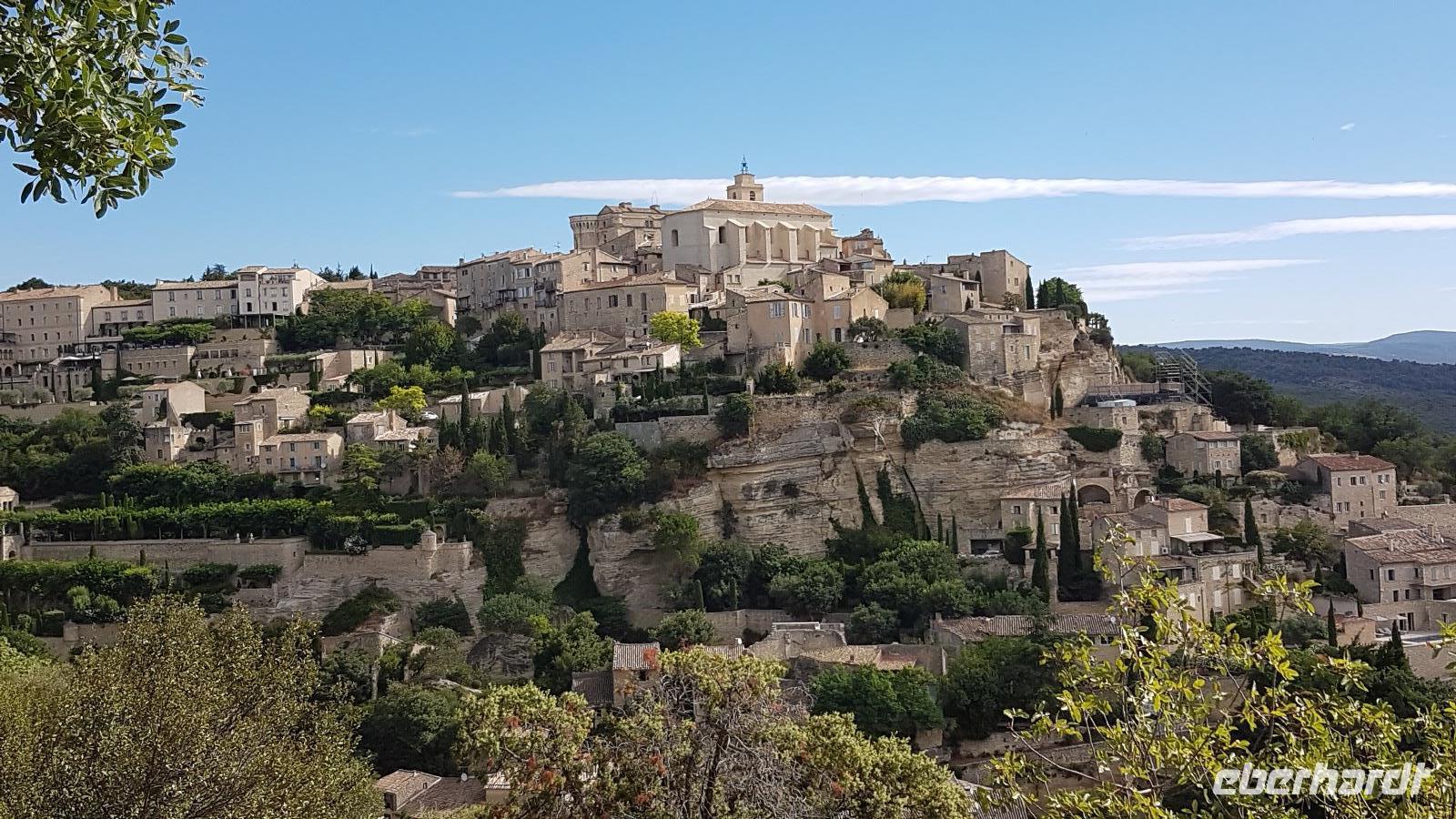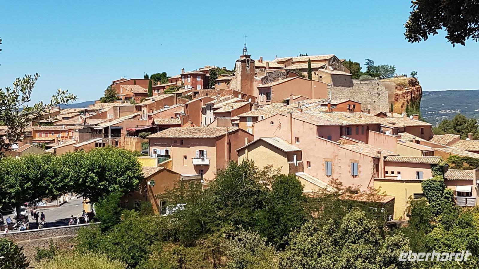Dann fahren wir nach Roussillon: das malerische Dorf, wo die Farben rot und ocker die Fassaden prägen, lädt gemütlich zum Bummeln ein. Von dort gibt es auch eine herrliche Aussicht auf die Tiefebene sowie auf die umliegenden Berge, selbst die kahle Spitze des Mont Ventoux ist gut zu sehen.