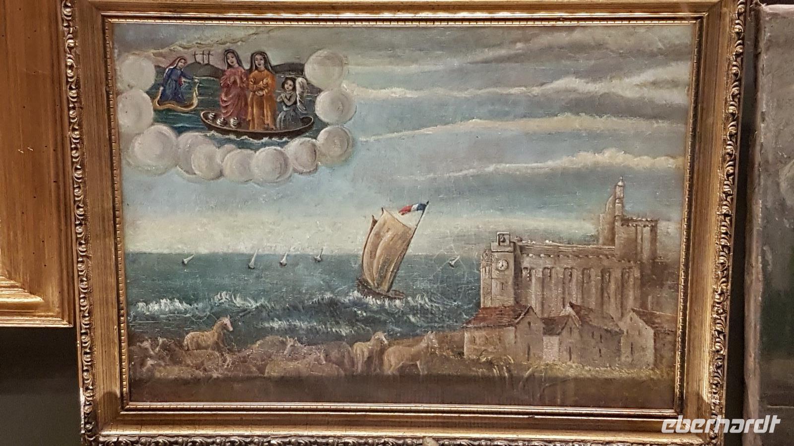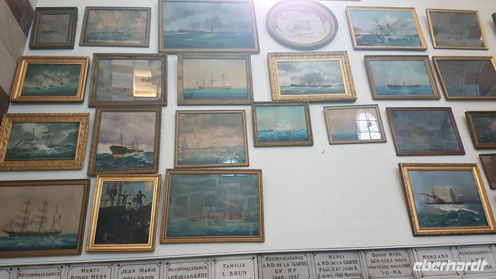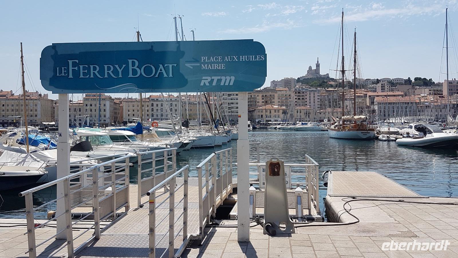 Durch die hoch gelegene « Route de la Gineste » mit tollen Panoramablicken fahren wir nach Marseille, wo wir unsere sympathische Gästeführerin Josiane Bercier am Stade Vélodrome (hochmodernisiertes Fussballstadion) treffen. Durch den edlen Boulevard du Prado, wo es noch Prachtvillen gibt, und die wunderbare Panoramastrasse Corniche, die am Meer entlang fährt, kommen wir zu Notre-Dame de la Garde. Unser Busfahrer Jérôme hat noch einmal seine berufliche Fähigkeiten gezeigt, da die Strasse bis dort oben am Hügel ziemlich eng ist und selbst für Autos nicht einfach zu besteigen ist. Wir können jetzt das Wahrzeichen von Marseille, « La Bonne Mère », die gute Mutter, besichtigen. Die Kirche ist im 19. Jahrhundert im neo-byzantinischen Stil erbaut worden, noch mehr als sonst in der Provence fallen viele Ex-Votos auf, einfache Wandtafeln, naive Gemälde und sogar von der Decke hängende Bootsmodelle (auch ein Brandlöschflugzeug!) sind dort ausgestellt. Von der Panoramaterrasse um die Kirche herum hat man einen unglaublichen Ausblick auf die ganze Stadt und die vorgelagerte Inselgruppe. Dann zeigt uns Josiane die Canebière, die Hauptachse der Stadt, die zum Vieux-Port (alter Hafen) führt, die neuen Hafenanlagen mit Riesenfähren nach Korsika und Nordafrika, und das Palais Longchamp, ein echtes palastartiges Wasserschlosss, wo gerade für ein Musikkonzert geübt wird. Am Vieux-Port sehen wir auch die urige Fähre, die von einer Seite des Hafens zur anderen fährt.