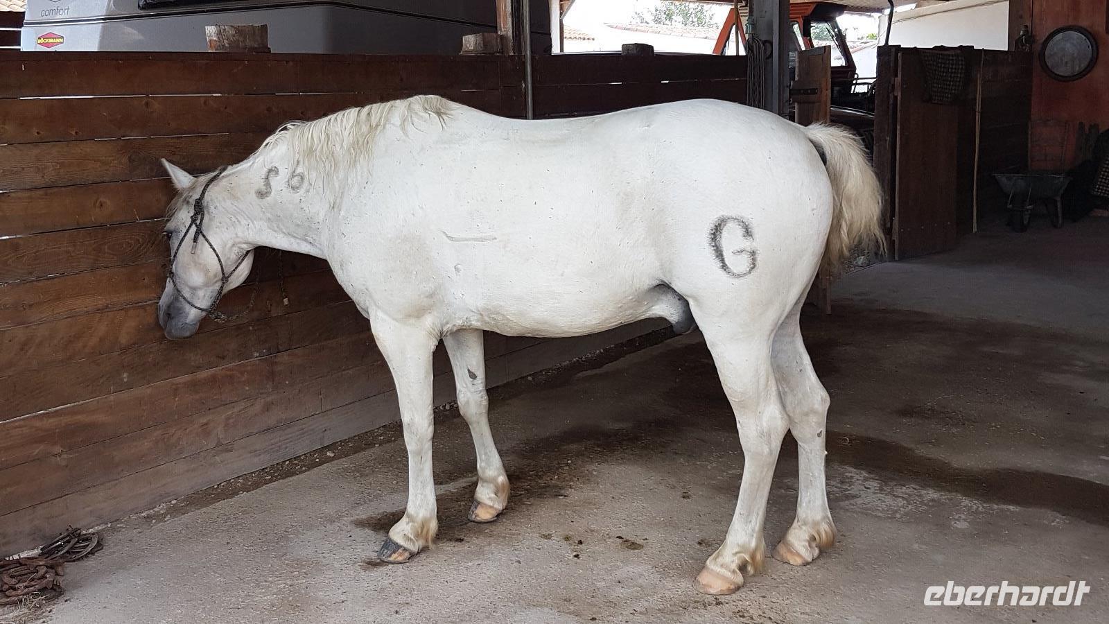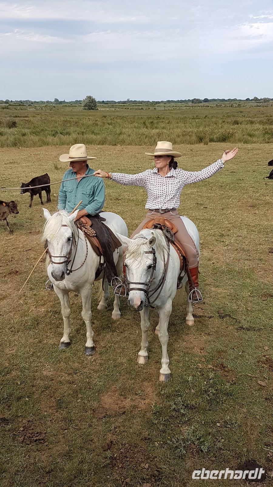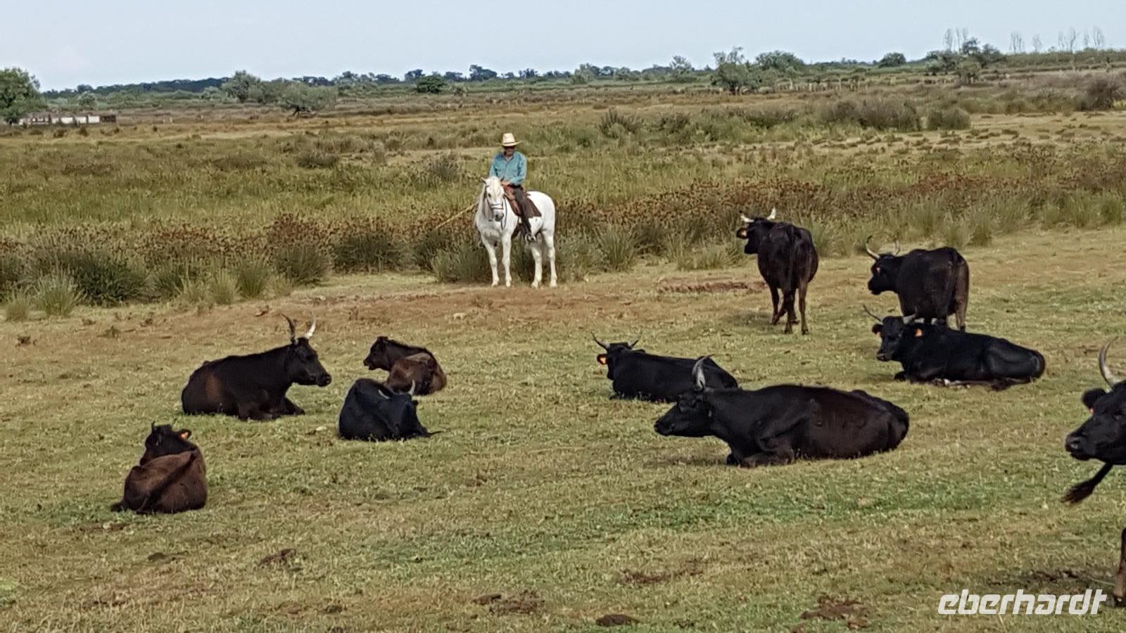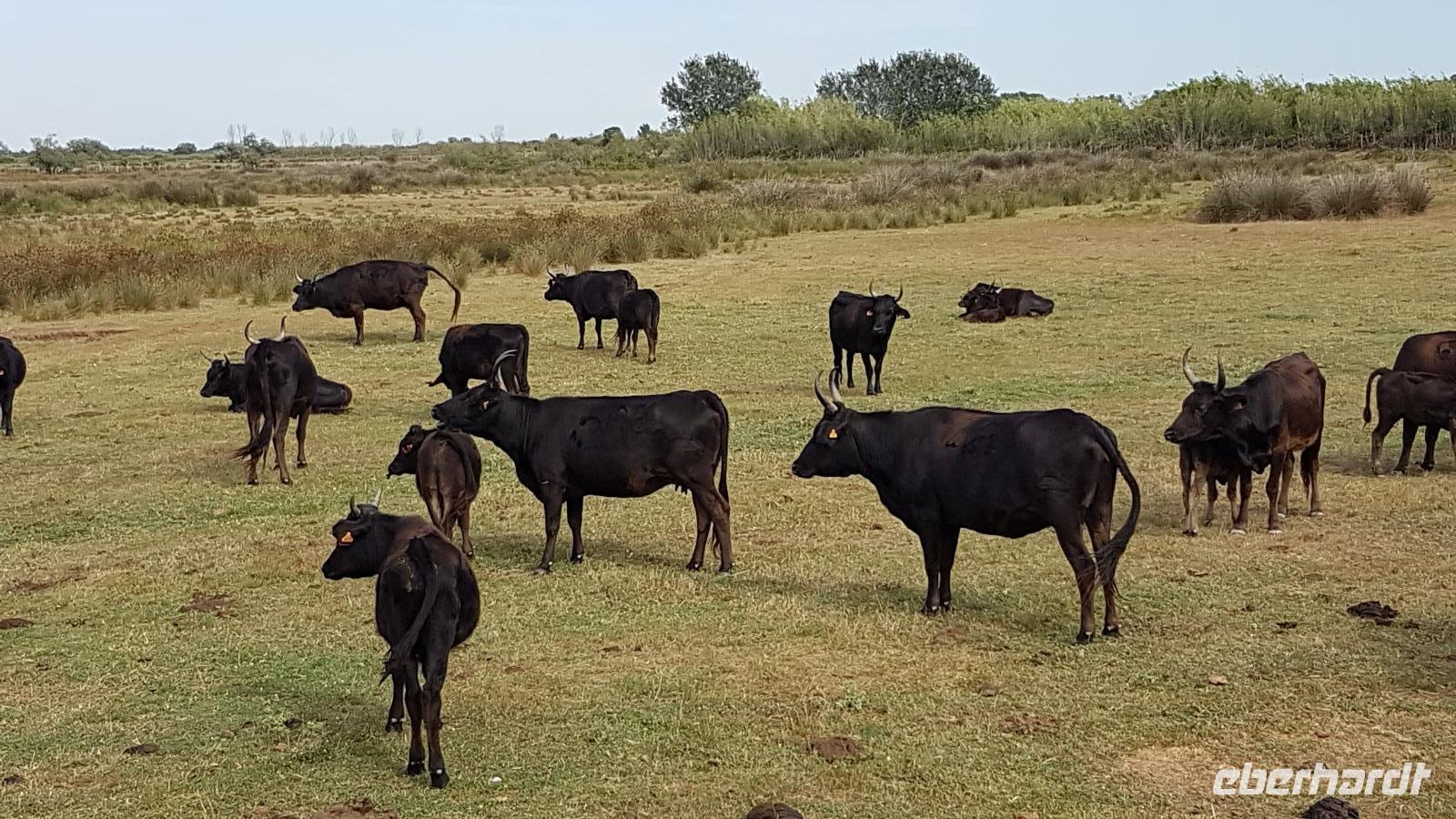 Dann fahren wir zu einer typischen Einrichtung der Camargue, eine Manade, wo die schwarzen Stiere gezüchtet werden. Wir werden dort von der Kölnerin Stefanie auf ihrem weissen Pferd begrüsst, bevor wir auf einem traktorgezogenen Wagen direkt an eine Stierherde fahren. Von dort aus können wir in Sicherheit die gewichtigen Tiere mit ihren grossen Hörnern aus der Nähe betrachten, ziemlich verblüffend ! Es macht aber hungrig, es wird also Zeit für eine typische Mahlzeit der Camargue, eine Art Stiergulasch mit Reis, die in einem schönen Innenraum der Manade verzehrt wird.