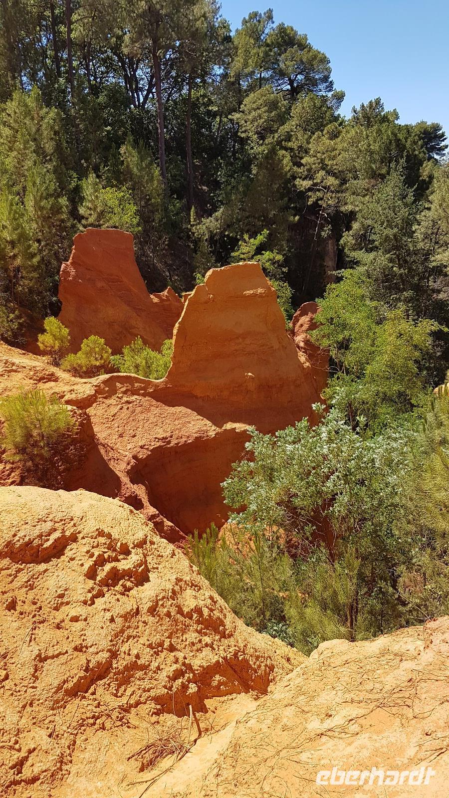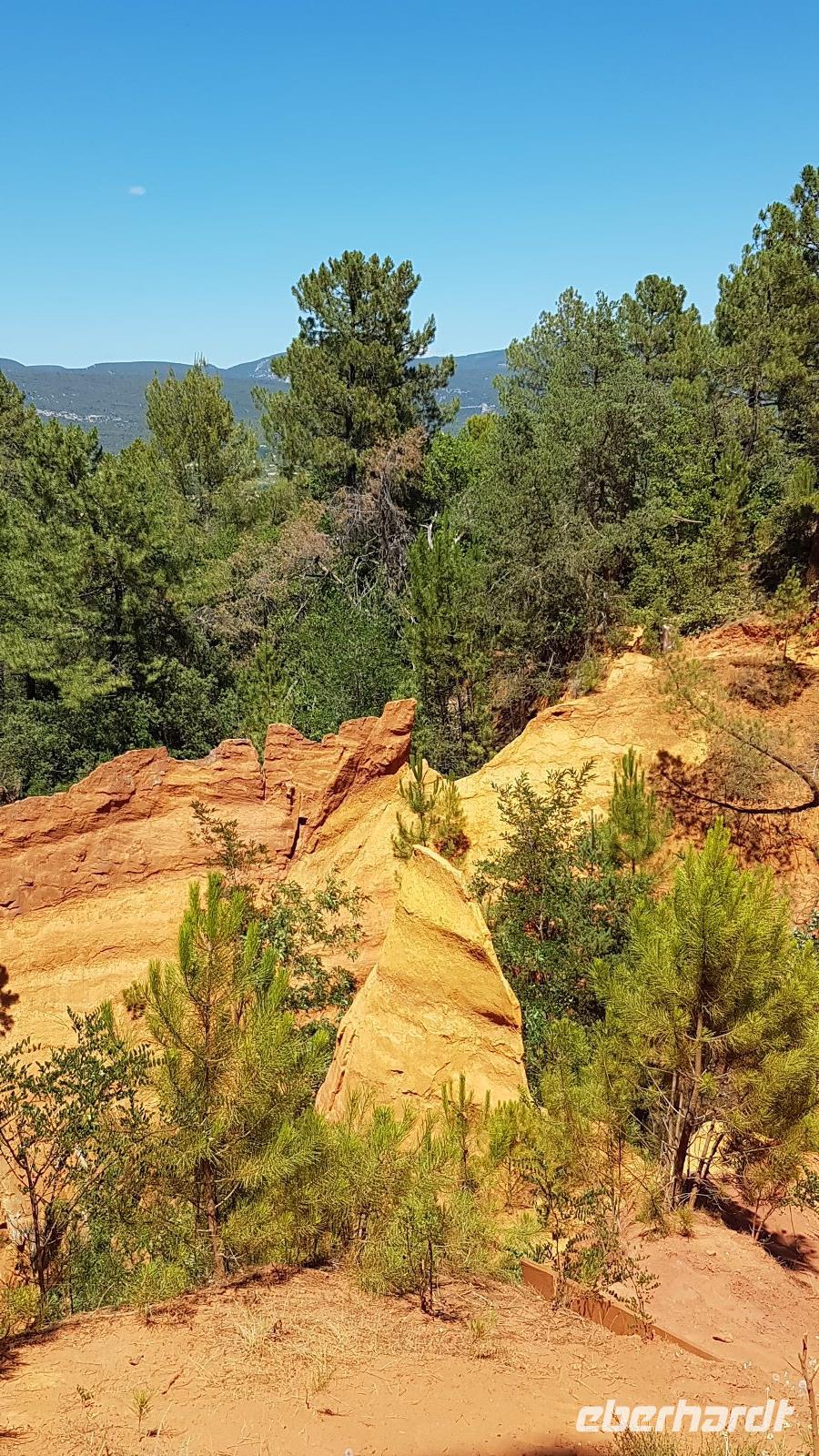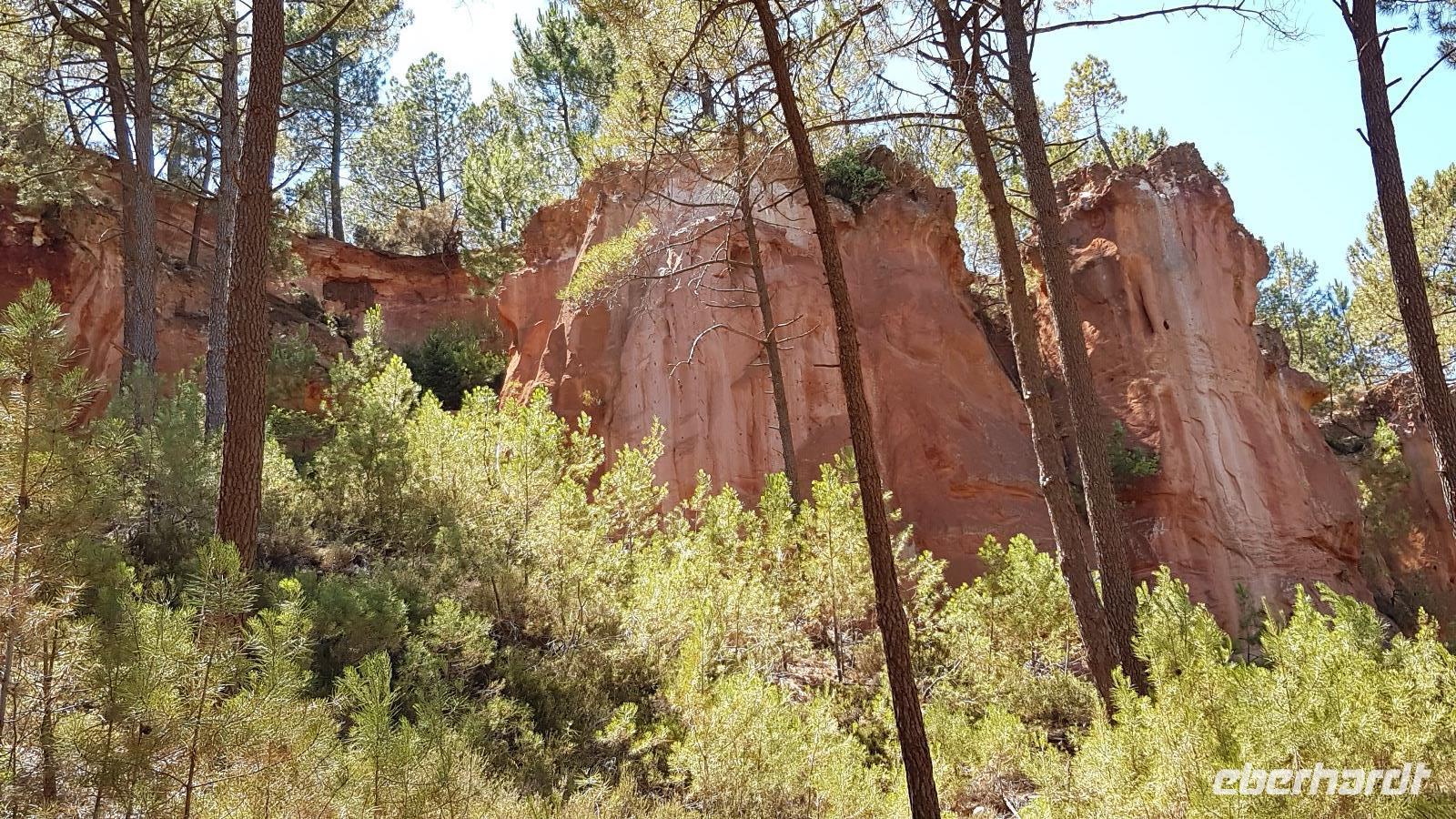 Nachdem wir uns im Dorf mit guten provenzalischen Spezialitäten gestärkt haben, geht es los auf dem Ockerweg, ein alter Steinbruch, der sehr geschickt als Lehrpfad eingerichtet wurde. Dort sind sehr ungewöhnliche ockerfarbige Felsformationen sowie knallrote Riffs zu bewundern.