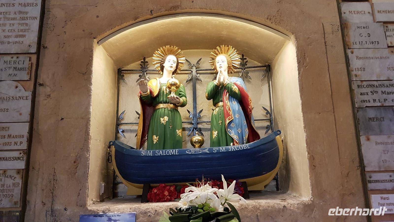 Saintes-Maries-de-la-Mer ist für ihre Zigeuner-Pilgerfahrt am 24. Mai bekannt, wir sehen in der Krypta von der Wehrkirche Notre-Dame de la Mer die Statue und die Reliquien der Schwarzen Sara, Schutzpatronin der Zigeuner. Eine kleine Barkasse mit Statuen der beiden Marien, Maria Kleophae und Maria Salome, ist auf der linken Seite des Hauptschiffes zu sehen. Die Reliquien der zwei Heiligen sind in der oberen Kapelle (nicht zugänglich) aufbewahrt. Neben der Zigeunerpilgerfahrt gibt es hier zwei andere Pilgerfahrten, die den Marien gewidmet sind. Man kann durch eine Treppe auf einer Aussengalerie am Kirchdach eine schöne Aussicht über die Stadt und das Meer geniessen. Die Freizeit vor Ort ermöglicht eine Runde in der kleinen Stadt zu drehen, oder am Strand im Mittelmeer zu baden.