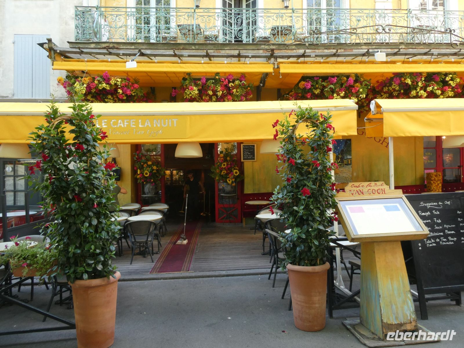 Nach einem ausgiebigen Frühstück mit frisch gebackenem Brot, französischem Käse und selbstgemachten Marmeladen starten wir unseren Stadtrundgang zu Fuß von unserem Hotel aus. Wir überqueren die Brücke von „Trinquetaille“ und tauchen auf der anderen Seite in die Altstadt von Arles ein. Unser erstes Ziel ist der Platz wo sich einst das römische Forum befand und so auch heute noch genannt wird: "Place du Forum". Eine Säule aus der Zeit des Kaiser Trajan in einer Hotelfassade kündet noch von dieser fernen Epoche. In der Mitte des Platzes steht eine Skulptur des provenzalischen Dichters „Frederic Mistral“ und am Rande erkennen wir das „Café de nuit“ welches der Maler Van Gogh in seinen Bildern verewigt hat. Man lebt hier nicht schlecht vom Malergenius.