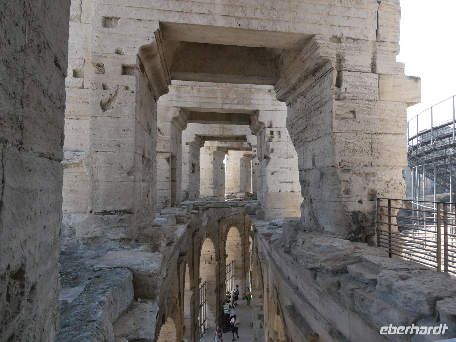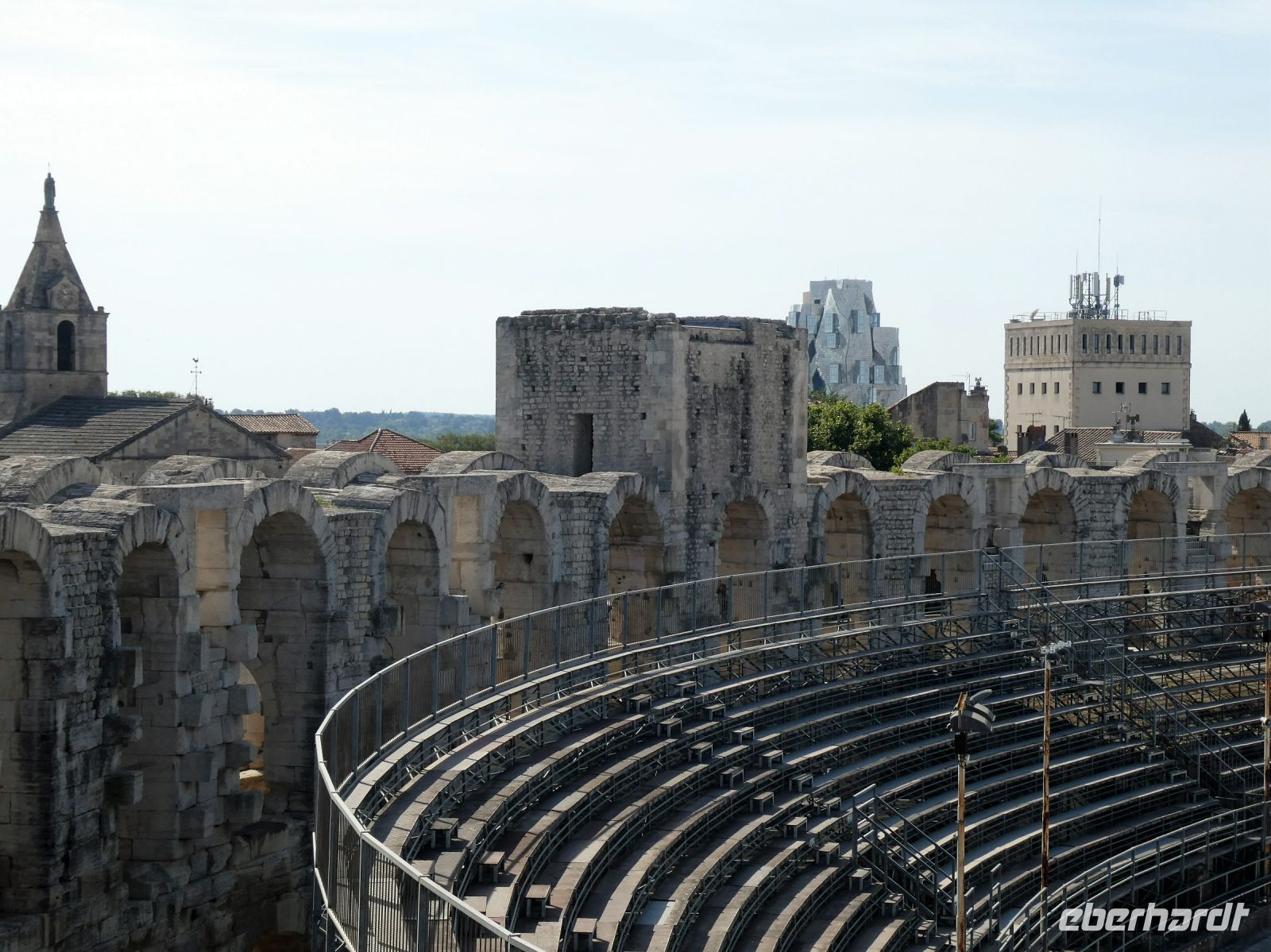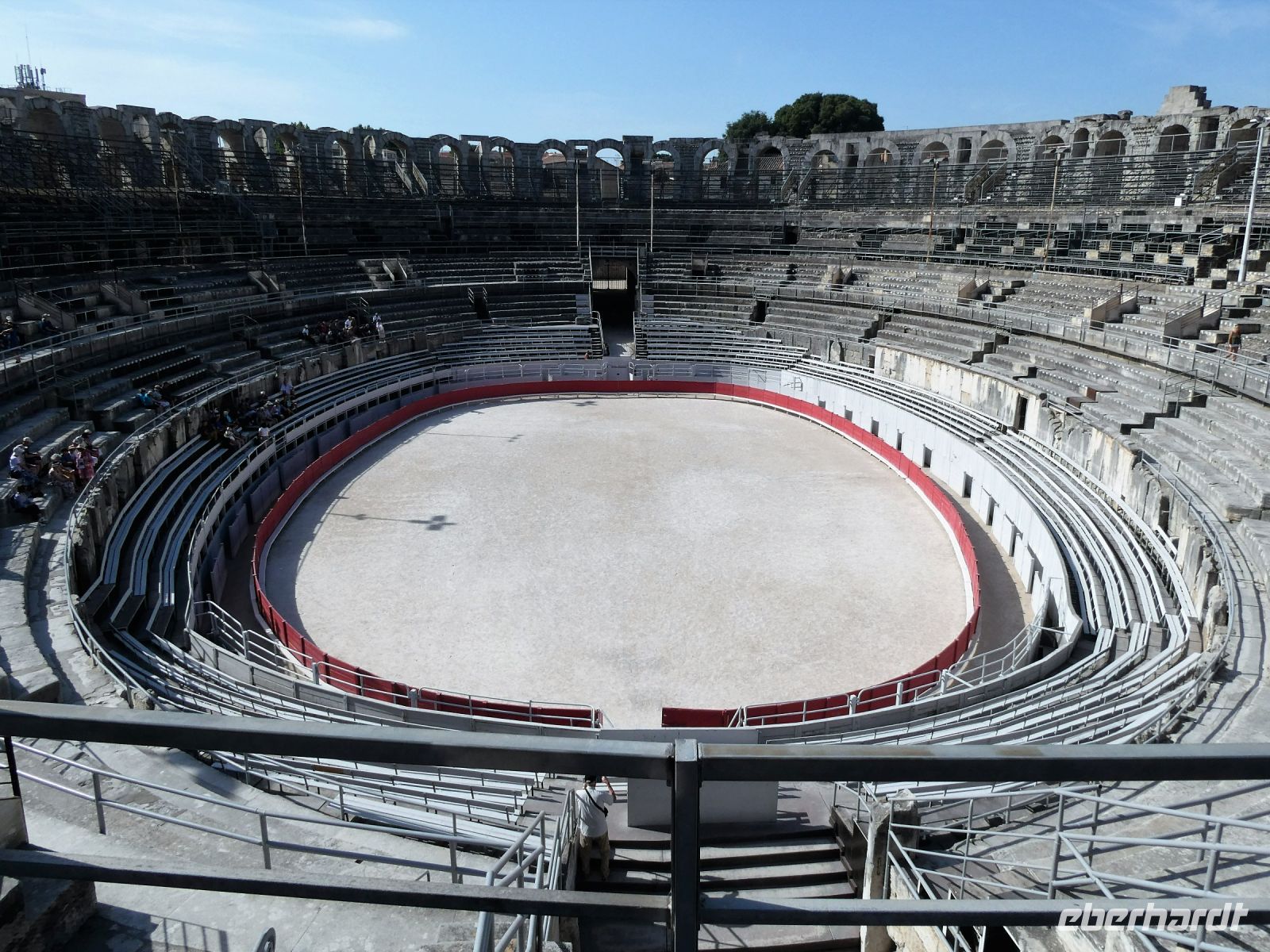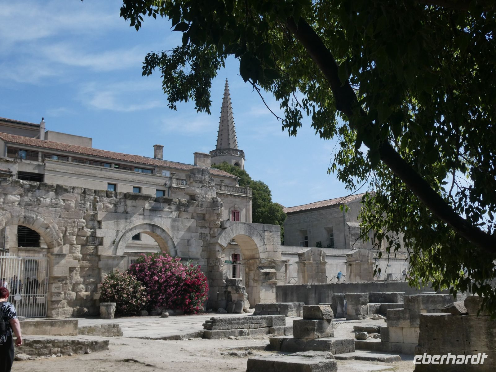 Wir wenden uns jetzt in Richtung römische Arena von Arles, die wir besichtigen wollen. Wir hoffen auf noch wenige Reisegruppen, da wir für südfranzösische Verhältnisse noch früh dran sind. Vor der Arena spielt eine Sologitarristin gängige Stücke zur Ermunterung der Allgemeinheit. Die Arena, welche heute noch zu bestimmten Zeiten für den sog. Französischen Stierkampf und andere Veranstaltungen genutzt wird, ist noch wenig besucht und wir nehmen uns Zeit, sie ausgiebig anzuschauen. Sie ist noch sehr gut erhalten und von den Türmen hat man einen phantastischen Blick in die Umgebung von Arles, liegt die Arena doch auch leicht erhöht. Aber hoch sind die Stufen und es ist schon beachtlich heiß.