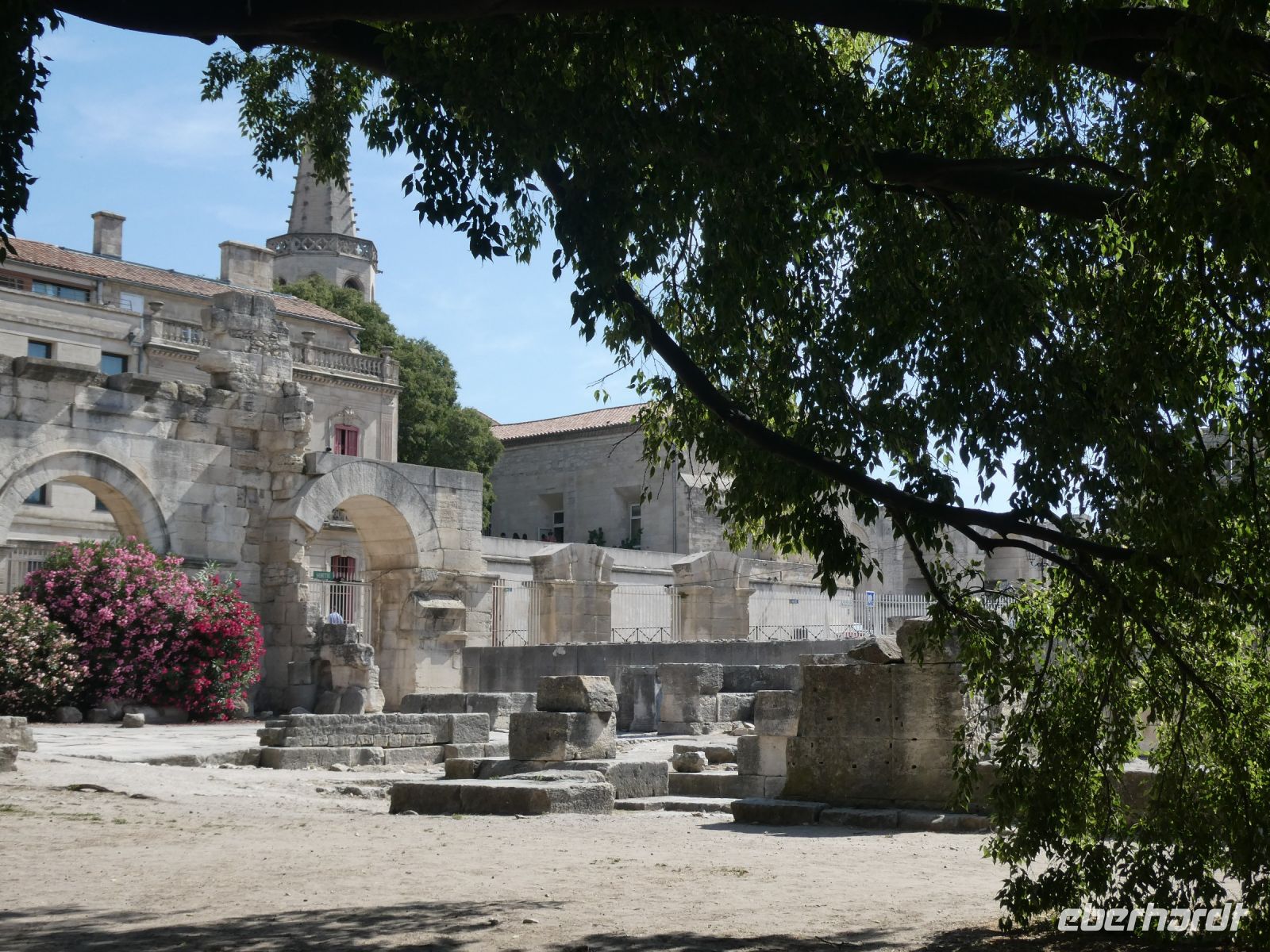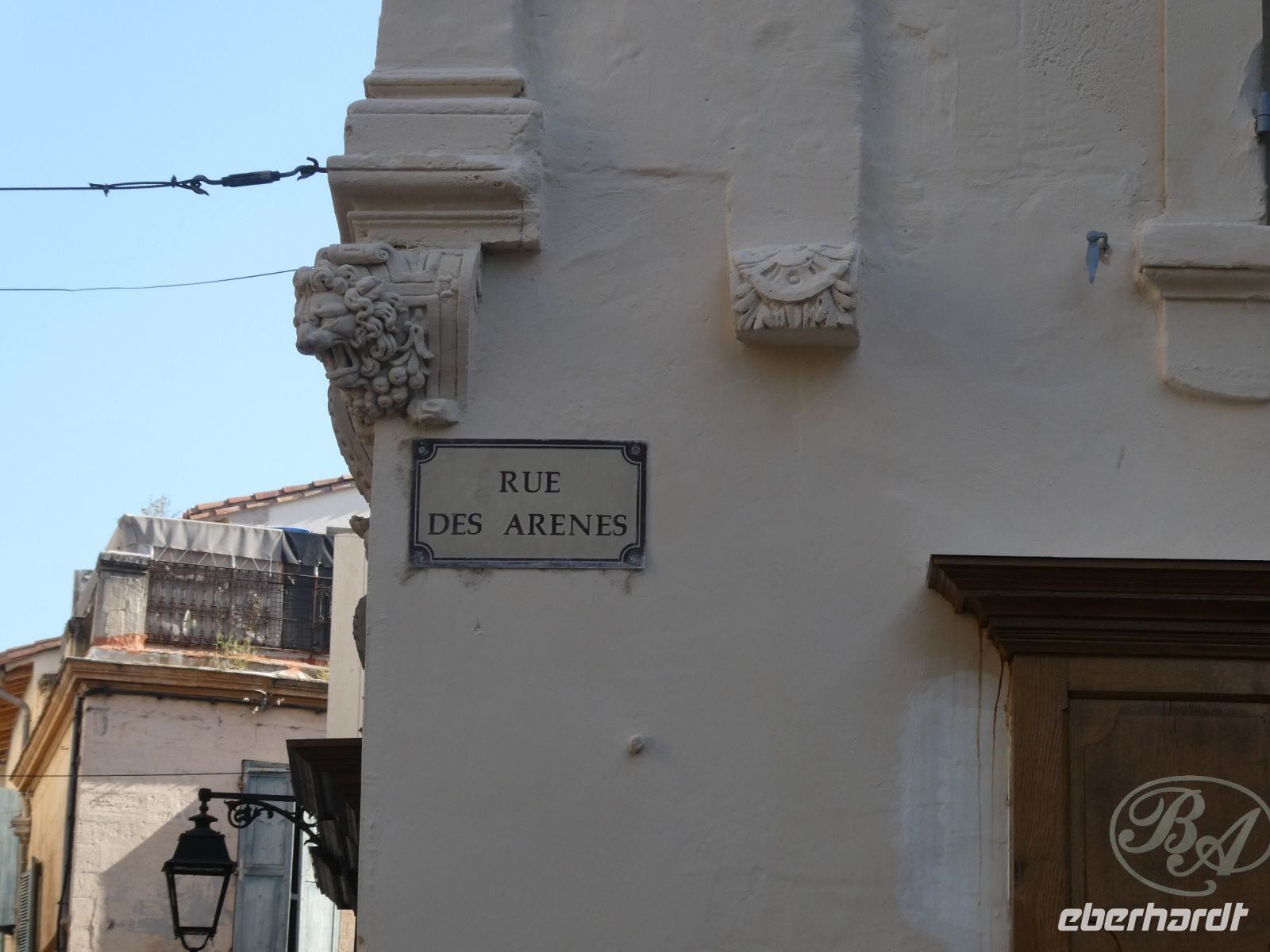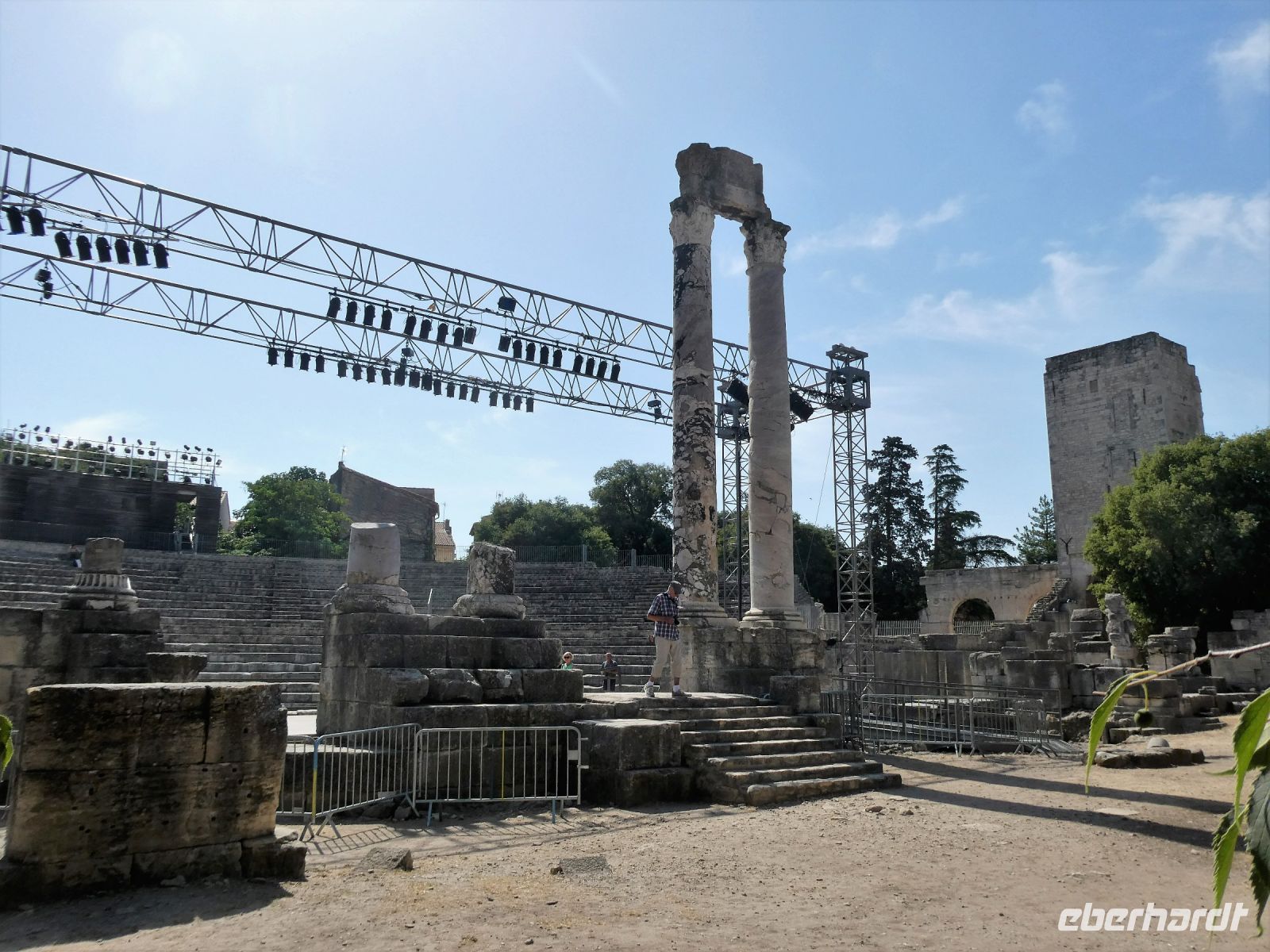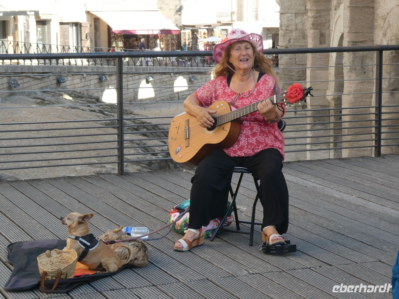 Wir wenden uns jetzt in Richtung römische Arena von Arles, die wir besichtigen wollen. Wir hoffen auf noch wenige Reisegruppen, da wir für südfranzösische Verhältnisse noch früh dran sind. Vor der Arena spielt eine Sologitarristin gängige Stücke zur Ermunterung der Allgemeinheit. Die Arena, welche heute noch zu bestimmten Zeiten für den sog. Französischen Stierkampf und andere Veranstaltungen genutzt wird, ist noch wenig besucht und wir nehmen uns Zeit, sie ausgiebig anzuschauen. Sie ist noch sehr gut erhalten und von den Türmen hat man einen phantastischen Blick in die Umgebung von Arles, liegt die Arena doch auch leicht erhöht. Aber hoch sind die Stufen und es ist schon beachtlich heiß.