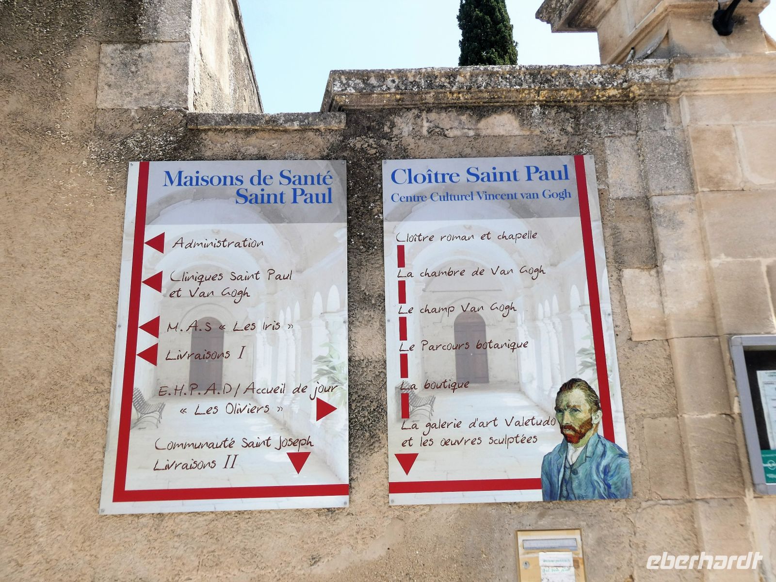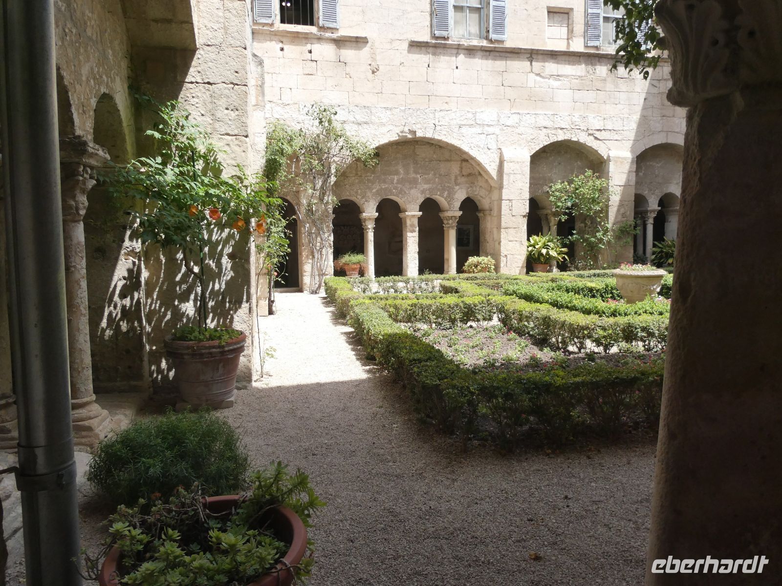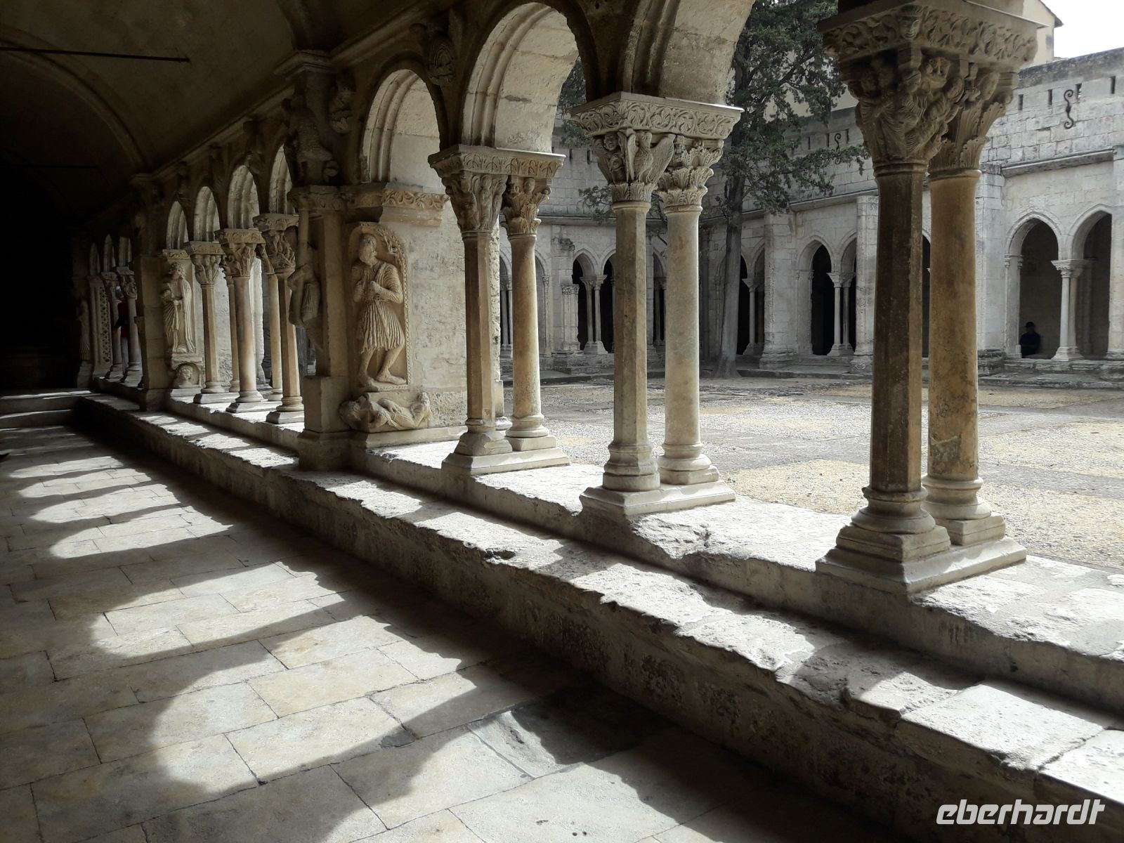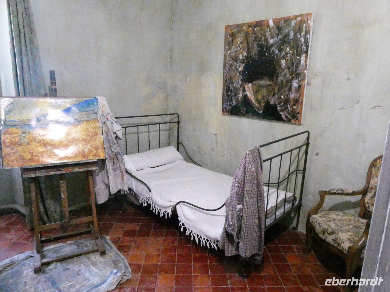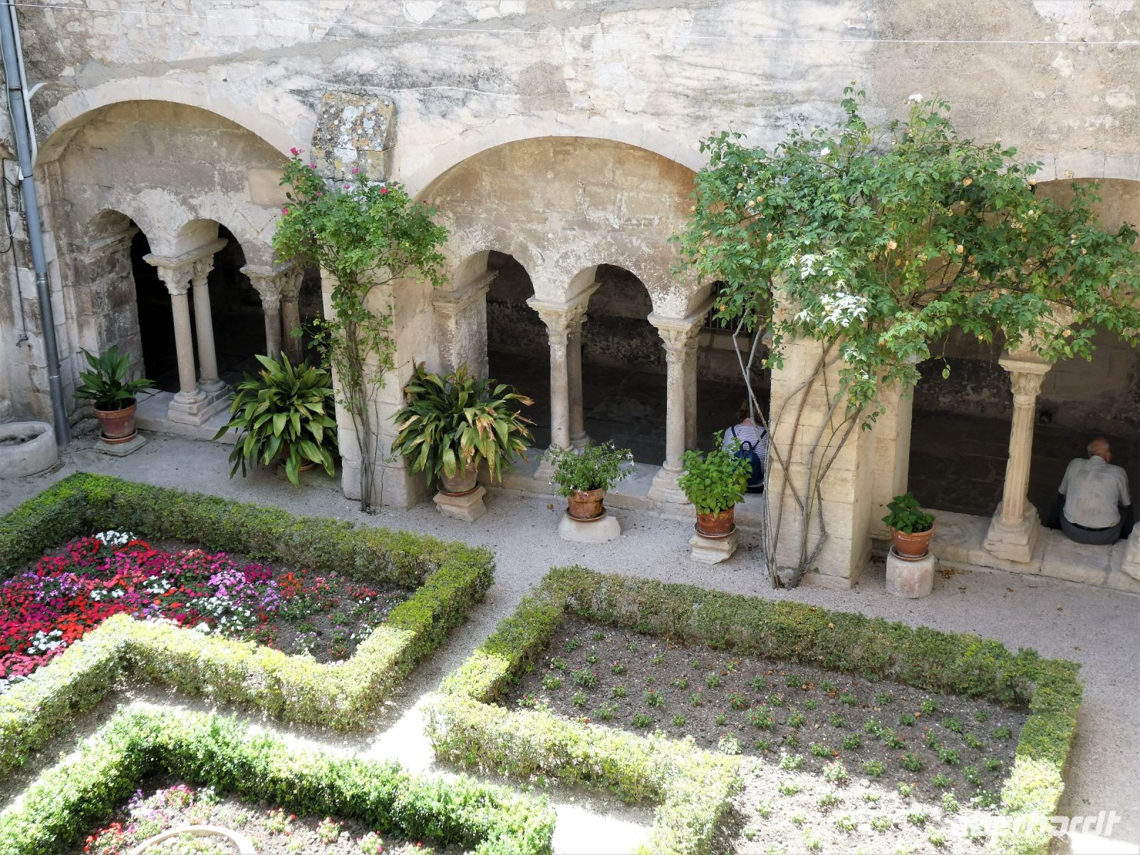 Schließlich gehen wir weiter in Richtung römisches Theater, welche einmal freistehend war und wahrscheinlich deshalb nicht so gut erhalten ist. Auch hier steuern die meisten von uns erst einmal den Schattenplatz unter den Bäumen an. Hier haben sich die Menschen vor mehr als 2000 Jahren getroffen und in Spannung die Aufführung eines Theaterstücks erwartet. Wenn Steine reden könnten. Wir versuchen auf dem Weg zur Kirche "St.Trophime" im Schatten zu laufen denn die Sonne brennt. So verspricht die romanische Basilika mit ihren schönen Steinmetzarbeiten am Portal aber auch im Innenbereich angenehme Kühle. Leider ist das Kloster heute aufgrund von Umbauarbeiten geschlossen und wir müssen bis morgen Nachmittag warten. Es bleibt noch Zeit für eine Mittagspause in einem der vielen Kaffees am „Boulevard des Lyces“ oder im ehemaligen „Hotel de Dieu“, einem Krankenhaus in dem auch Van Gogh eine Zeit zubrachte. Es ist heute das Gemeindezentrum und nett mit Garten gestaltet. Dann aber eilen wir zur Bushaltestelle, an der unser Fahrer wartet. Wir wollen jetzt zu dem Kloster "St.Paul de Mausole" fahren, welches dem großen Maler für ein Jahr eine Bleibe bot und wo er einige seiner herausragendsten Bilder schuf. Wir verlassen Arles, vorbei am Place Lamartine, an dem einst das „gelbe Haus“ stand, Van Gogh's einstiger Wohnort und sein Traum von einer Künstlergemeinschaft welchen er mit dem Malerkollegen Gauguin zu verwirklichen hoffte. Durch die schöne provenzalische Landschaft der „Alpilles“ führt uns der Weg in die Nähe von "St.Rémy-de-Provence" zu einem Parkplatz, neben dem römische Artefakte von etwas Bedeutendem künden: die Reste der antiken Stadt "Glanum". Als Festung an einem Pass durch den Gebirgszug der "Alpilles" gegründet wurde die Siedlung später von den Griechen und schließlich von den Römern übernommen. Antike so einfach am Wegesrand. Unser eigentliches Ziel ist aber das Kloster "St.Paul-de-Mausole". Inmitten von Feldern durchschreiten wir die Mauern dieser heute privaten Nervenheilanstalt. Auch hier dreht sich alles um "Vincent". Es ist ein beschaulicher, fast magischer Ort. Wir werden begleitet von einem lauten Grillenkonzert, eine idyllische Szenerie mit dem Kreuzgang und dem Garten voller duftender Blumen. Wir sehen das Zimmer in welchem er seine Zeit verbrachte. Im Aufgang Werke der heutigen Patienten die verkäuflich sind. Man finanziert so einen Teil der Institution, in der es 3 Abteilungen für die Kranken gibt, je nach Schwere ihrer psychischen Erkrankung.