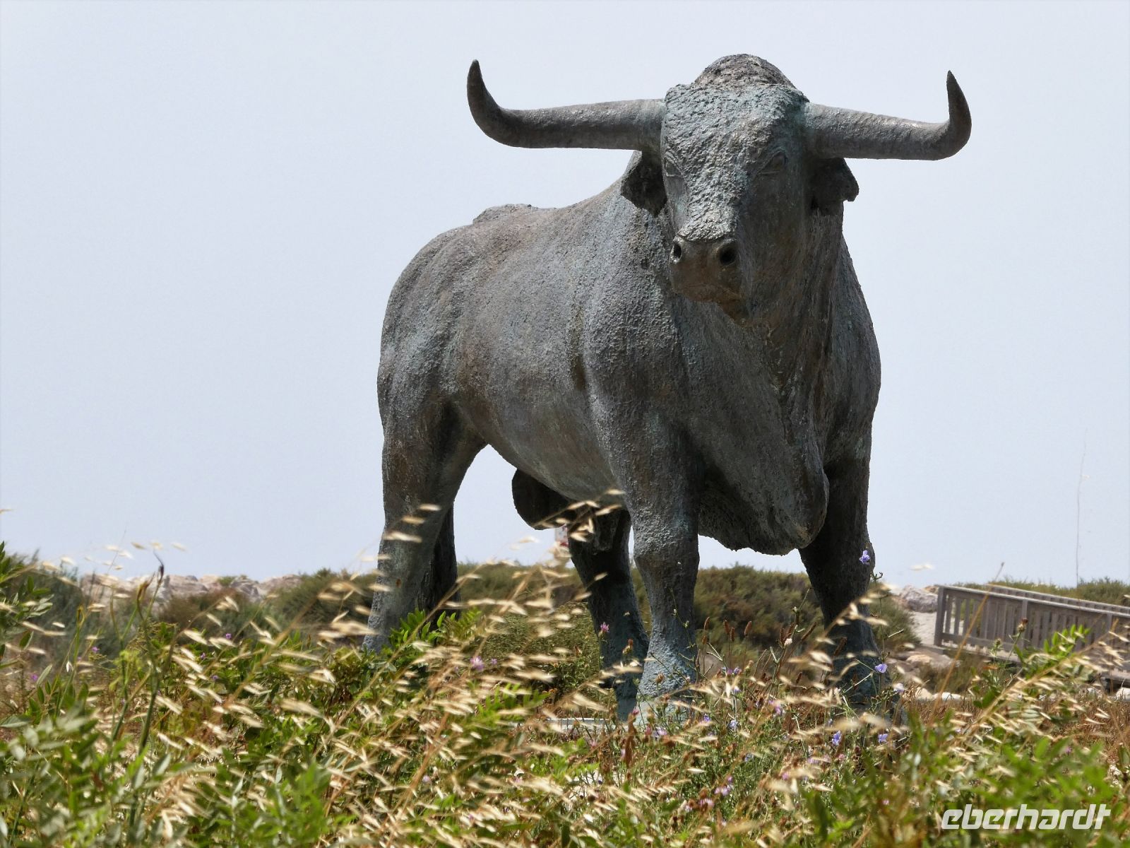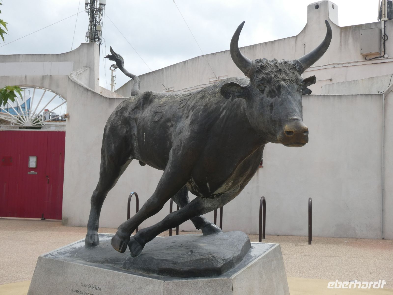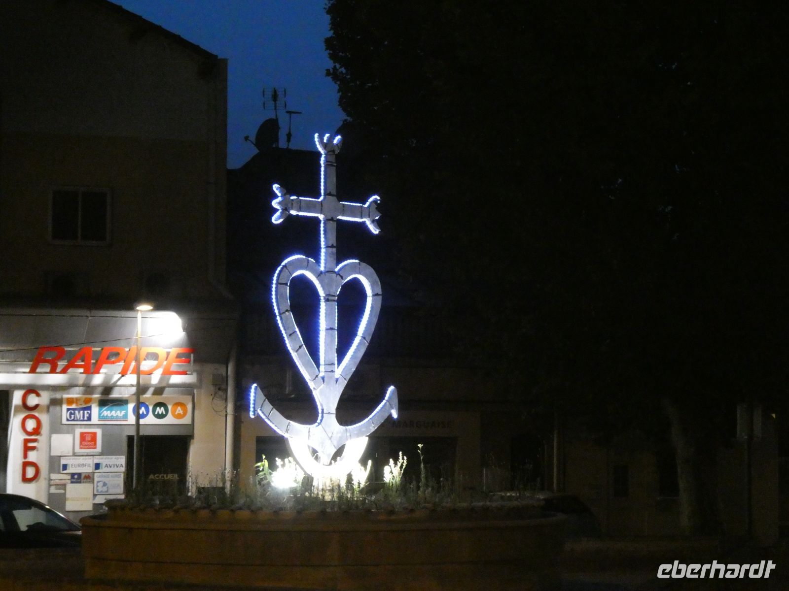 Hier in diesem Ort wurde auch das mittlerweile berühmte Symbol der Camargue kreiert, welches man in allen erdenklichen Varianten an den Souvenirständen erwerben kann. Auch auf unserem Bushalteplatz am Hotel leuchtet es uns in der Nacht entgegen.