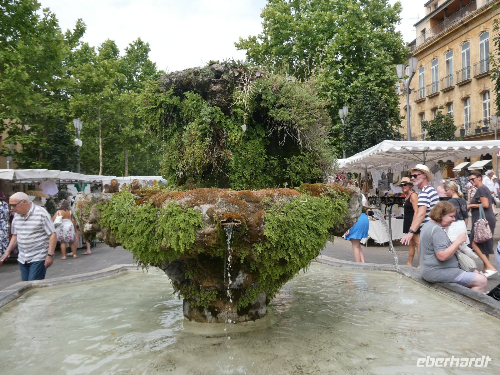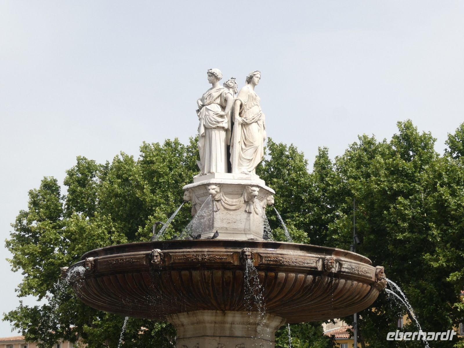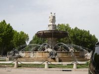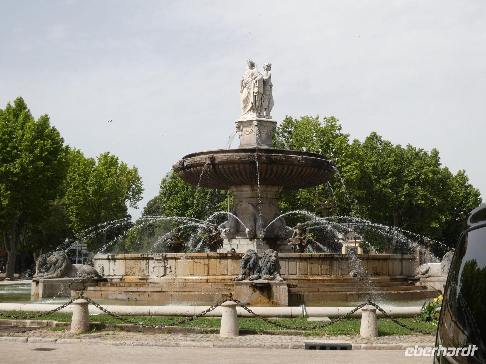 Hier kann unser Bus halten. Die Busparkplätze sind in den Orten mit den engen Straßen immer ein besonderes Problem. Hier wird uns unser Bus anschließend auch wieder aufnehmen. Wir laufen zu Fuß bis zur sog. Rotonde, dem "Place Charles de Gaulle, in dessen Mitte ein gigantischer Brunnen steht, wie ja überhaupt die Stadt "Aix-en-Provence" für ihre Brunnen bekannt ist. Das Wasser spielte für die Gründung der Stadt an dieser Stelle eine wichtige Rolle. Für die Römer war das damals ein wichtiges Kriterium, spielte Wasser doch schon damals schon eine wichtige Rolle. Die heilsame Wirkung einiger Quellen war im römischen Reich bekannt.