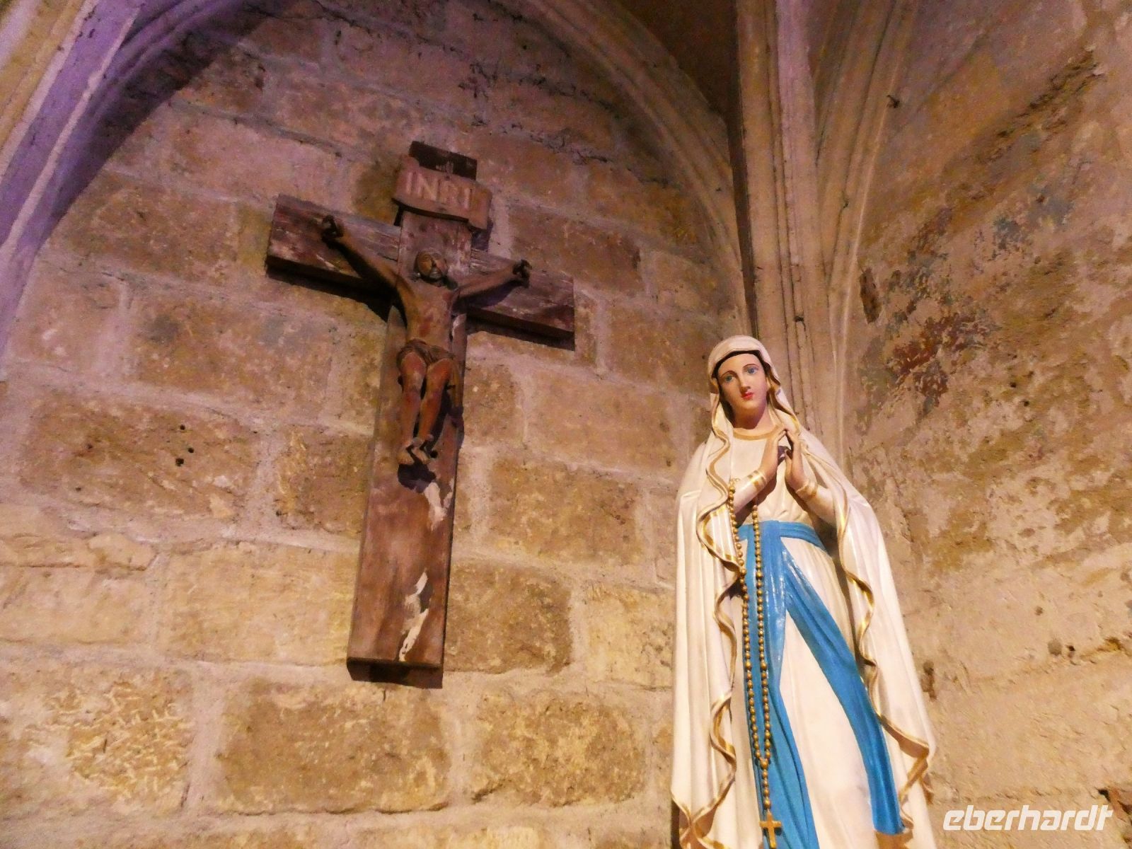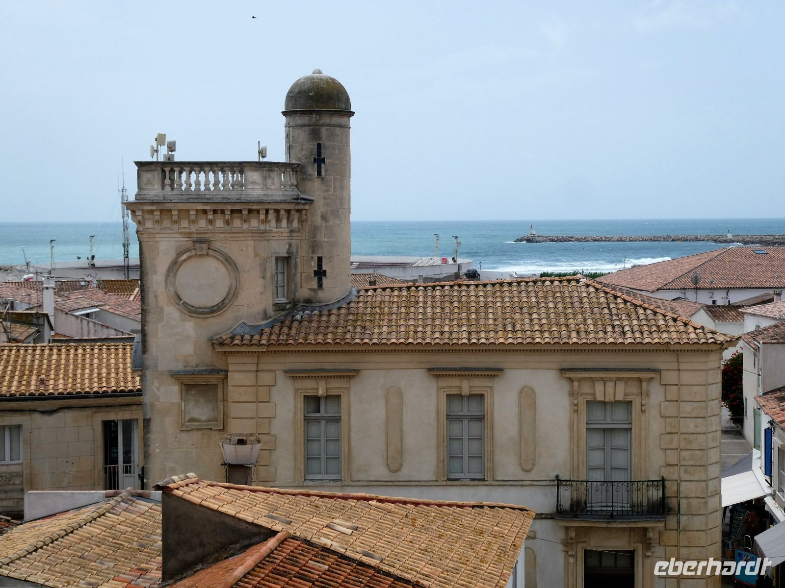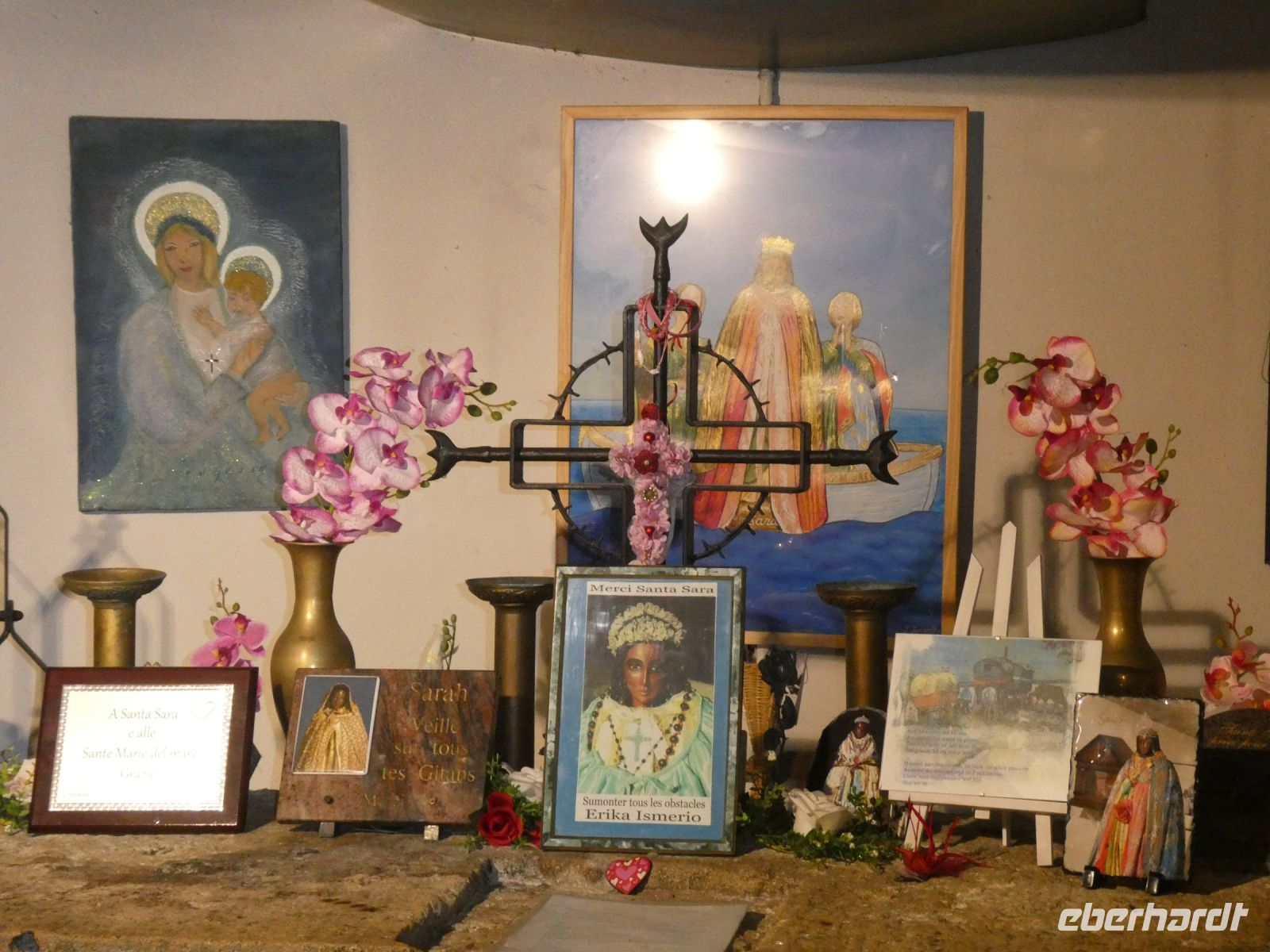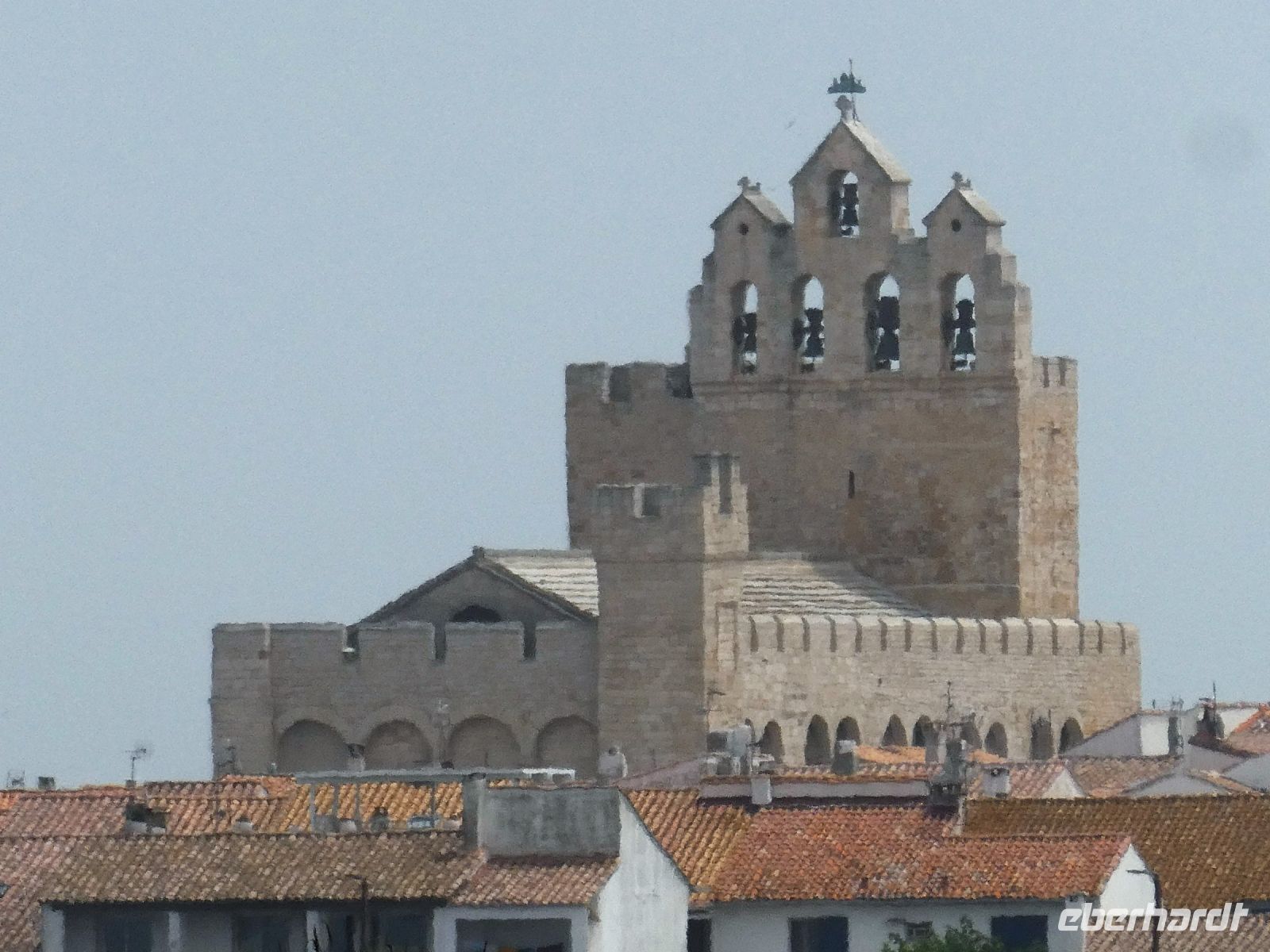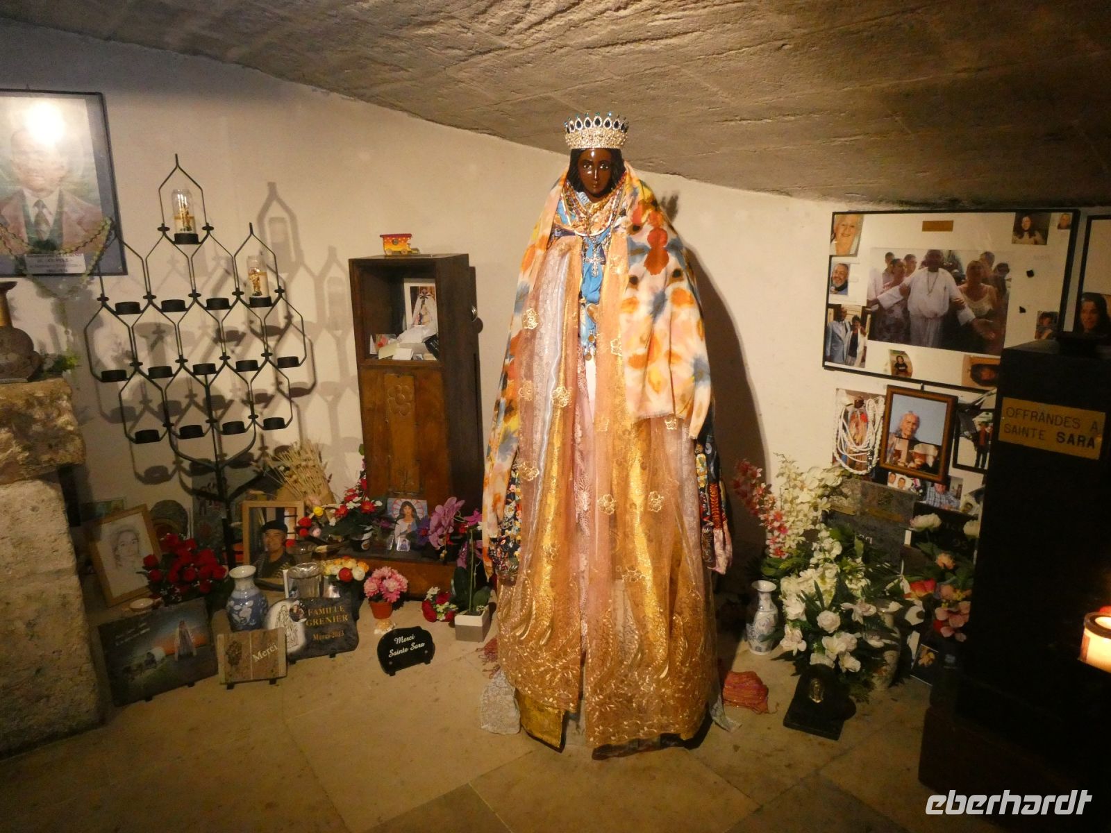 Schon von Weitem taucht wie aus einem Nebel (es ist wahrscheinlich Salzdunst) die Wehrkirche von "St.Maries" auf. Wir steigen sehr nahe bei der Kirche aus und können diese Kirche, die im 14.Jahrhundert wegen der vielen Überfälle zur Wehrkirche ausgebaut wurde, ausgiebig besichtigen. Im unteren Bereich befindet sich die "Schwarze Sarah" eine Heilige die wohl aus dem Vorderen Orient mit den beiden Marien als deren Dienerin in das Land gekommen sein soll und sich zum Christentum bekehrt haben soll. Sehr viele Danksagungen und Gaben sammeln sich um die "Heilige" welche im Mai anlässlich einer Wallfahrt von den "Gitans" (hauptsächlich Roma) und anderen Pilgern durch den Ort getragen wird und neue Kleider bekommt.