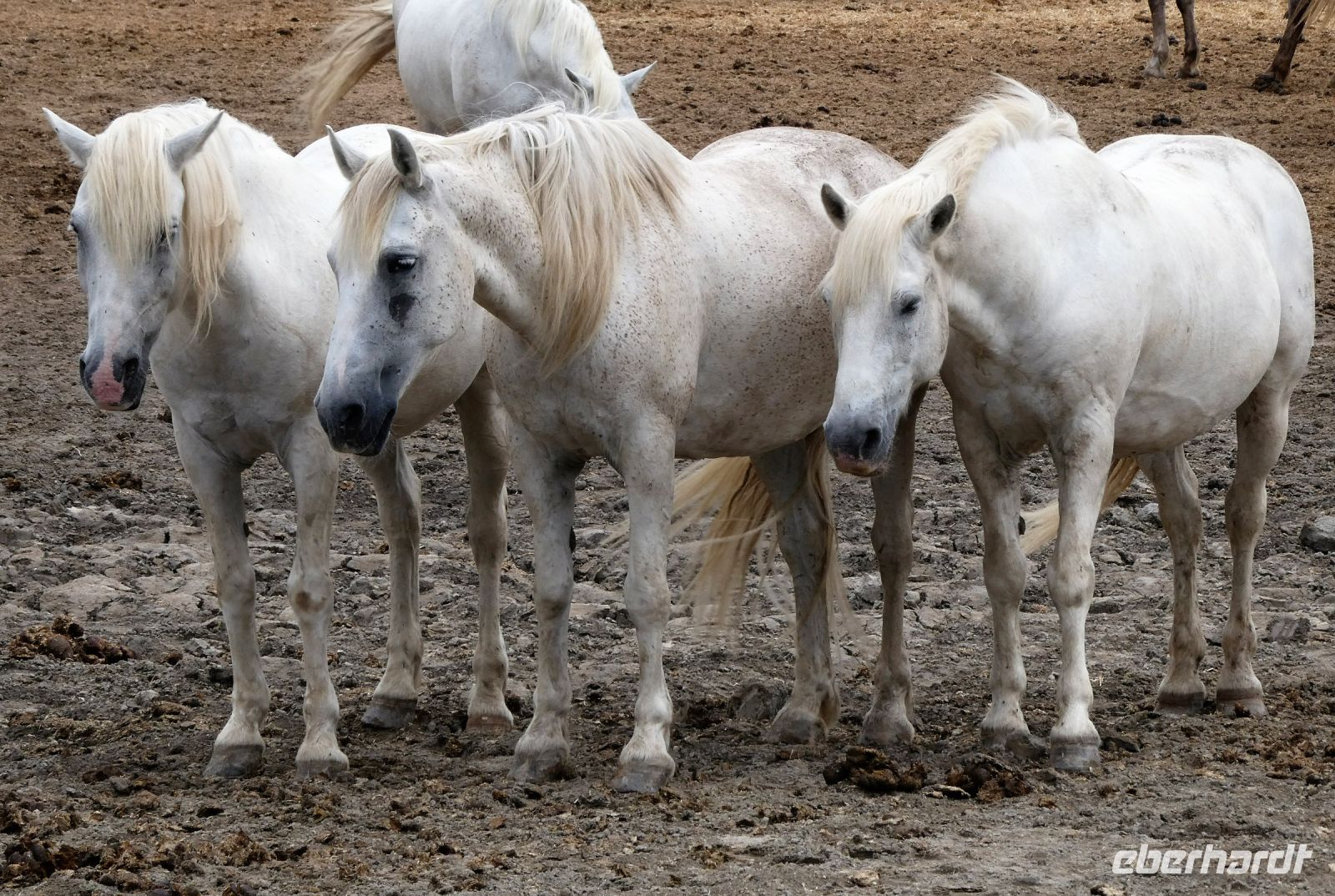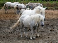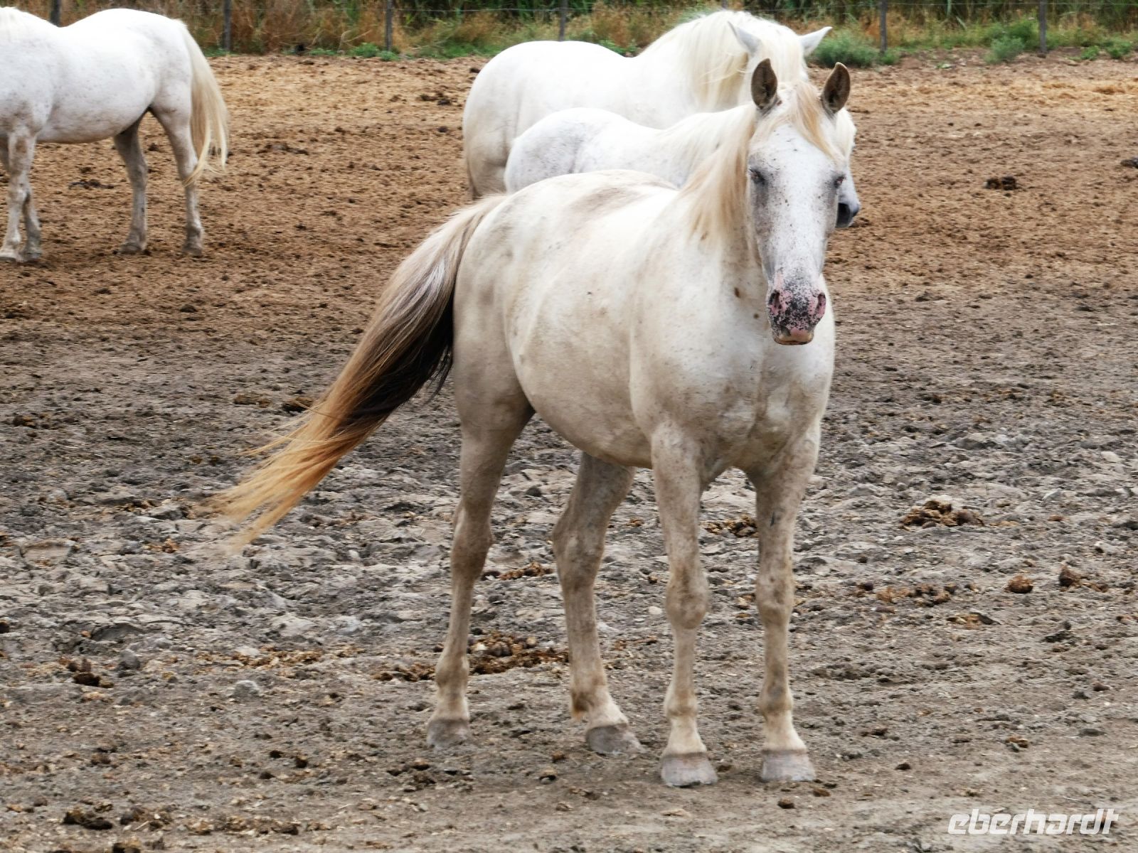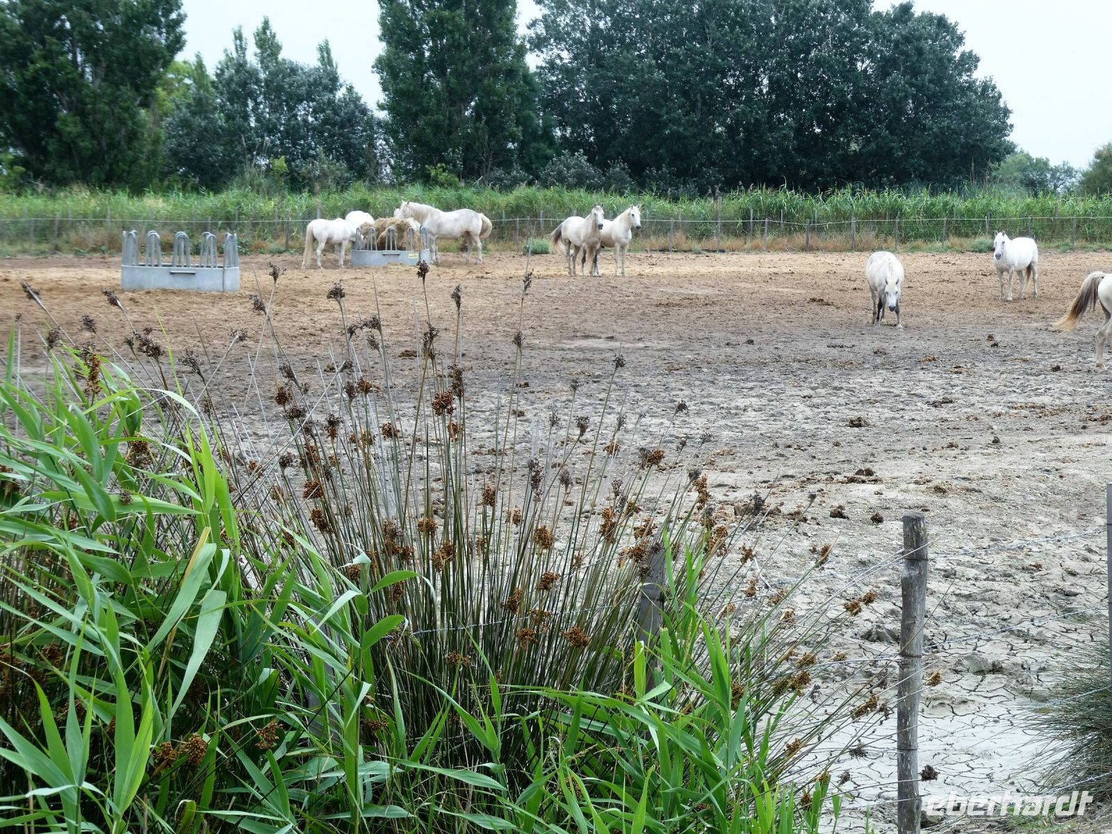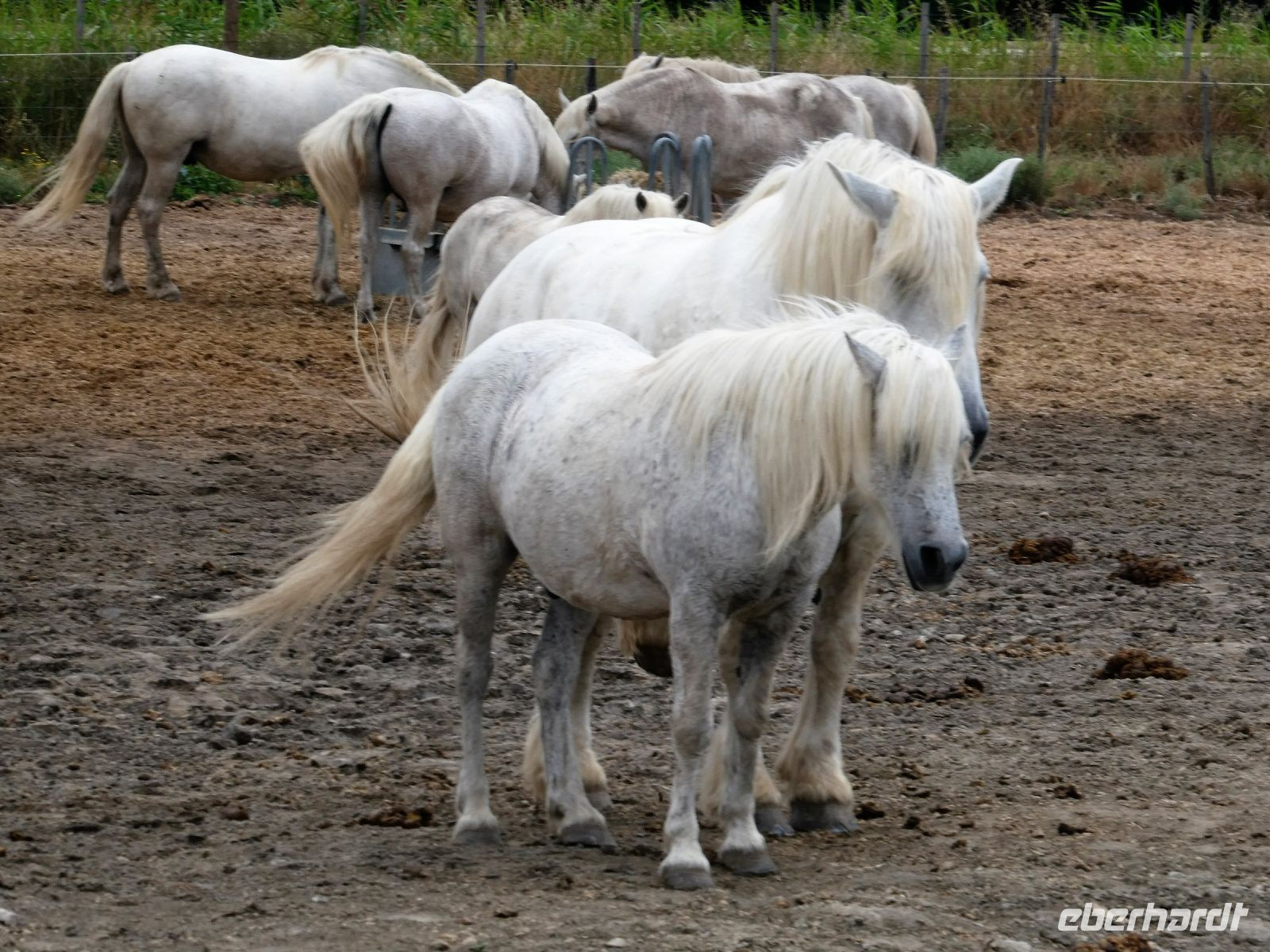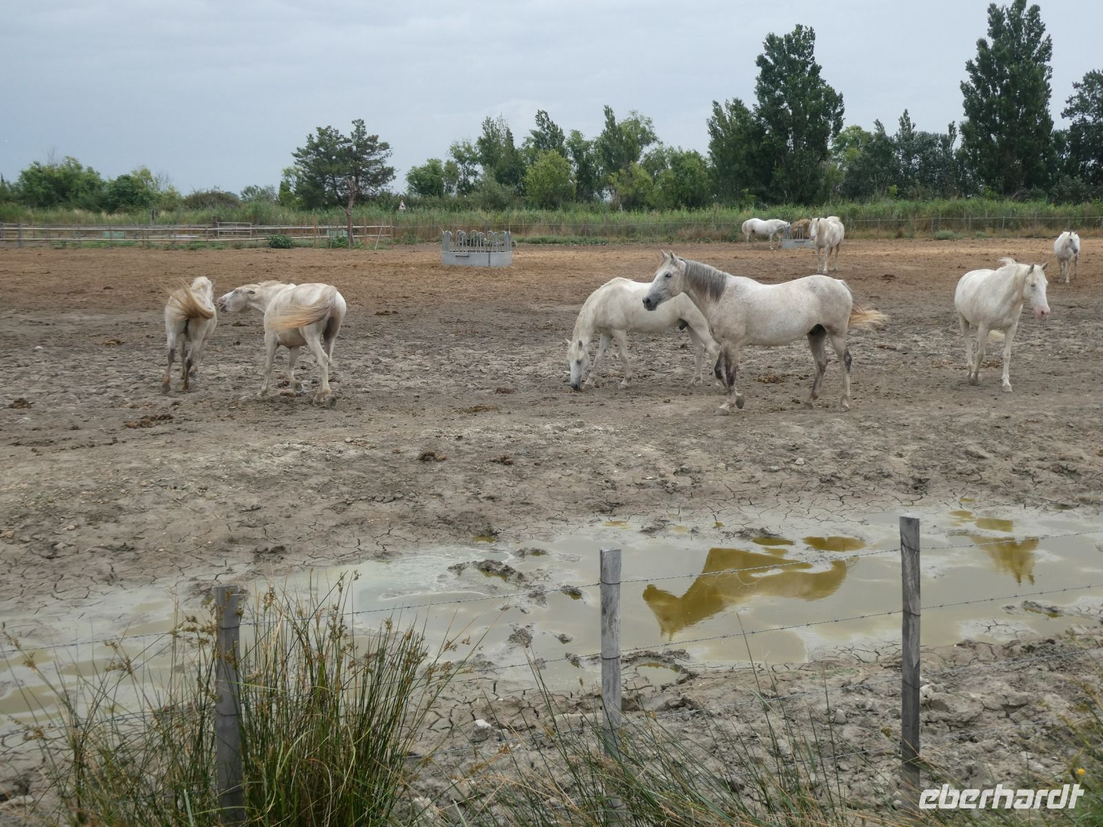 Heute morgen ist der Himmel erst ein wenig bewölkt. Nun die Temperaturen könnten schon etwas niedriger sein, aber doll regnen soll es denn auch nicht. Da wir aber in Richtung Meer unterwegs sind, besteht weniger die Gefahr von Regen und schon gar nicht sieht es nach Dauerregen aus. Den können wir heute auch nicht gebrauchen, denn es steht die Landschaft der Camargue mit ihren Reisfeldern, Salztümpeln und Wasservögeln auf dem Programm. Ein Großteil der ca. 1500 qkm umfassenden Schwemmlandebene der Rhone wird landwirtschaftlich genutzt. Die weißen Pferde und die Stiere nicht zu vergessen.