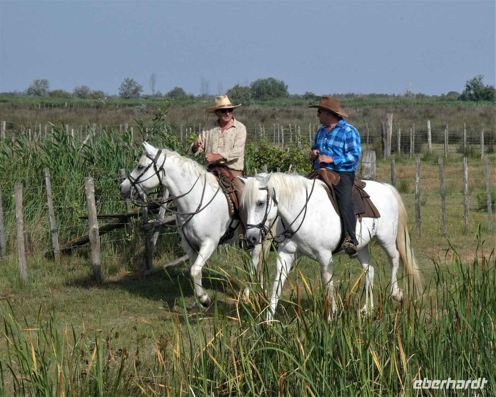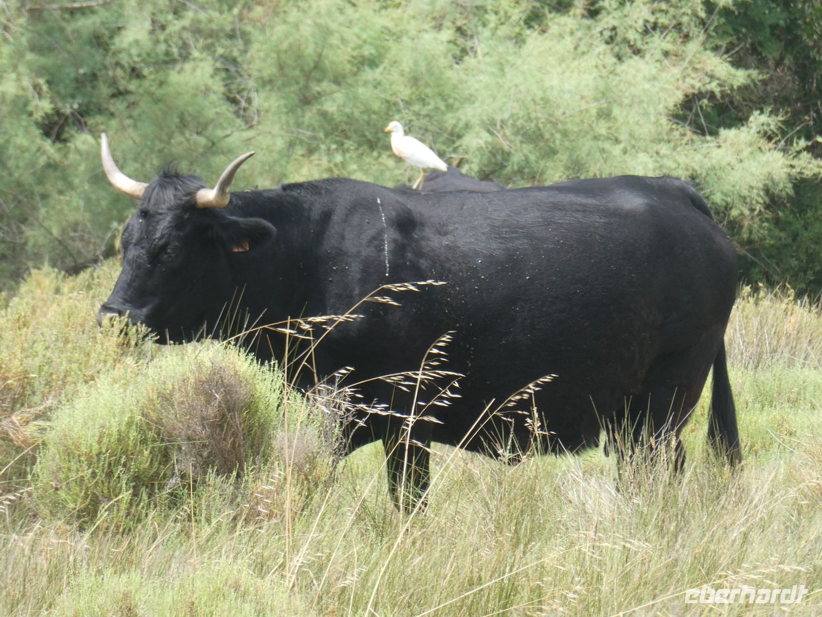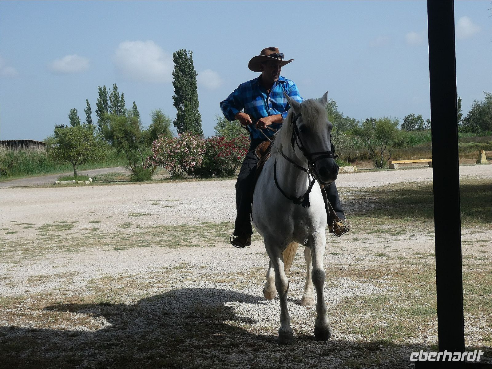 Nach dieser längeren Pause fahren wir zu unserem Abendtermin bei der Manade "Arnauld", ein Stierzuchtbetrieb der besonderen Art. Wir kommen dort ein wenig früh an aber man(n) nimmt das mit Gelassenheit. Wir können schon einmal den Leiterwagen besichtigen, der uns durch das Gelände mit den Rindern bringen wird. Also dann heißt es: Platz nehmen und die Fahrt beginnt. Angelockt durch das Futter am Wagen folgt uns bald eine ganze gemischte Herde von Camargue-Rindern. Der Chef des Hauses und sein Mitarbeiter erklären uns sehr viel über die Art dieser Rinderaufzucht. Die Tiere halten sich immer nur im Freien auf und bekommen nur ab und an Futter zugefüttert. Alles andere erledigt die Natur. Der Inhaber erklärt, dass er noch nie einer Kuh beim kalben zugeschaut hätte, obwohl er das seit über 40 Jahren machen würde. Das Tier sondert sich von der Herde ab und bringt ihr Junges allein auf die Welt. Es klingt alles so natürlich und selbstverständlich. Automatisch kommen einem Gedanken über Massentierhaltung und fürchterliche Zustände in der Tierhaltung. Könnte es nicht überall so sein? oder was müsste passieren? automatisch kommen solche Gespräche auf. Trotzdem lassen wir uns den Appetit auf unser echtes "Stiergulasch" nicht vermiesen. Bei Rückkehr zum Haus bekommen wir erst einmal den Aperitif der Region, einen "Kir", oder auch nicht Alkoholisches und geht es los mit einem Stiergulasch und Wein zum heruntersspülen. Landleben ist schön..... aber einige werden gepiekst! Na was soll's im Sommer gibt es nun mal Mücken. Beschwingt und voller Eindrücke fahren wir in unser Hotel zurück. Wir verabschieden uns von unserem Fahrer Remy der heut so manchen Teich und manche Pferdekoppel für uns aufstöberte und lassen den Hut kreisen.