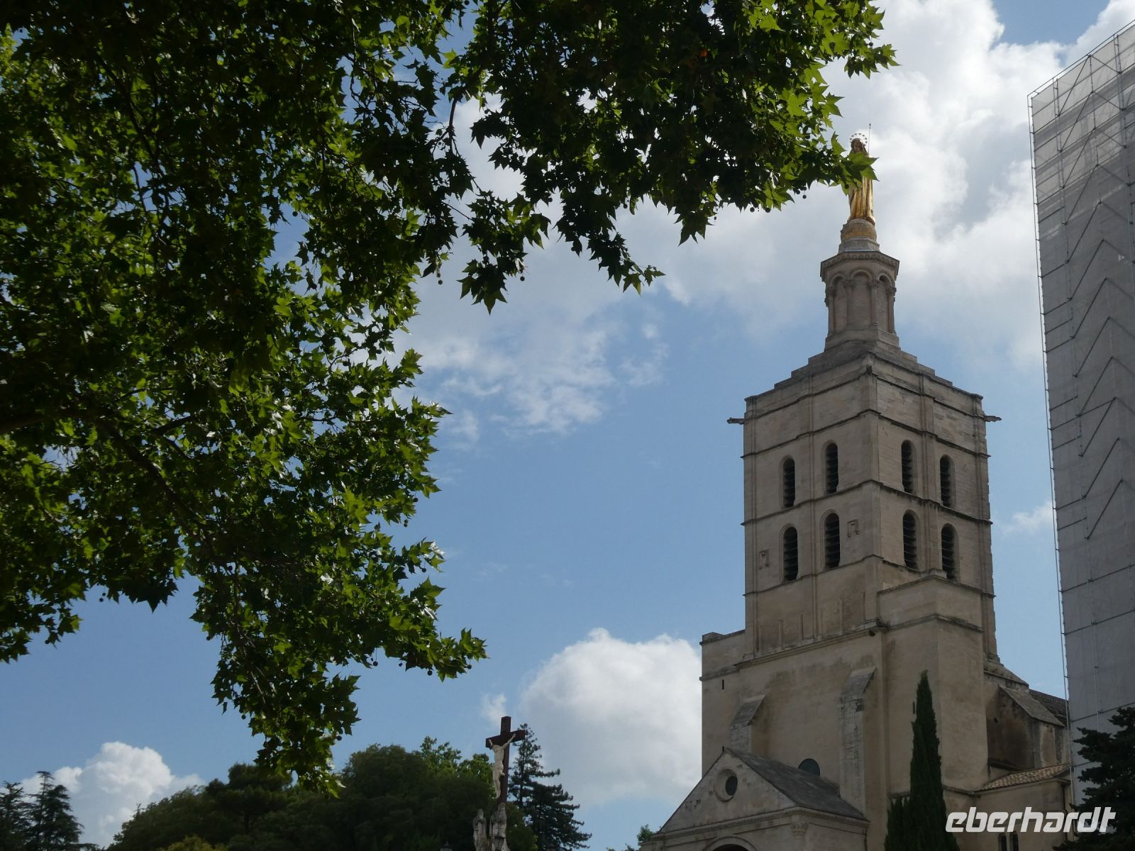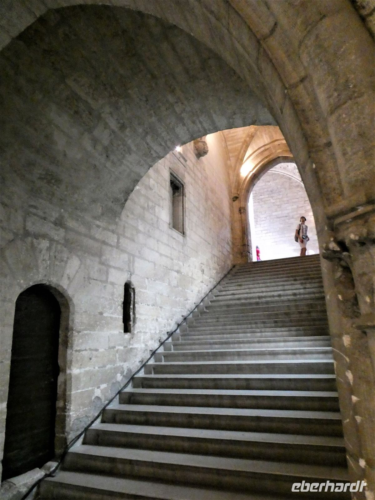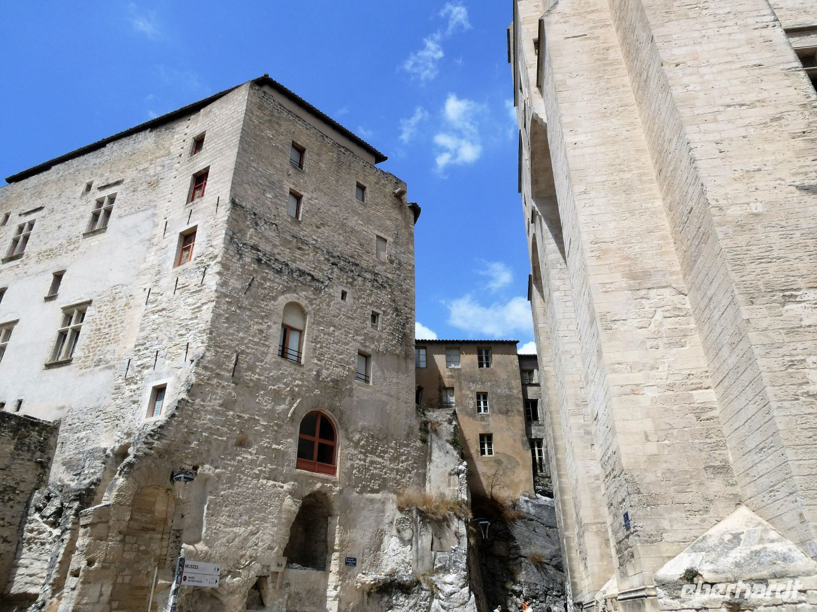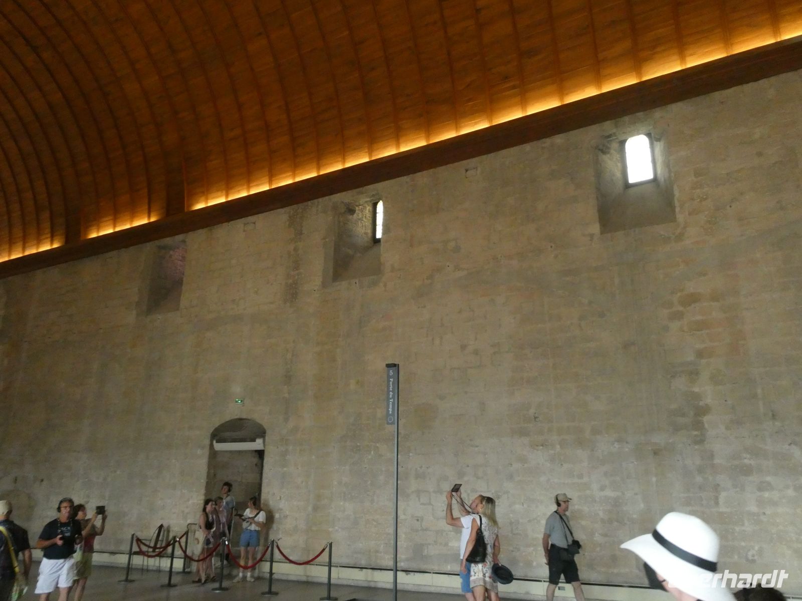 Heute gibt es ein Wiedersehen mit unserem Fahrer Thierry, der uns in die "Stadt der Päpste," nach "Avignon" bringt. Nach nicht allzu langer Fahrt lassen sich im Hintergrund schon die ersten Gebäude von Avignon ausmachen. Von weitem erblickt man den "Rocher-des-Domes" hoch erhoben über der mittelalterlichen Altstadt, die von einer komplett intakten Stadtmauer umgeben ist und die Brücke die "Pont d'Avignon" die wirklich jedes Schulkind in Europa kennt. Schnell sind wir am Parkplatz und nach einer technischen Pause am Eingang der "Pont-St-Benezet" laufen wir gemeinsam zum "Place d'Horloge", benannt nach der Uhr am Rathaus. Gina gibt uns eine Orientierung und erklärt, wie wir zur Markthalle kommen und die Hauptachse der Stadt. Auch zeigt sie uns den Abfahrtsort des "Petit Train" der die Reisenden die nicht so gut zu Fuß sind, für wenig Geld durch die Stadt fährt. Dann gehen wir gemeinsam zum Eingang des Papstpalastes, ein gotisches Bauwerk welches über ca. 70 Jahre die Residenz des Papstes war. 2 Päpste haben dem Palast besonders ihren Stempel aufgedrückt, bzw. ihn bauen lassen: Benedikt XII. und Clemens VI. Ihre Wohnräume können teilweise besichtigt werden. Der Palast galt besonders für Clemens VI. als Schutzschild gegen die "Pest", die im 14.Jahrhundert wütete. Kalt und unwirtlich wirken die dicken Mauern auf uns, oder muss es "unwirklich" heißen? Haben wir nicht unsere Lebenszeit gut gewählt? Auf diese Erkenntnis kommen wir ab und an während der Reise, allerdings mit im Moment einigen Fragezeichen im Gesicht, denn die Nachrichten über die Ukraine machen auch hier in Frankreich nicht vor uns halt.