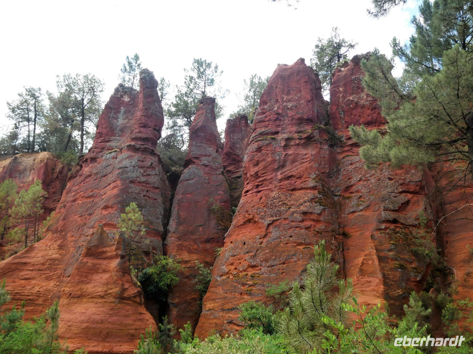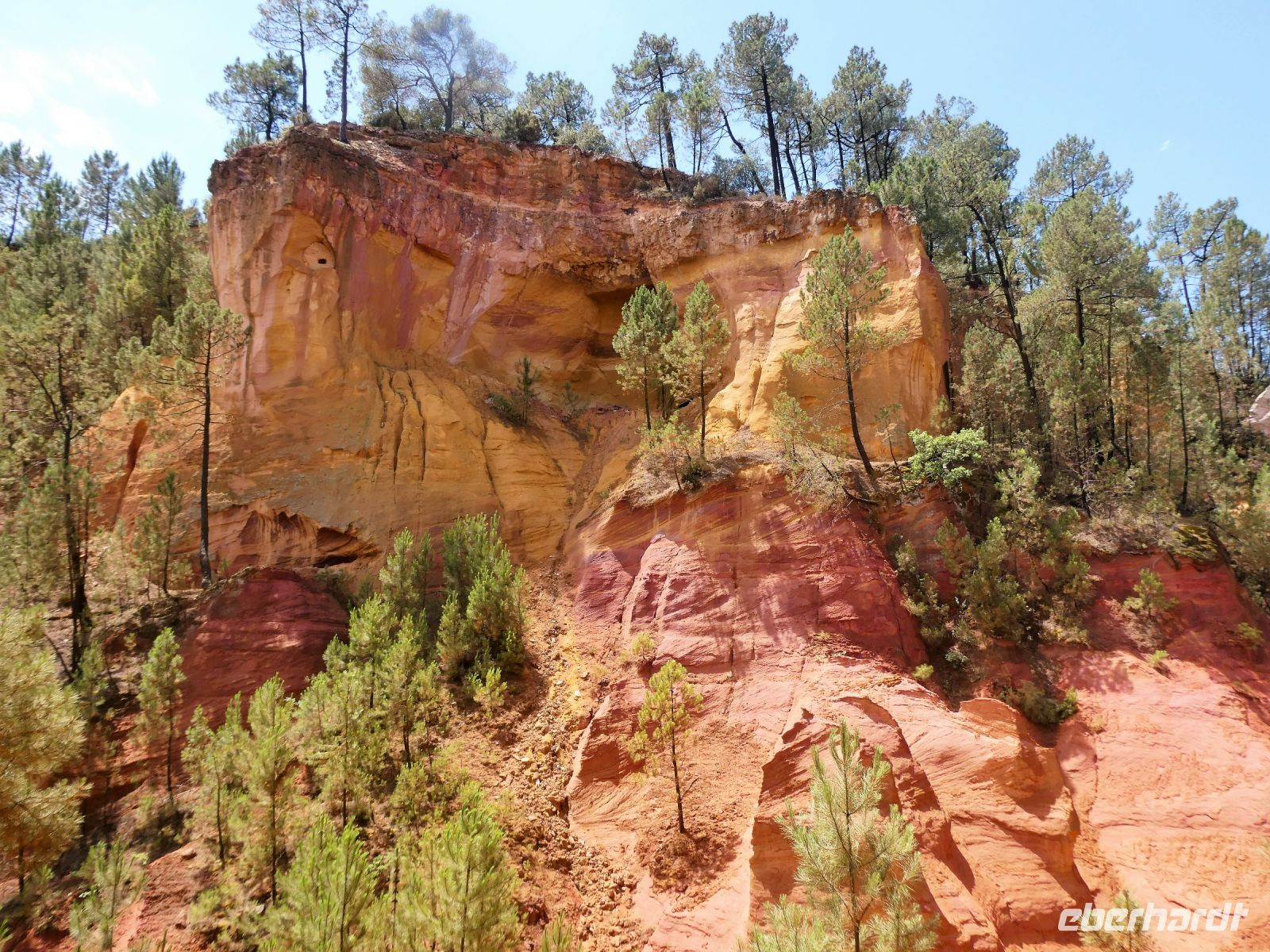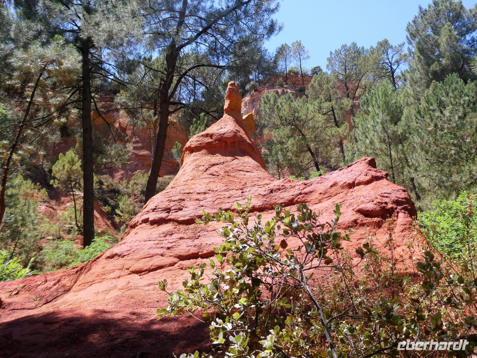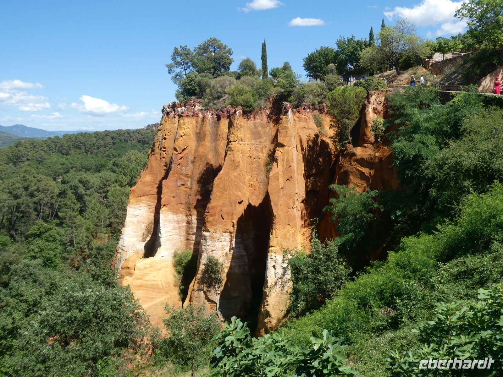 Danach aber geschieht ein Wunder. Waren wir doch ziemlich unsicher bezüglich des "Ockerwanderweges" in Roussillon, der bei Starkregen nicht zu begehen ist. Der Himmel verändert seine Farbe in Richtung Blau und als wir in Roussillon ankommen könnte er blauer nicht sein. Die Bedingungen zum Spazieren gehen sind sogar besser als sonst, bleibt einem doch der rote Feinstaub erspart, der sonst die Kleider bepudert und in alle Ritzen dringt.