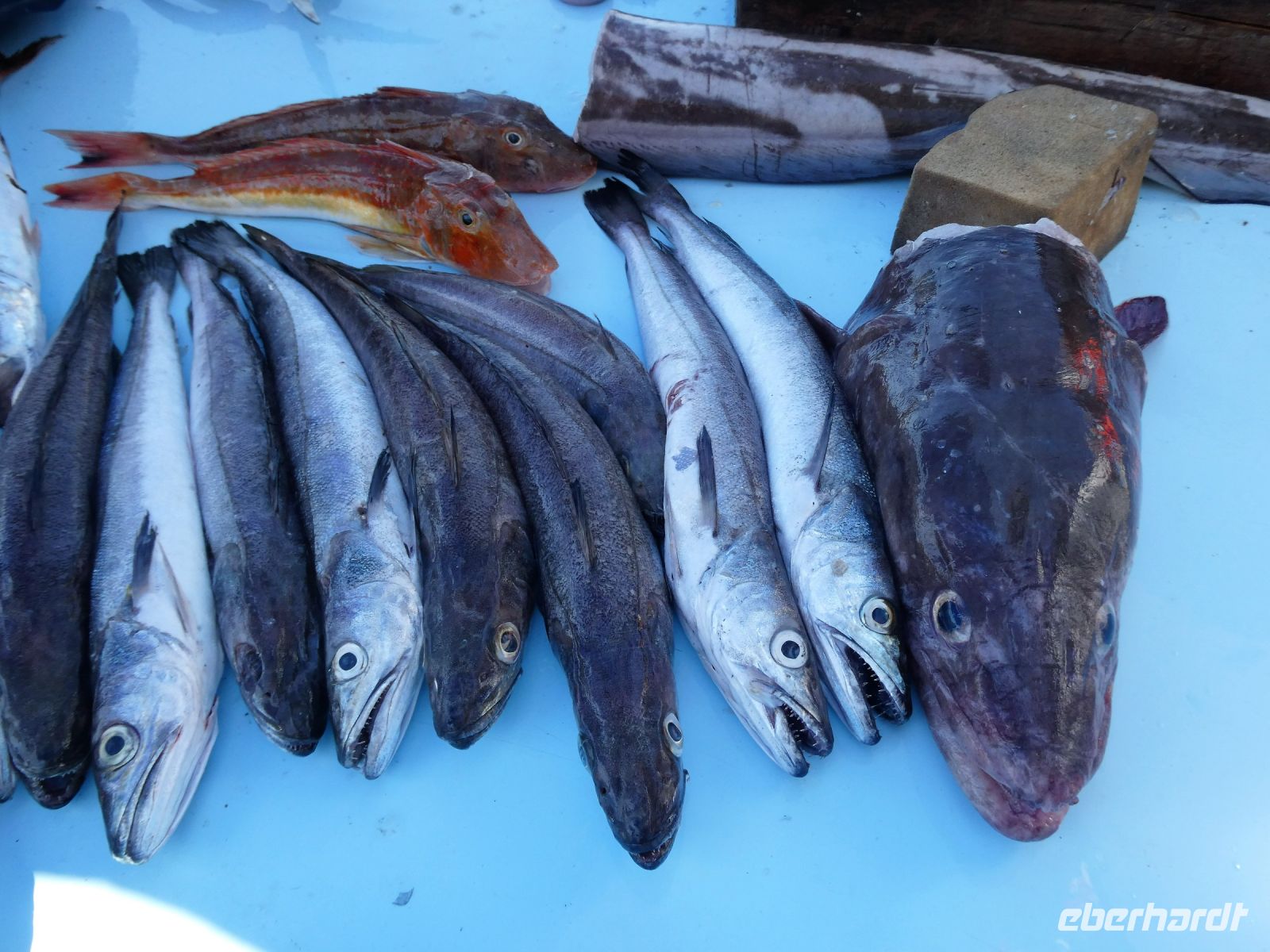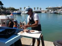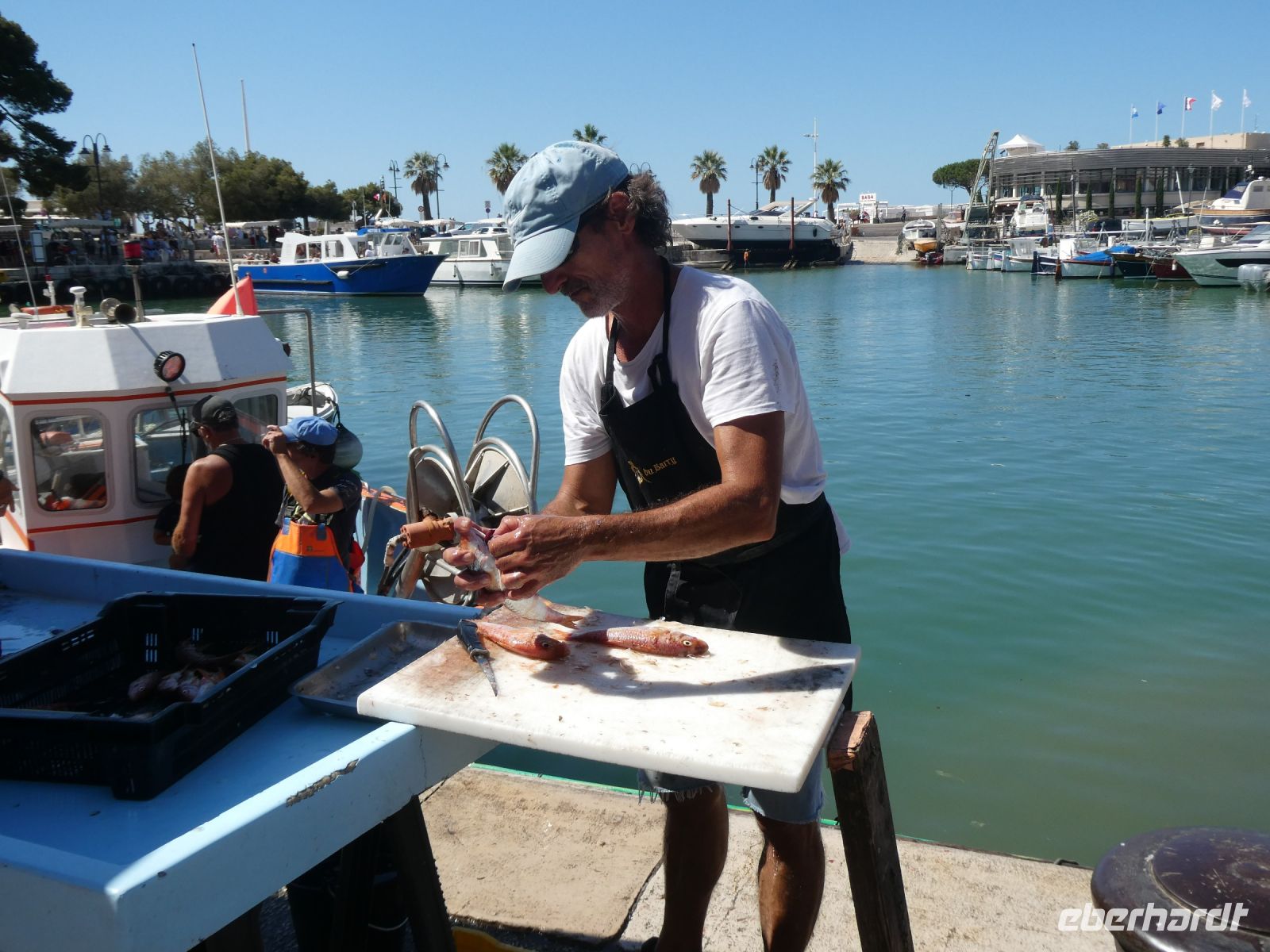 Gerade richtig kommen wir am Busparkplatz in Cassis an, unser Ziel am Vormittag. Von hier unternehmen wir heute eine Bootsfahrt um uns 3 dieser sogenannten "Calanques" - fjordartige Einschnitte in diese Kalkfelsenlandschaft, die sich im Laufe der Jahrhunderttausende entwickelt hat - anzusehen. Mit einem kleinen urigen Bähnchen mit einem noch urigeren Fahrer (man muss den provenzalischen Humor verstehen) werden wir zur unteren Haltestelle in der Nähe des Hafens gebracht. Wir müssen noch ein wenig zu Fuß bergab laufen und sind im kleinen Fischerei-, bzw. Yachthafen von Cassis. Einige Fischer bieten ihren frischen Fang zum Verkauf an und präparieren ihn auf Wunsch pfannenfertig. Einige "Fischschönheiten" sind auch dabei.