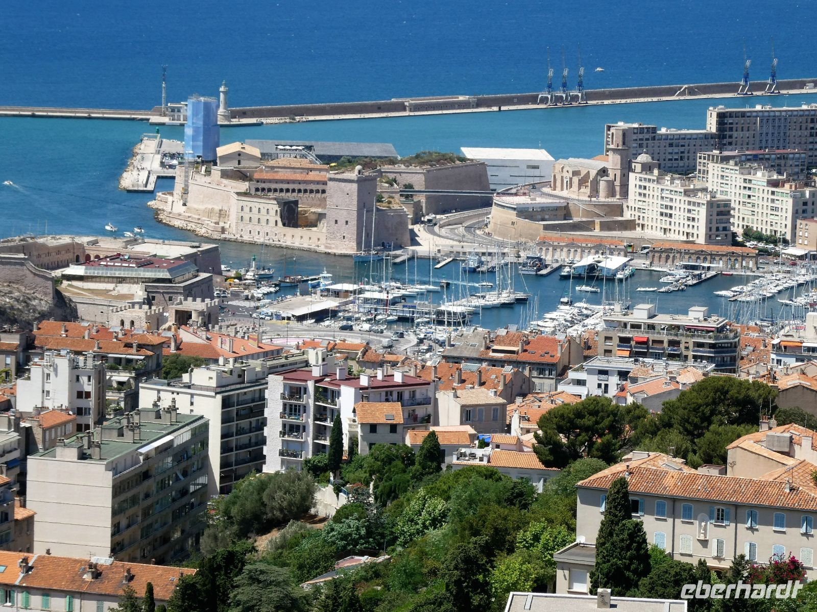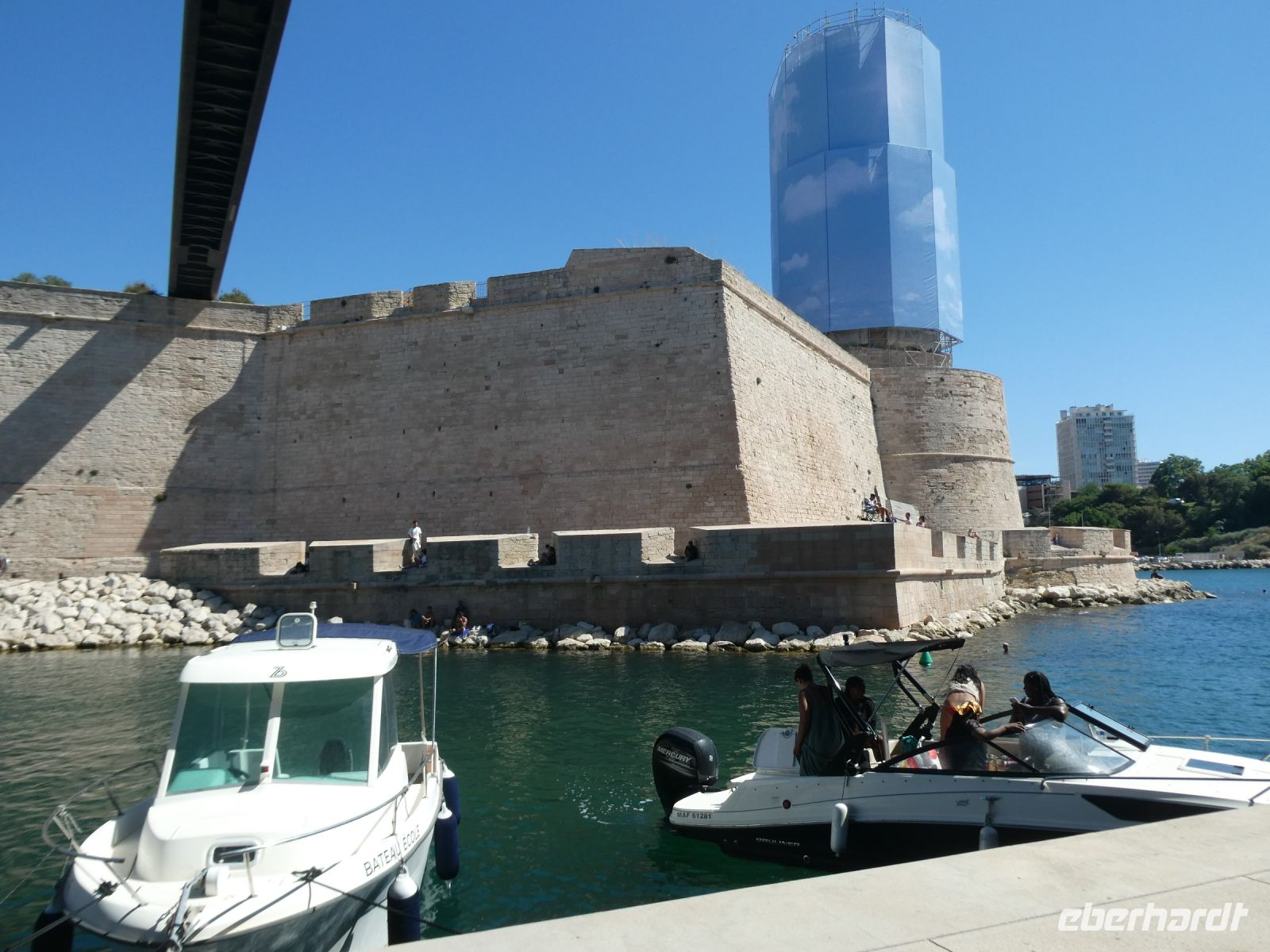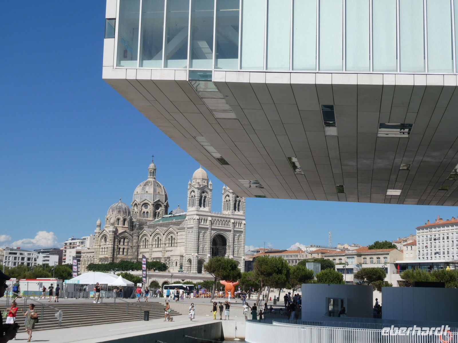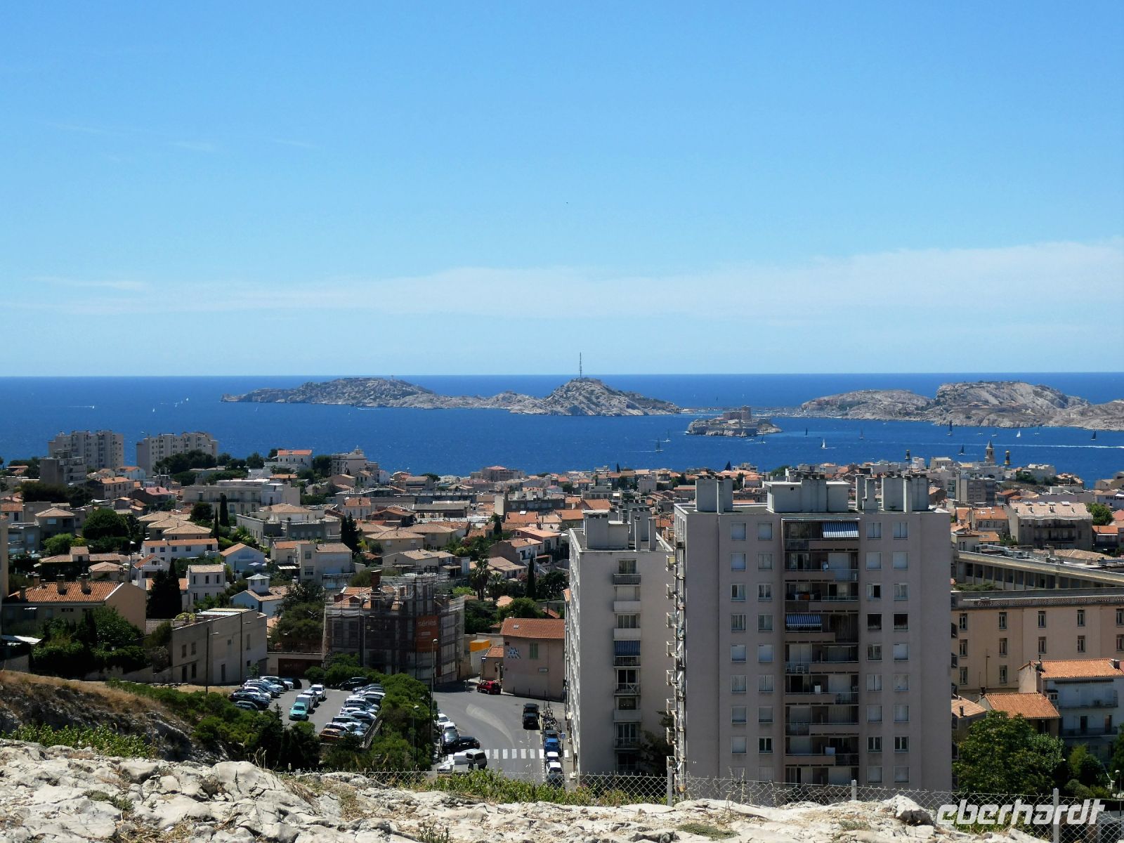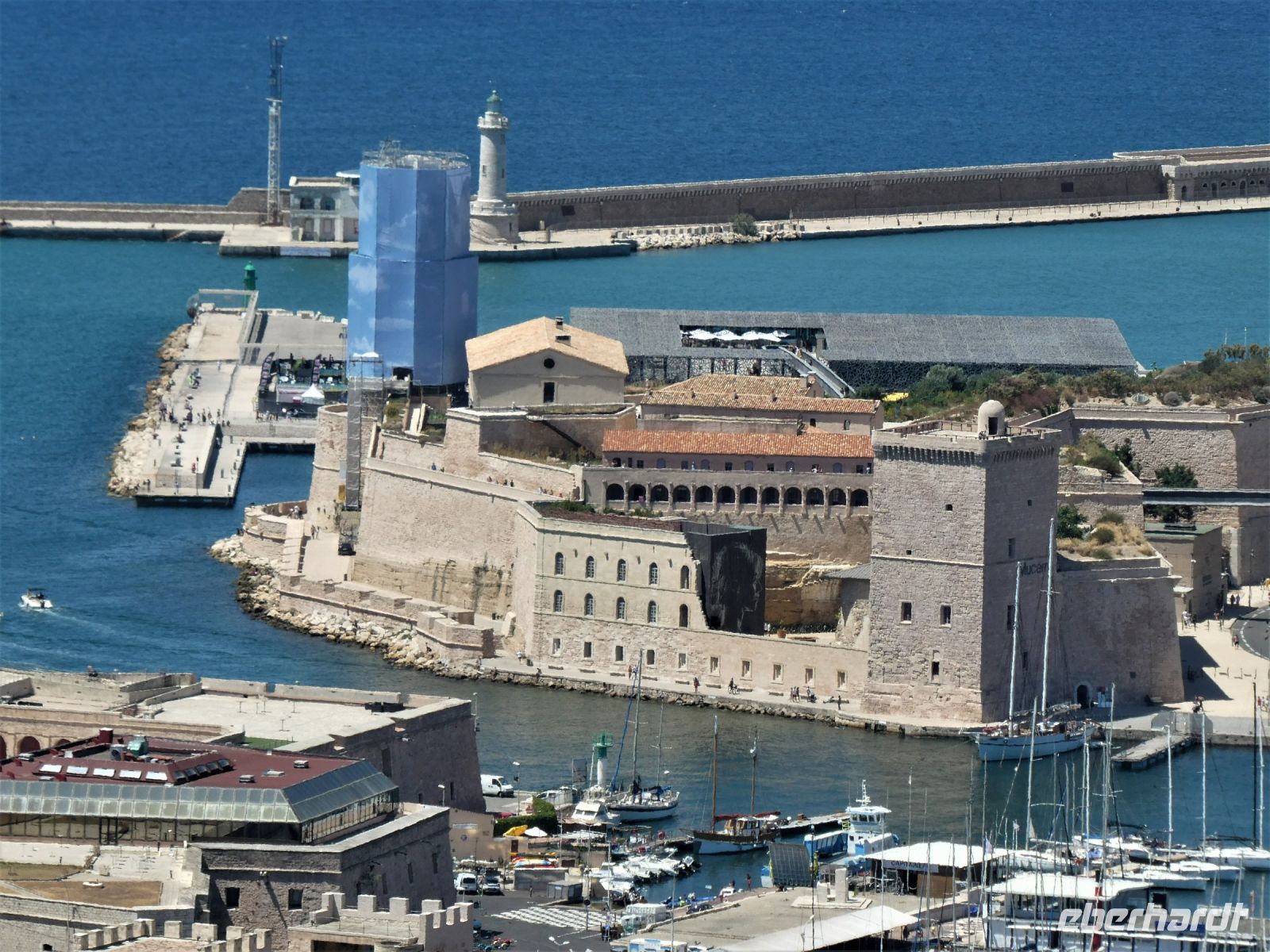 Wir kommen vorbei am 17 ha großen "Parc Borély" mit der "Cité Radieuse" einst von "Le Corbusier" geschaffen, sozusagen der Vorläufer der späteren "Plattenbauten". Sie ist nur ein Teil der großen vielfältigen Parkanlage mit Schloss, botanischem Garten und anderen Vergnügungsstätten. Unser Weg führt uns in Richtung Meer und dann weiter zur "Notre-Dame de la Garde". Sie thront auf einem ca.150 m hohen Felsen und man blickt von dem Plateau auf den "Vieux Port", den alten Hafen und auf die vorgelagerten Inseln mit dem berühmten "Chateau d'If" welches durch das Buch von Alexandre Dumas "Der Graf von Monte Christo" berühmt wurde. Auch erblicken wir die alte Hafenbefestigung aus dem 15.Jahrhundert, das "Fort StJean" welches jetzt eine Verbindung hat zum neu erbautem "MuCEM - Musée des Arts et des Civilisations de l'Europe et de la Méditerranée" - es soll eine Brücke zwischen den Europäischen und Mittelmeerkulturen bilden und Berührungspunkte aufzeigen.