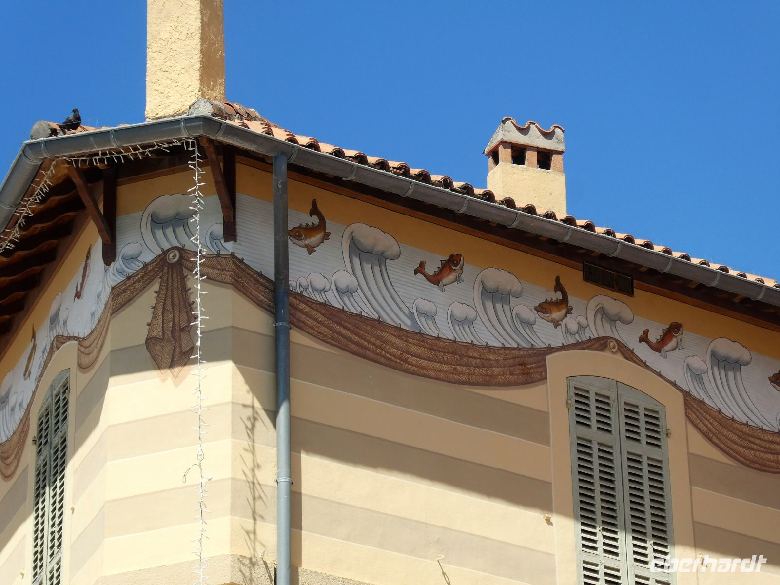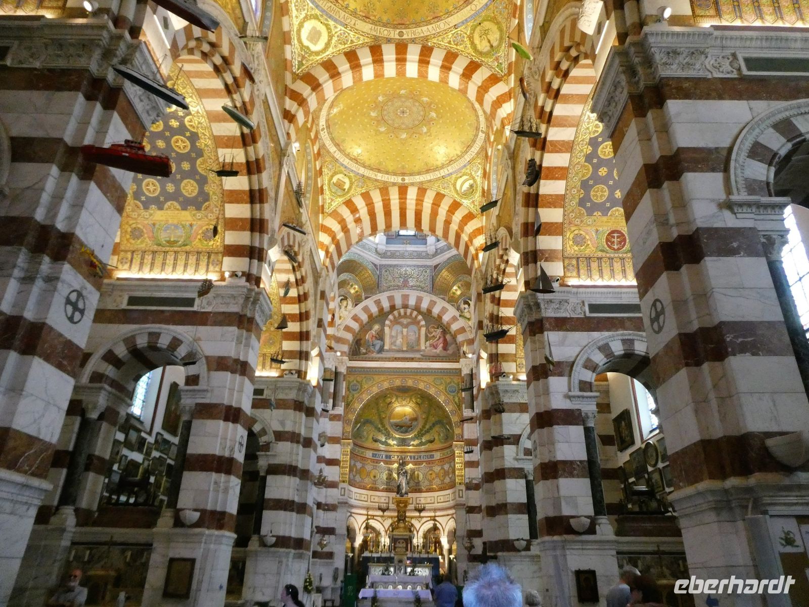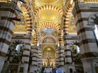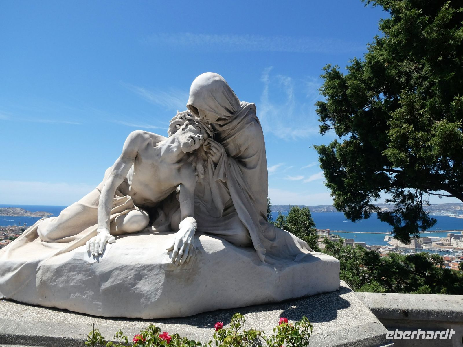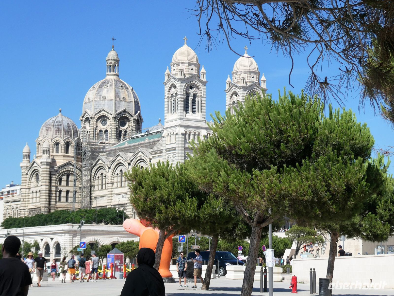 Wir kommen vorbei am 17 ha großen "Parc Borély" mit der "Cité Radieuse" einst von "Le Corbusier" geschaffen, sozusagen der Vorläufer der späteren "Plattenbauten". Sie ist nur ein Teil der großen vielfältigen Parkanlage mit Schloss, botanischem Garten und anderen Vergnügungsstätten. Unser Weg führt uns in Richtung Meer und dann weiter zur "Notre-Dame de la Garde". Sie thront auf einem ca.150 m hohen Felsen und man blickt von dem Plateau auf den "Vieux Port", den alten Hafen und auf die vorgelagerten Inseln mit dem berühmten "Chateau d'If" welches durch das Buch von Alexandre Dumas "Der Graf von Monte Christo" berühmt wurde. Auch erblicken wir die alte Hafenbefestigung aus dem 15.Jahrhundert, das "Fort StJean" welches jetzt eine Verbindung hat zum neu erbautem "MuCEM - Musée des Arts et des Civilisations de l'Europe et de la Méditerranée" - es soll eine Brücke zwischen den Europäischen und Mittelmeerkulturen bilden und Berührungspunkte aufzeigen.