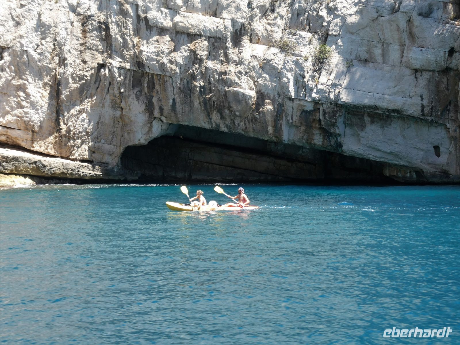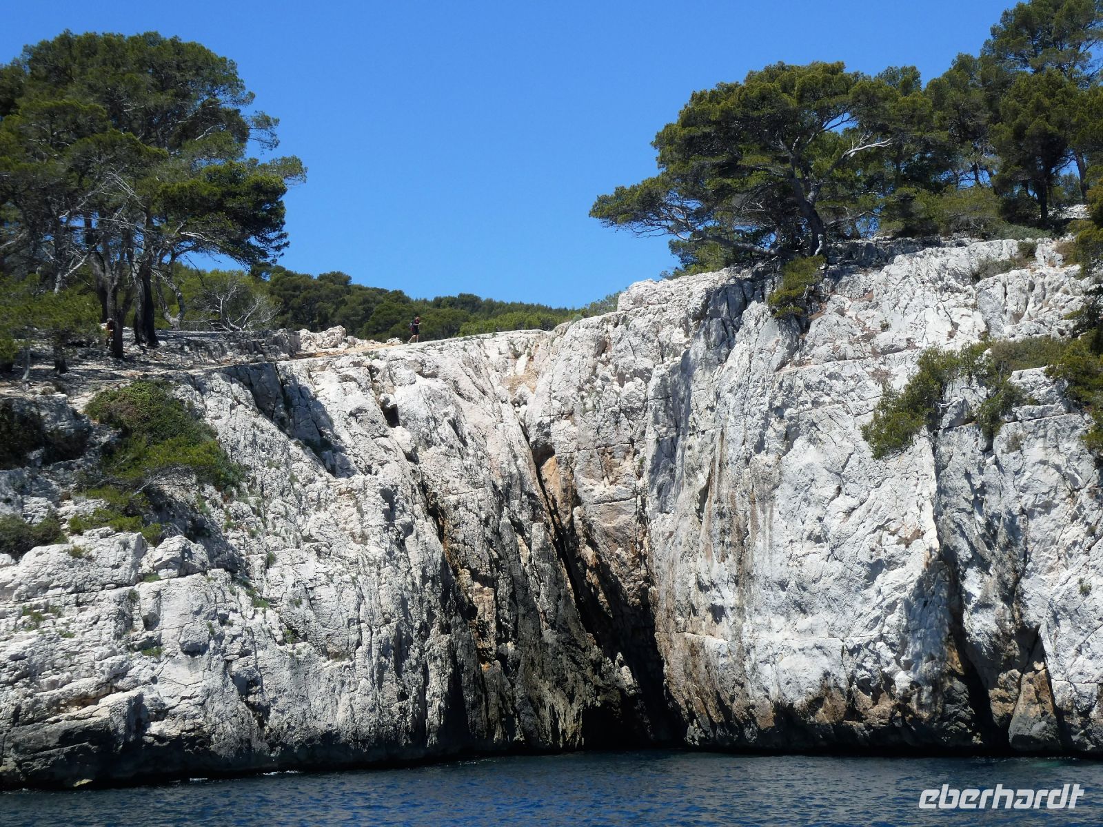 Bei unserem Schiff müssen wir noch ein wenig warten. Die beiden "Jungunternehmer" warten noch auf mehr Kundschaft und so geht es mit ein wenig Verspätung erst los. Wir fahren von Calanque zu Calanque, vorbei an einer Verladestelle für den besonderen harten Kalkstein, der seinen Weg bis zum Suezkanal und dem Panamakanal fand. Hier in den Calanques gibt es aber noch etwas ganz besonderes und an der Stelle sei der Hinweis der Reiseleiterin auf eine Sendung in Arte gestattet: