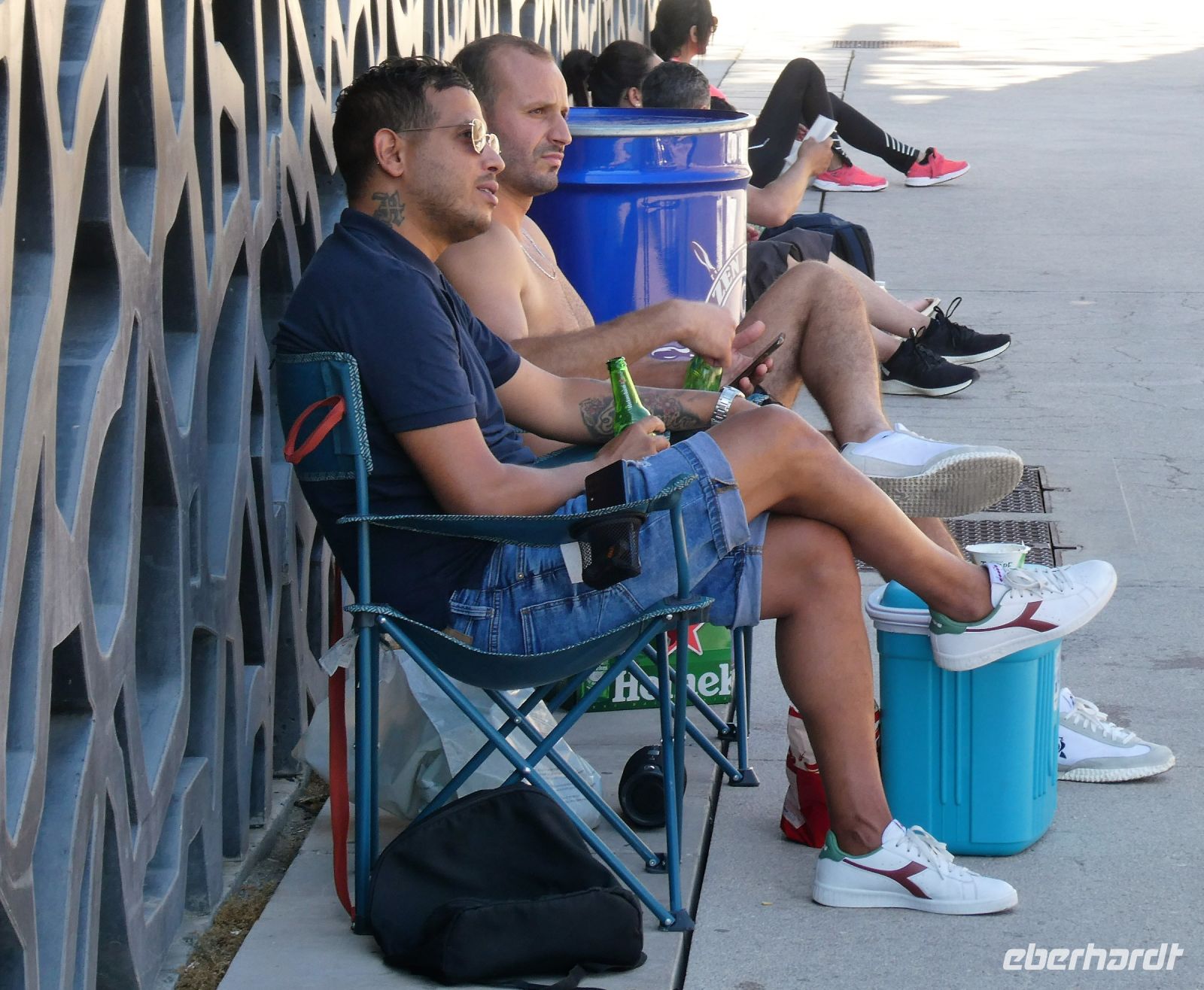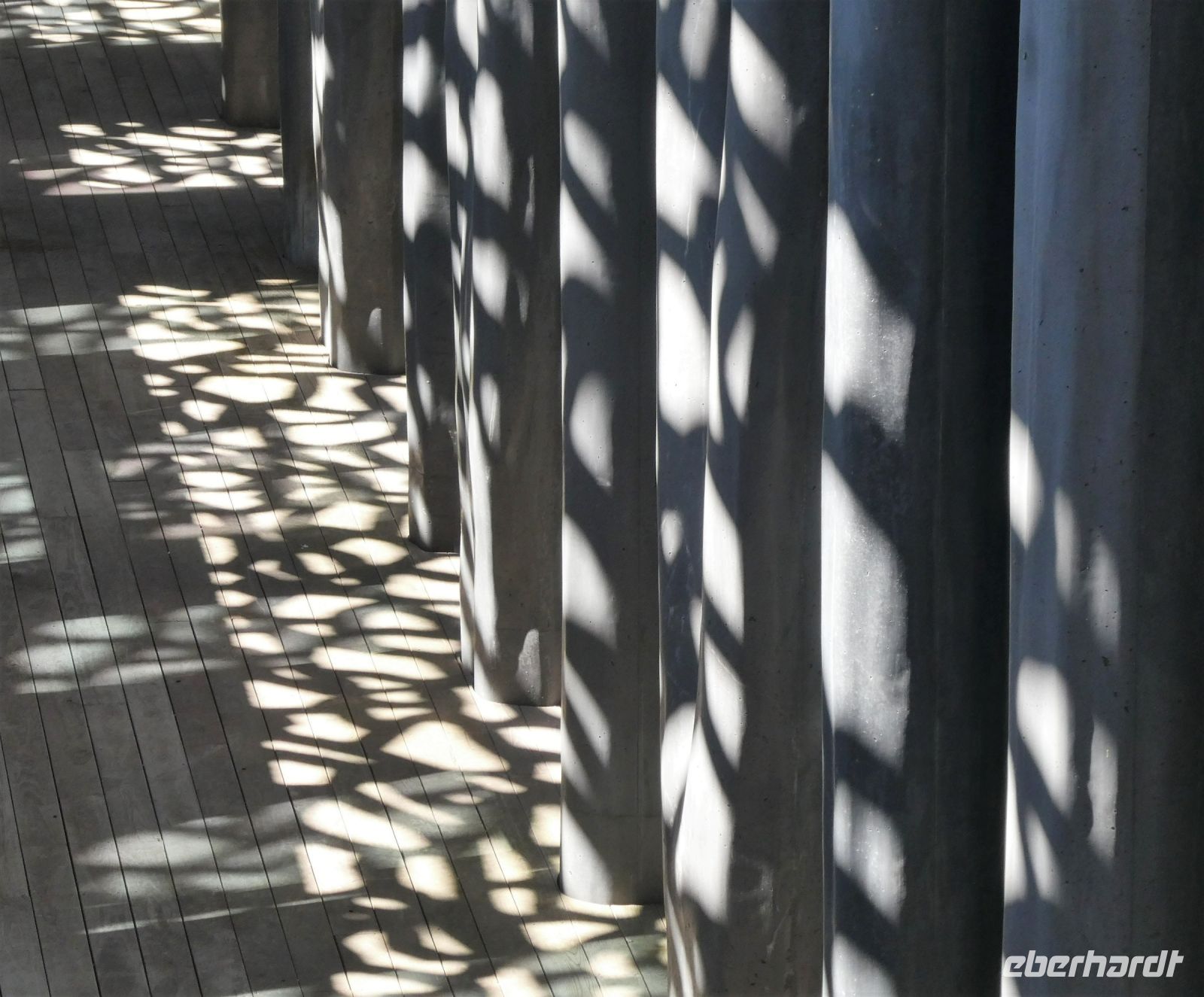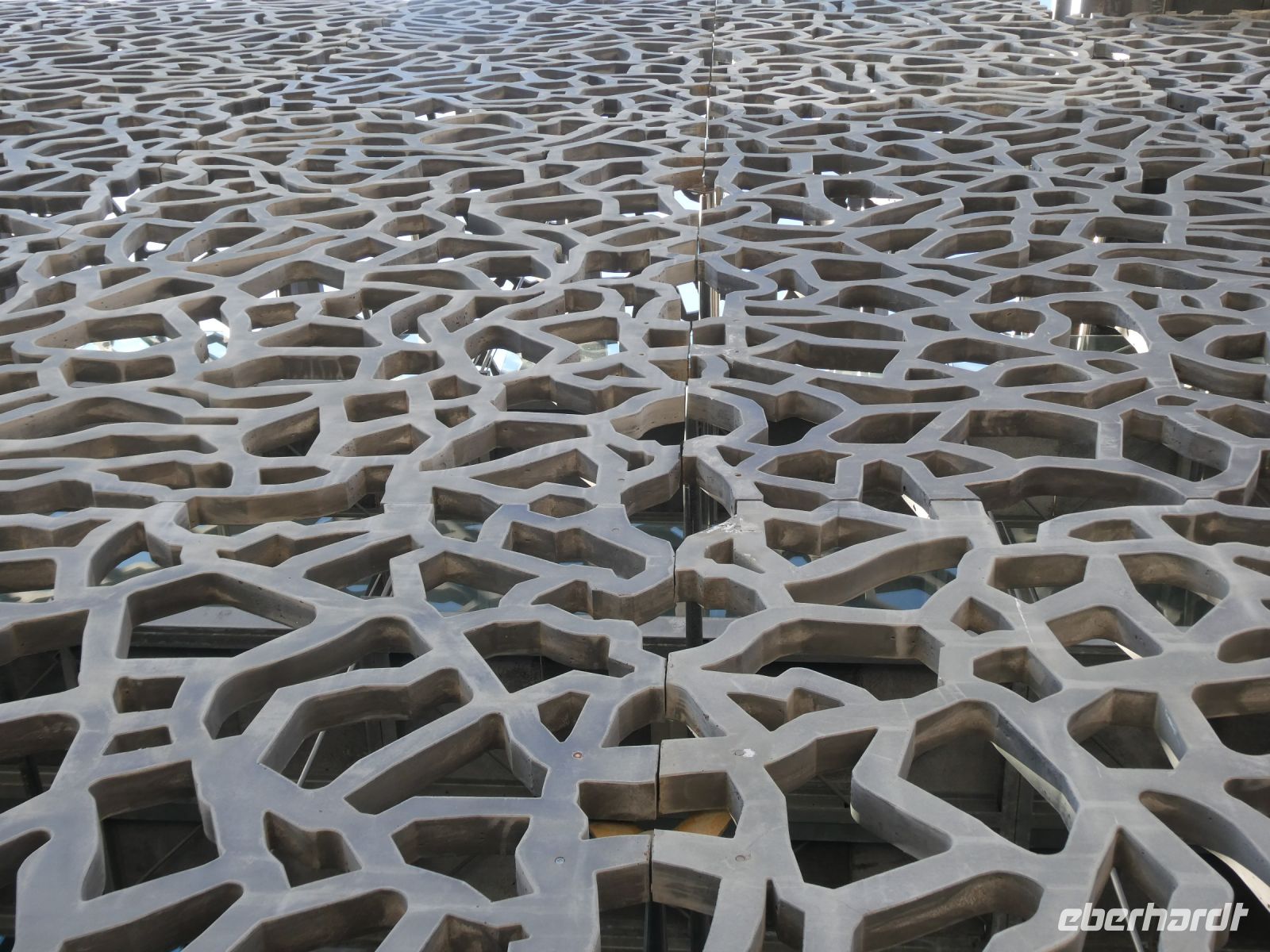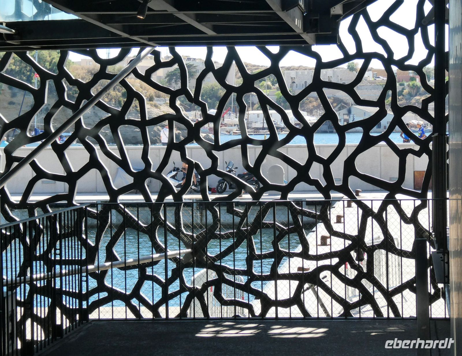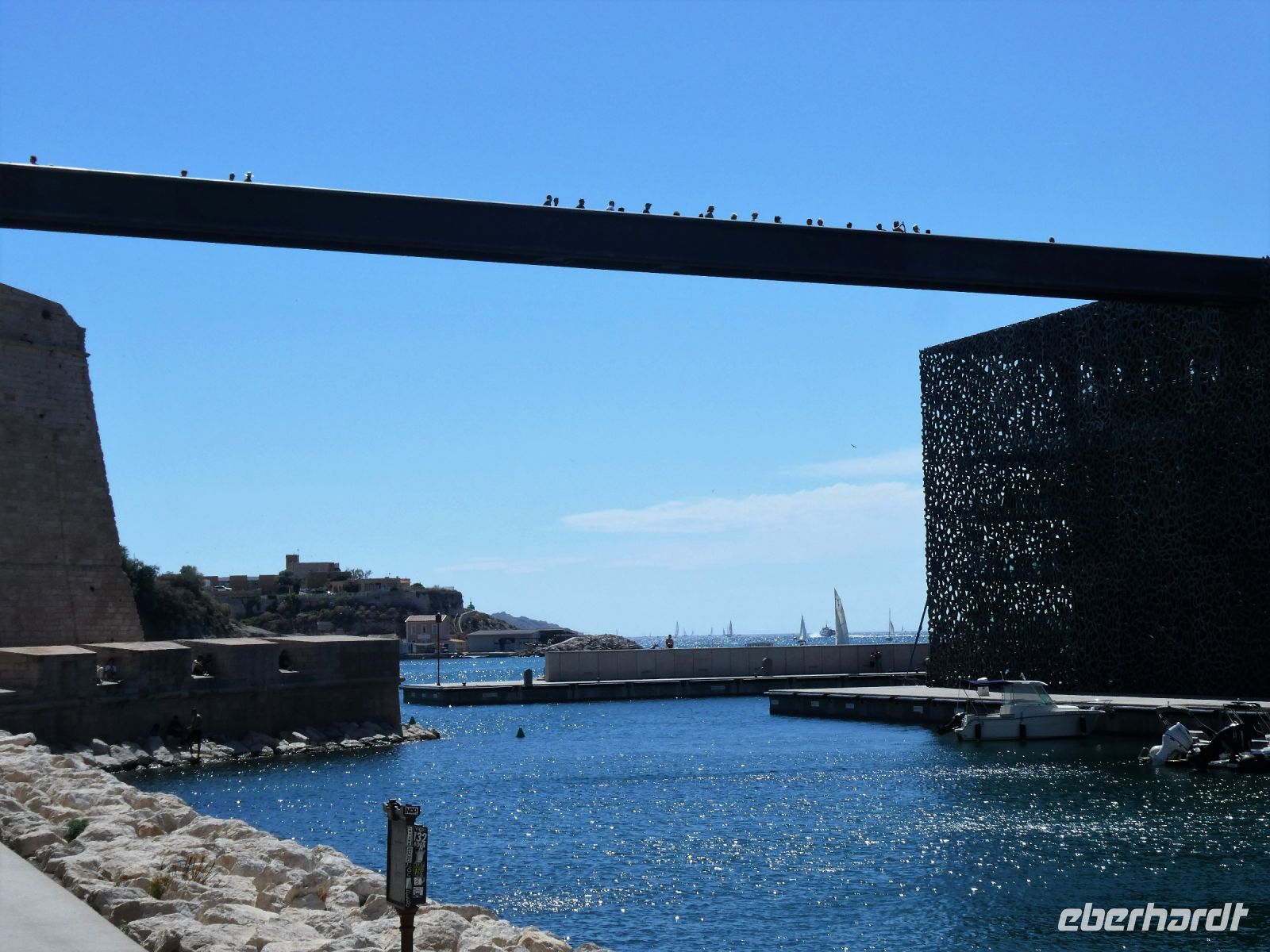Die Hitze treibt uns schnell wieder zu unserem Bus und wir fahren weiter in Richtung altem Hafen. Es wurde besprochen einen Rundgang am neu erbauten "Mucem" und dem daneben liegenden, scherzhaft von der Bevölkerung "Sprungbrett" genannte "Villa Méditerranée" zu machen. Sie befindet sich neben dem Museum der Zivilisationen Europas und des Mittelmeers. Nach mehrjähriger Schließung wurde sie im Juni diesen Jahres wiedereröffnet und enthält eine Nachbildung der "Henri-Cosquer-Höhle, welche schon erwähnt wurde (siehe oben). Schlangen warten an der Kasse um eingelassen zu werden. Wir spazieren immer im Schatten um das gesamte Areal und sind beeindruckt von der Verknüpfung von Alt und Neu. Alles ist Teil des "Projektes Euroméditerranée" und hat einiges an Geld gekostet.