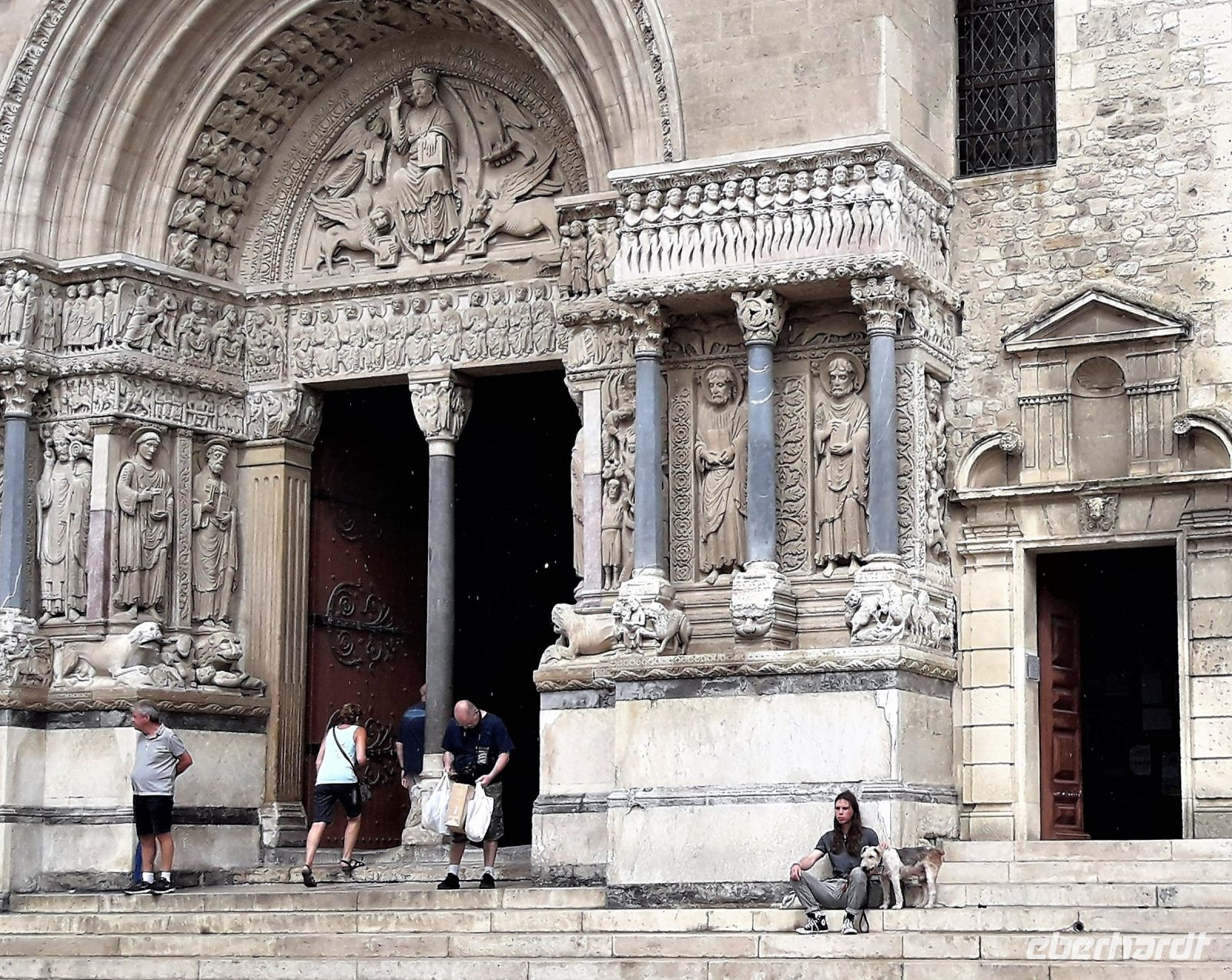 Wir wenden uns jetzt in Richtung Rathaus welches in der Barockzeit entstand. Wir laufen durch das Gebäude mit seinen Barockskulpturen und befinden uns plötzlich am Place de la République mit dem im Moment eingerüsteten römischen Obelisken aus dem 4.Jahrhundert der in der Mitte steht. Der ist aber nicht unser Ziel sondern die berühmteste Kirche von Arles, die Kirche des Heiligen Trophime der im 3.Jahrhundert das Evangelium nach Arles gebracht hat. Hier in der aus dem 12.Jahrhundert stammenden Kirche ist 1178 Kaiser Barbarossa zum König von Burgund gekrönt worden. Wir bewundern die schön gearbeitete Fassade die das Weltgericht zeigt und nehmen uns Zeit für eine Besichtigung der Kirche.